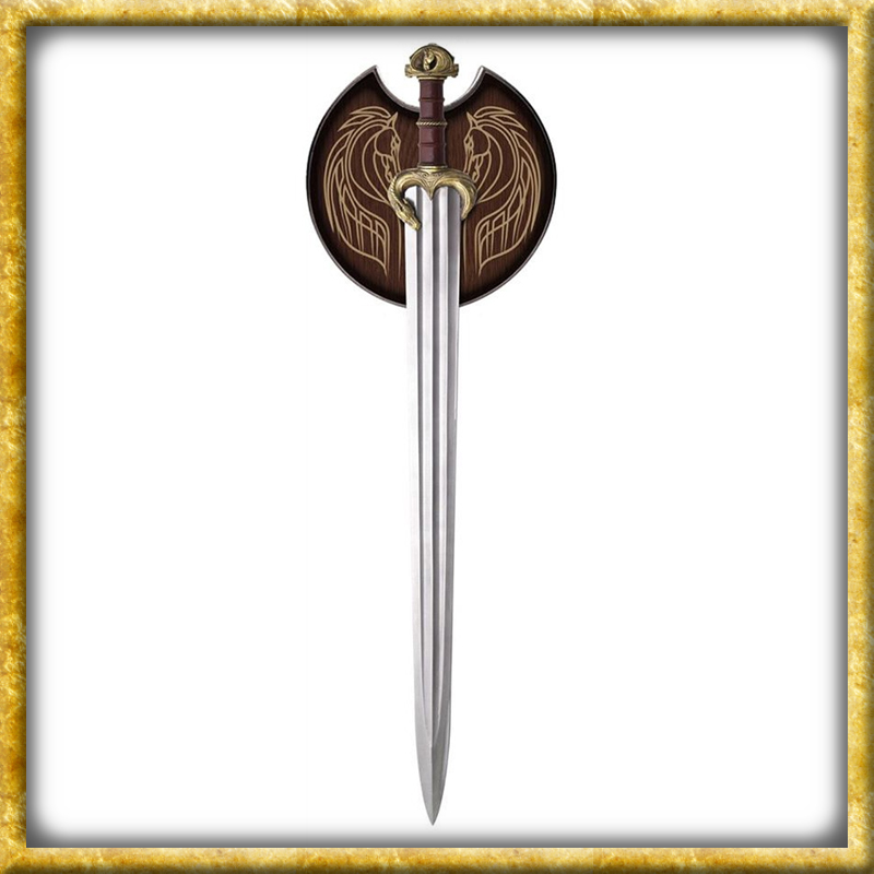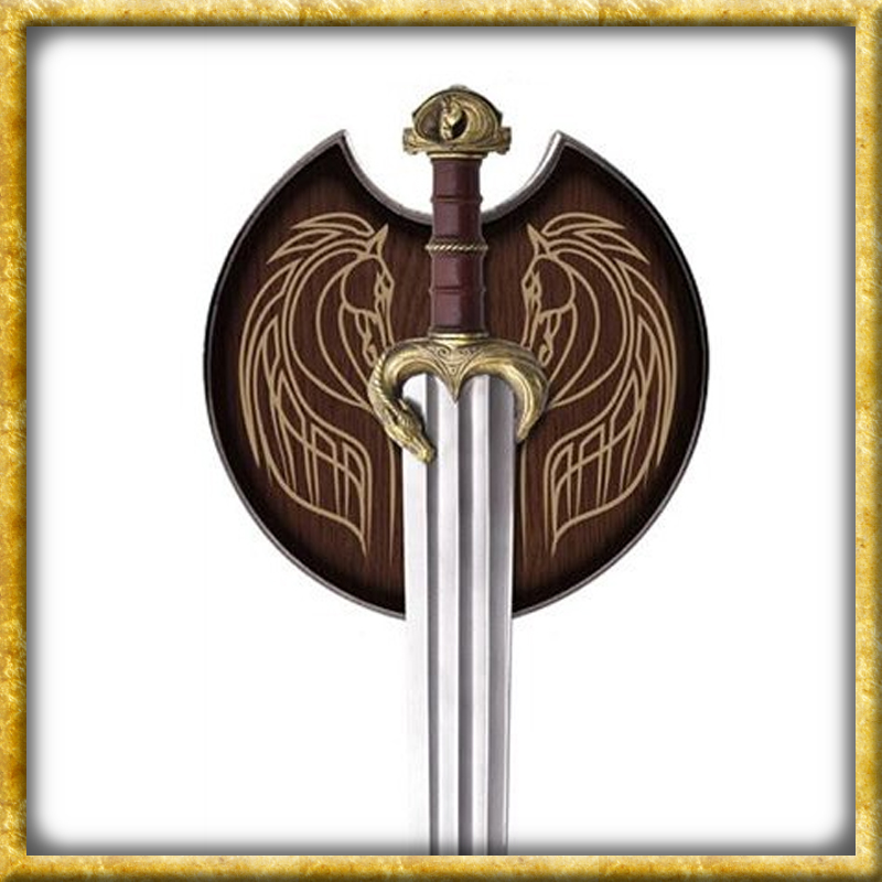 Original lizenzierte Replik des Schwert von Eomer aus Herr der Ringe. Bei diesem Schwert handelt es sich um ein originales Herr der Ringe Schwert, das von United Cutlery unter der Lizenz von New Line Cinema hergestellt wurde. Mitgeliefert wird eine schöne Wandtafel aus Holz.