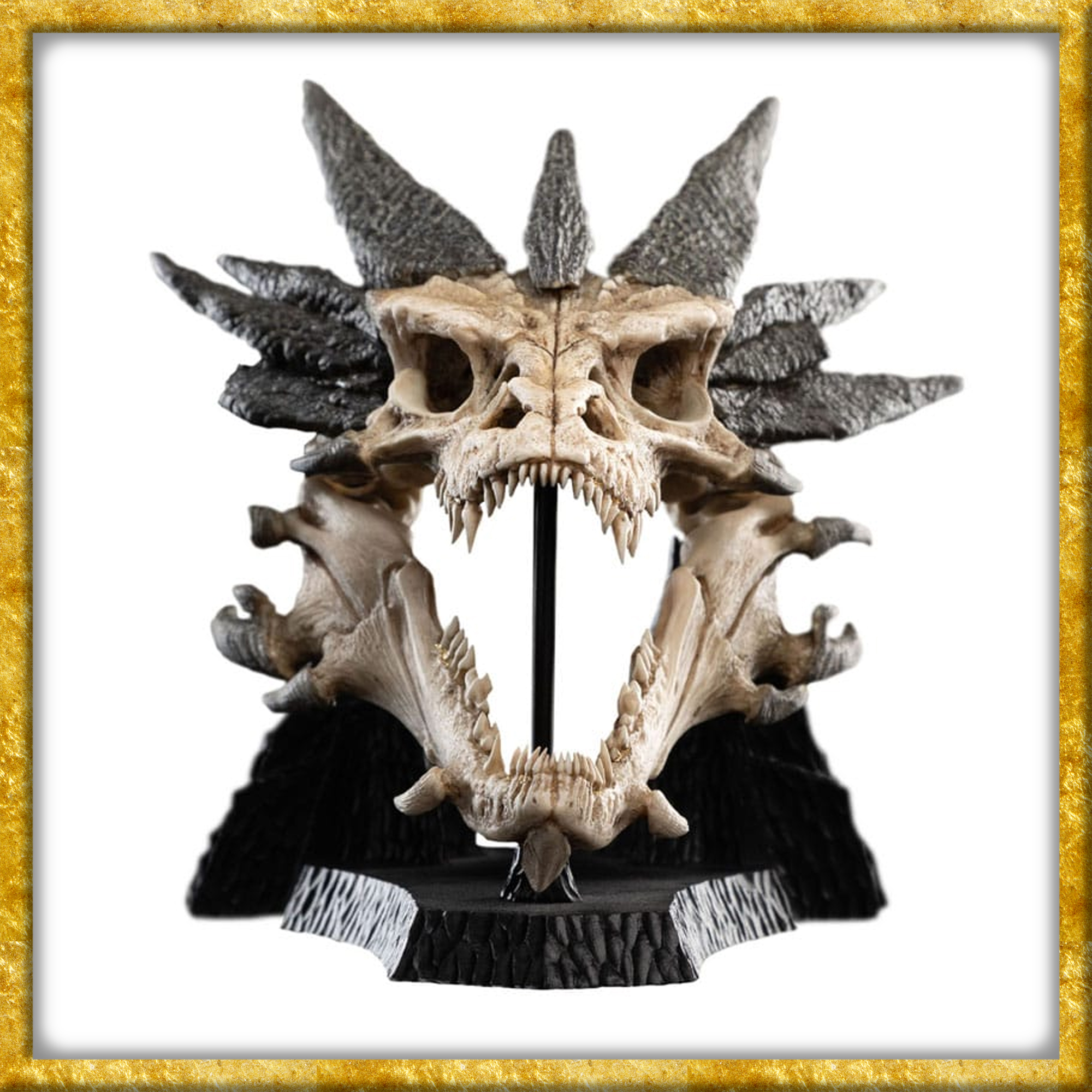 Aus Herr der Ringe erscheint diese detailreiche sowie qualitativ hochwertige Statue des Schädels von Smaug, dem letzten und grössten Feuerdrachen des Nordens, welche aus Polystone hergestellt wurde. Die Statue ist ungefähr 17cm x 22cm x 22cm gross. Dieses Exemplar kann mit geöffnetem Kiefer ausgestellt werden, um das Brüllen - welches den Einsamen Berg erschütterte - darzustellen oder geschlossen, um die bedrohliche Stimmung seines Ruhezustands einzufangen.