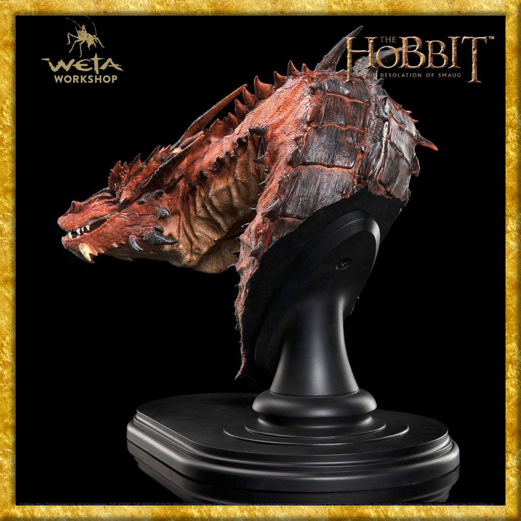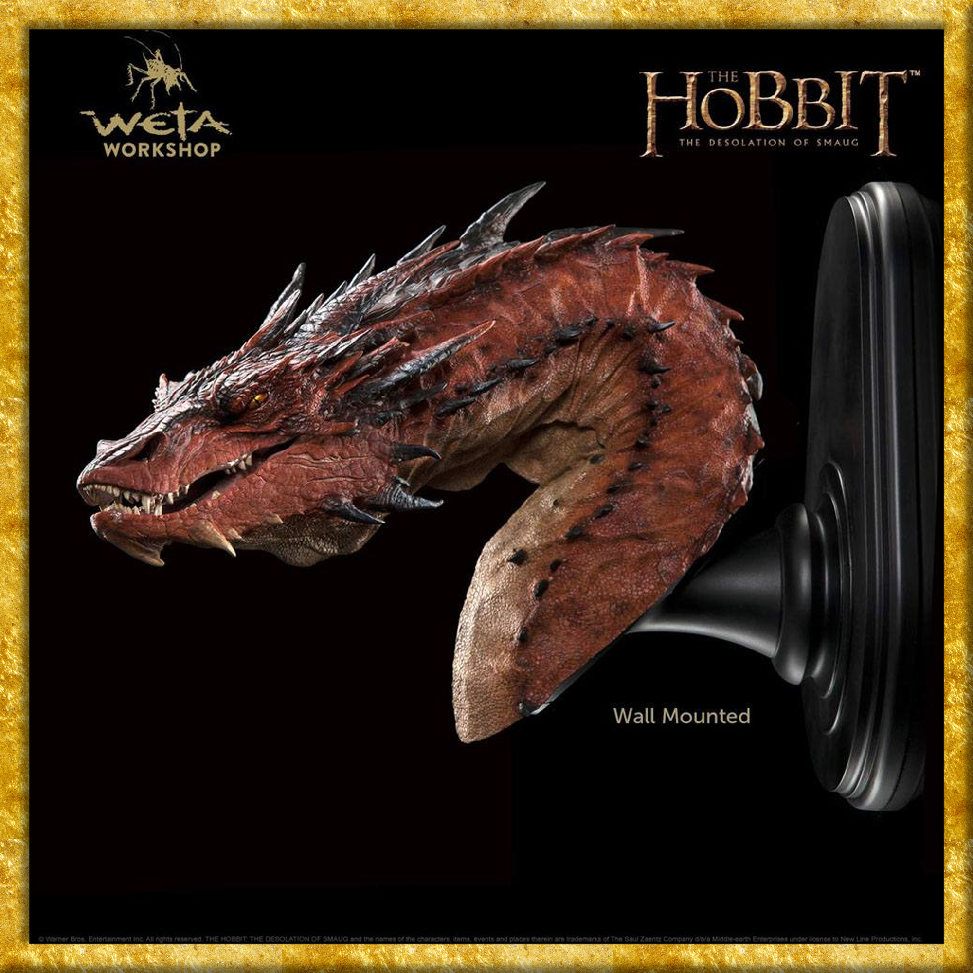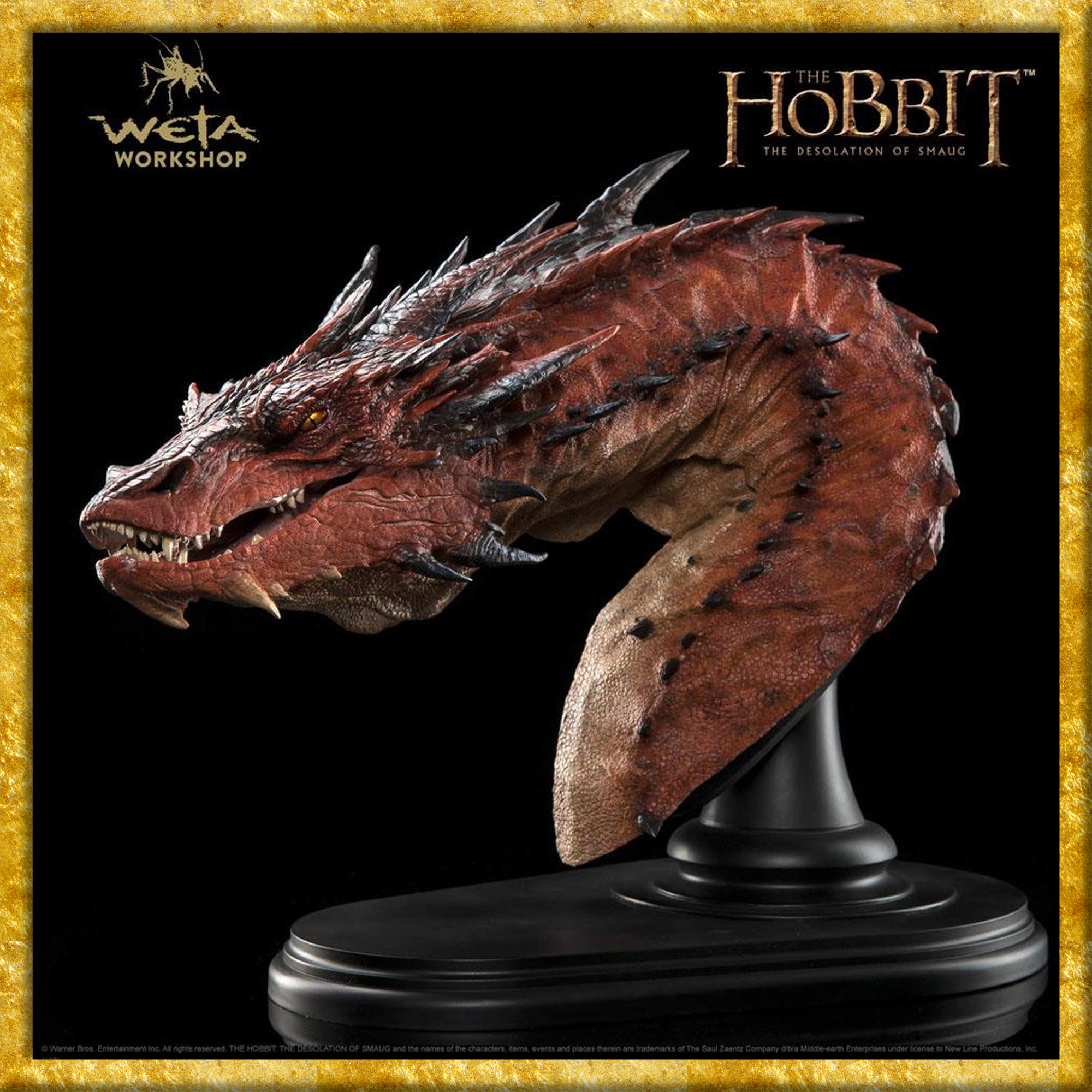 Diese detailreiche Büste des Drachens Smaug aus Der Hobbit von Weta Collectibles, ist aus qualitativ hochwertigem Resin gefertigt und misst ca. 46 x 36 x 24 cm. Sie wird styropor-geschützt im bedruckten Karton geliefert. Die Base ist zusätzlich als Wandhalterung verwendbar.