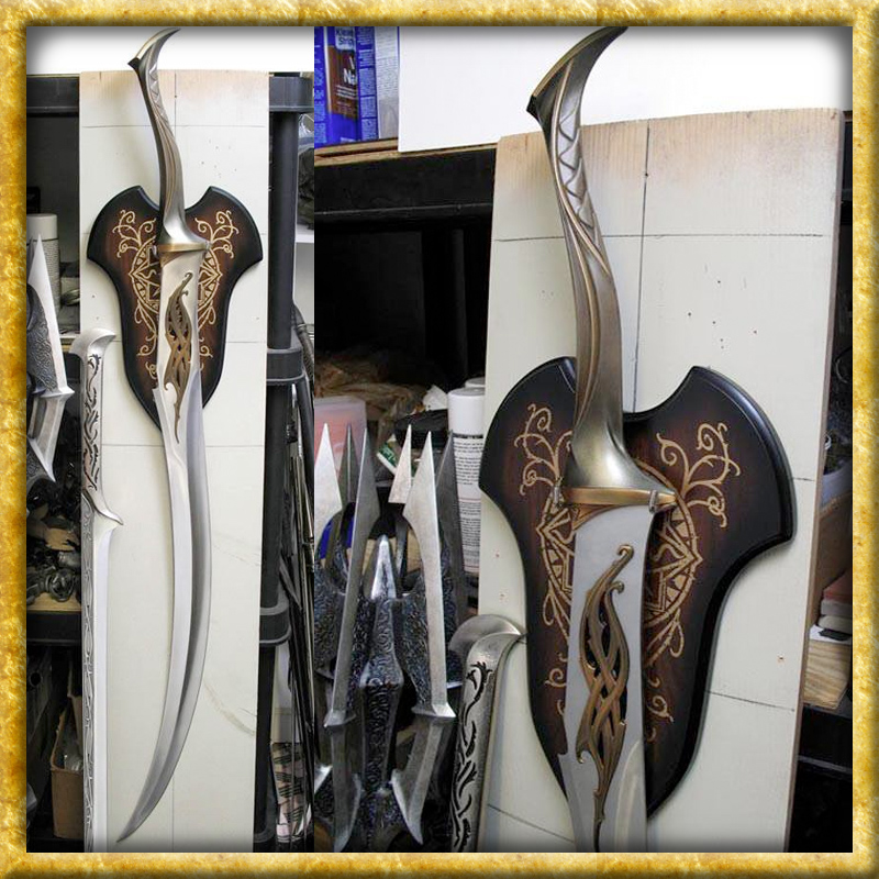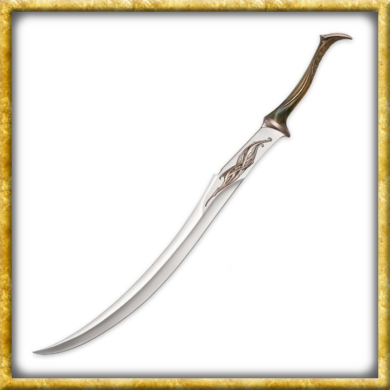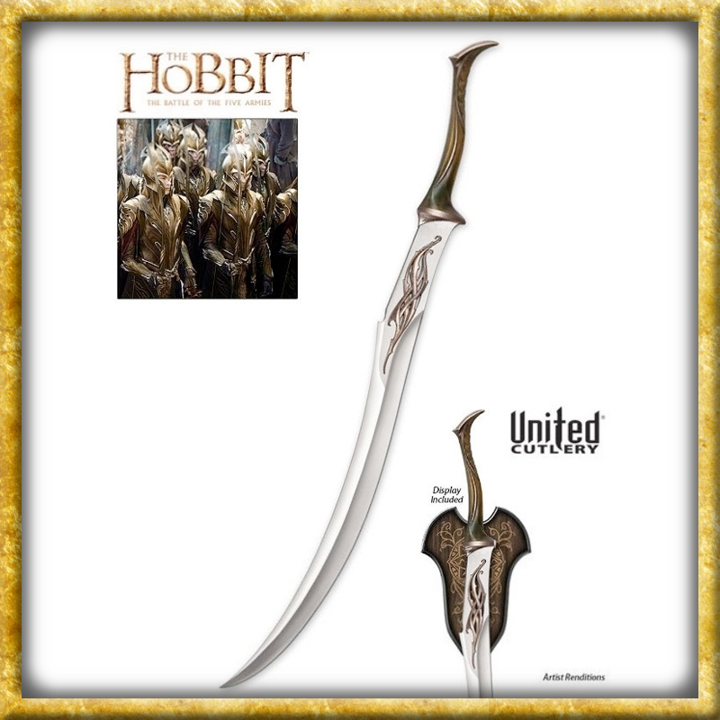 Hochwertige Replik eines Schwerts der Düsterwald Elbenkrieger aus dem Film Hobbit. Diese United Cutlery Sammler Replik wurde teilweise mit bronzenem Metalllook gefertigt. Die Klinge ist aus rostfreiem Stahl mit gravierten Ornamenten. Es wird mit einem hölzernen und mit Waldelben Runen verzierten Wandhalter geliefert. Selbstverständlich ist auch ein Echtheitszertifikat beinhaltet.