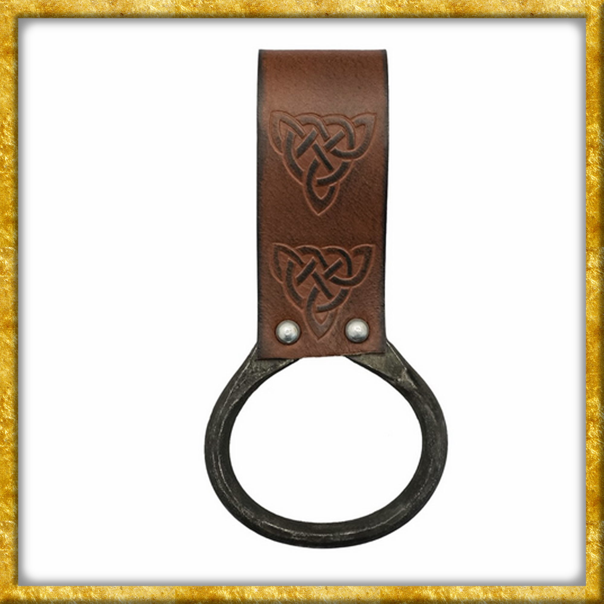 Dieser praktische Axtgürtelhalter verfügt über einen geschmiedetem Ring und ist mit keltischen Knoten verziert. Der Axthalter ist aus echtem Leder gefertigt und der Ring ist vernietet und misst 6cm im Durchmesser.