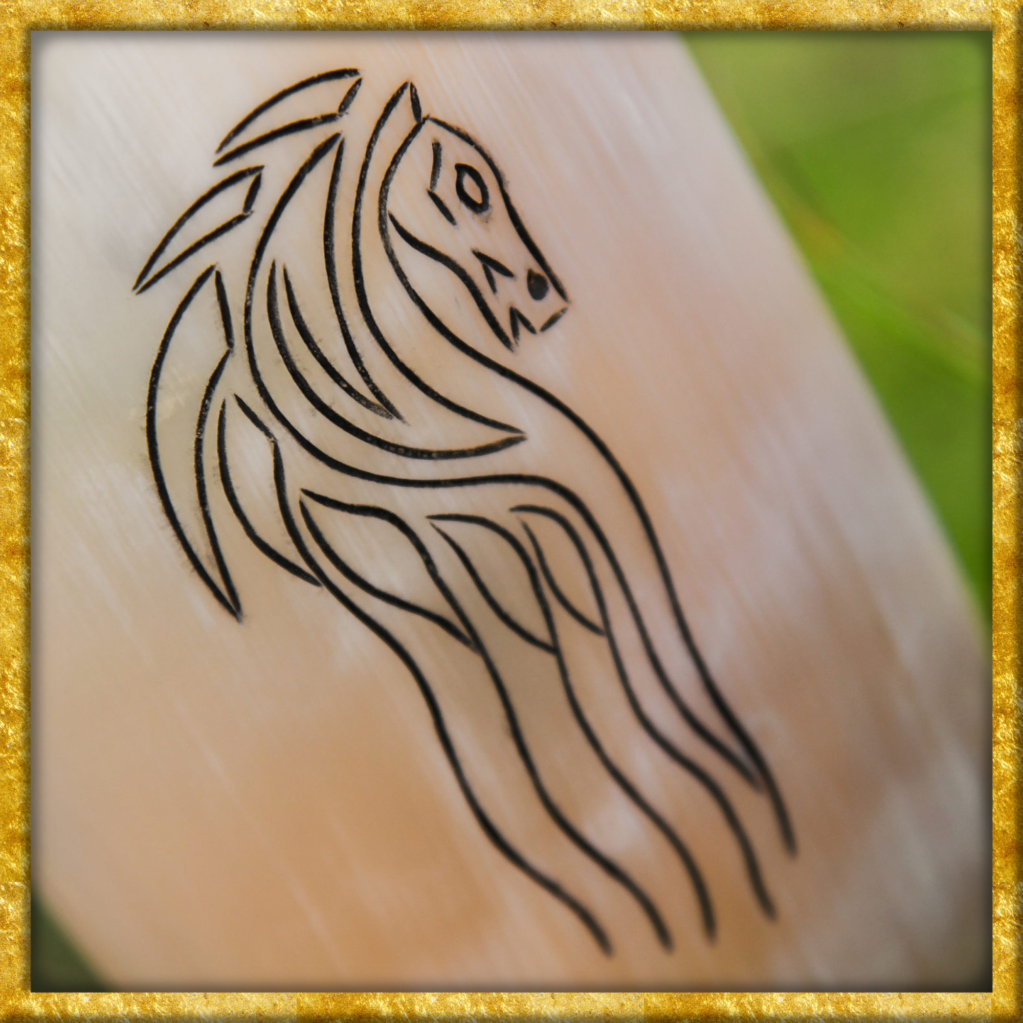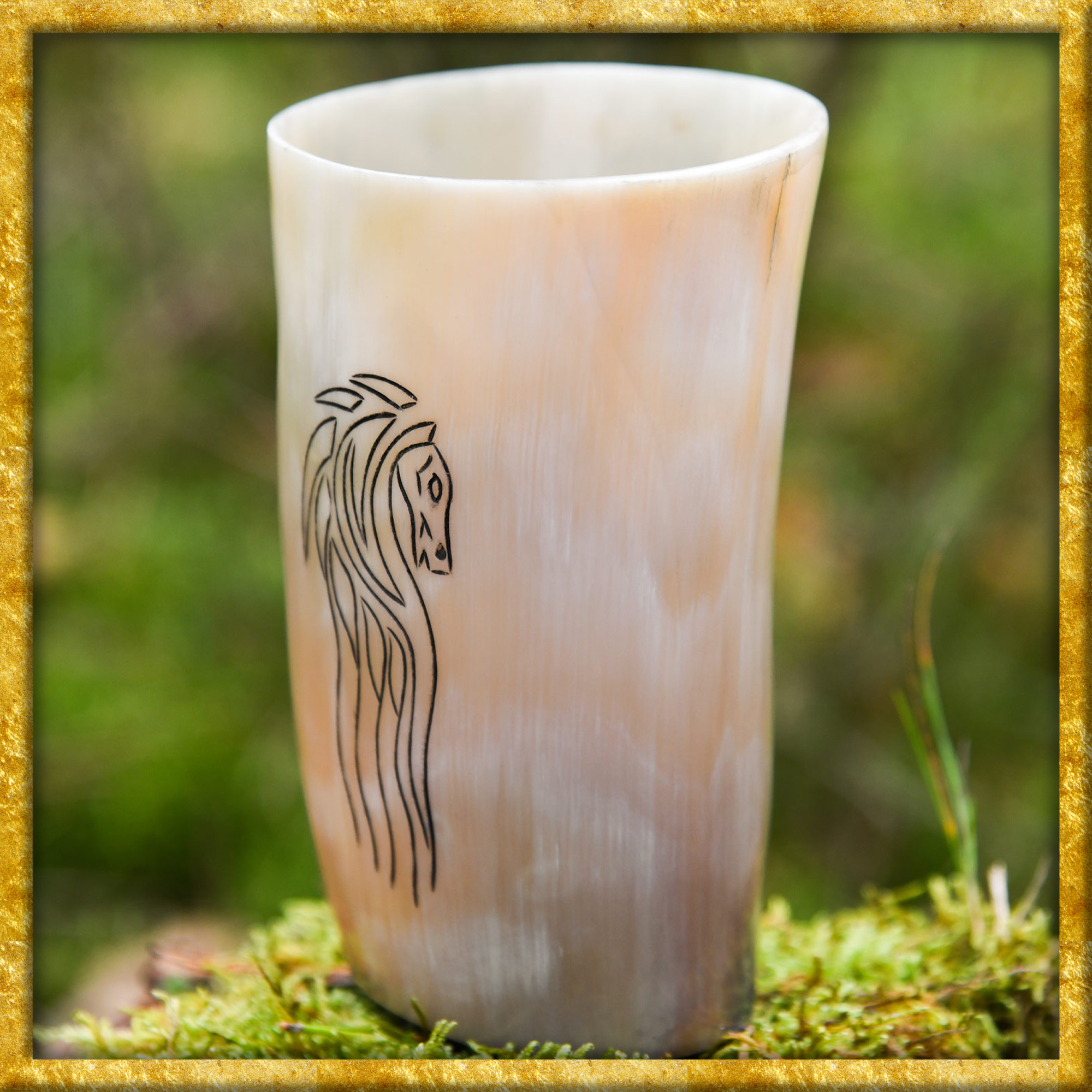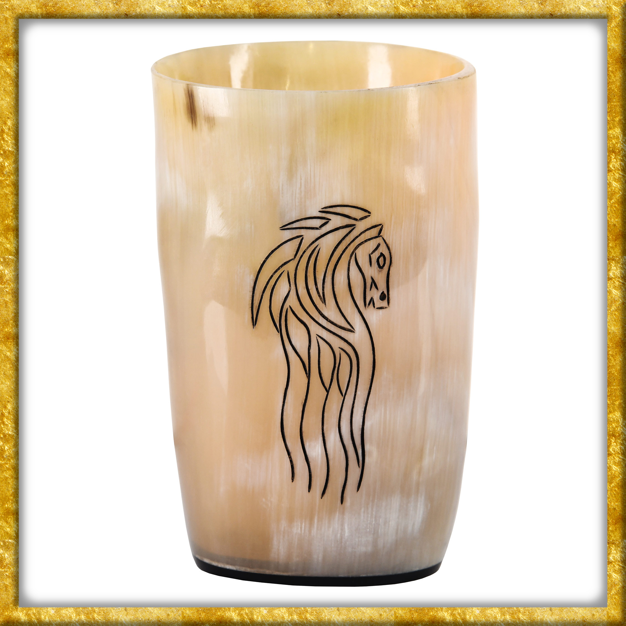 Dieser kleine Becher ohne Henkel wird aus Rinderhorn in Handarbeit gefertigt, poliert, und mit einem eingravierten Symbol der Reiter Rohans, der Pferdeherre oder auch Rohirrim genannt, verziert. Das Volumen variiert zwischen 150 - 250ml.
