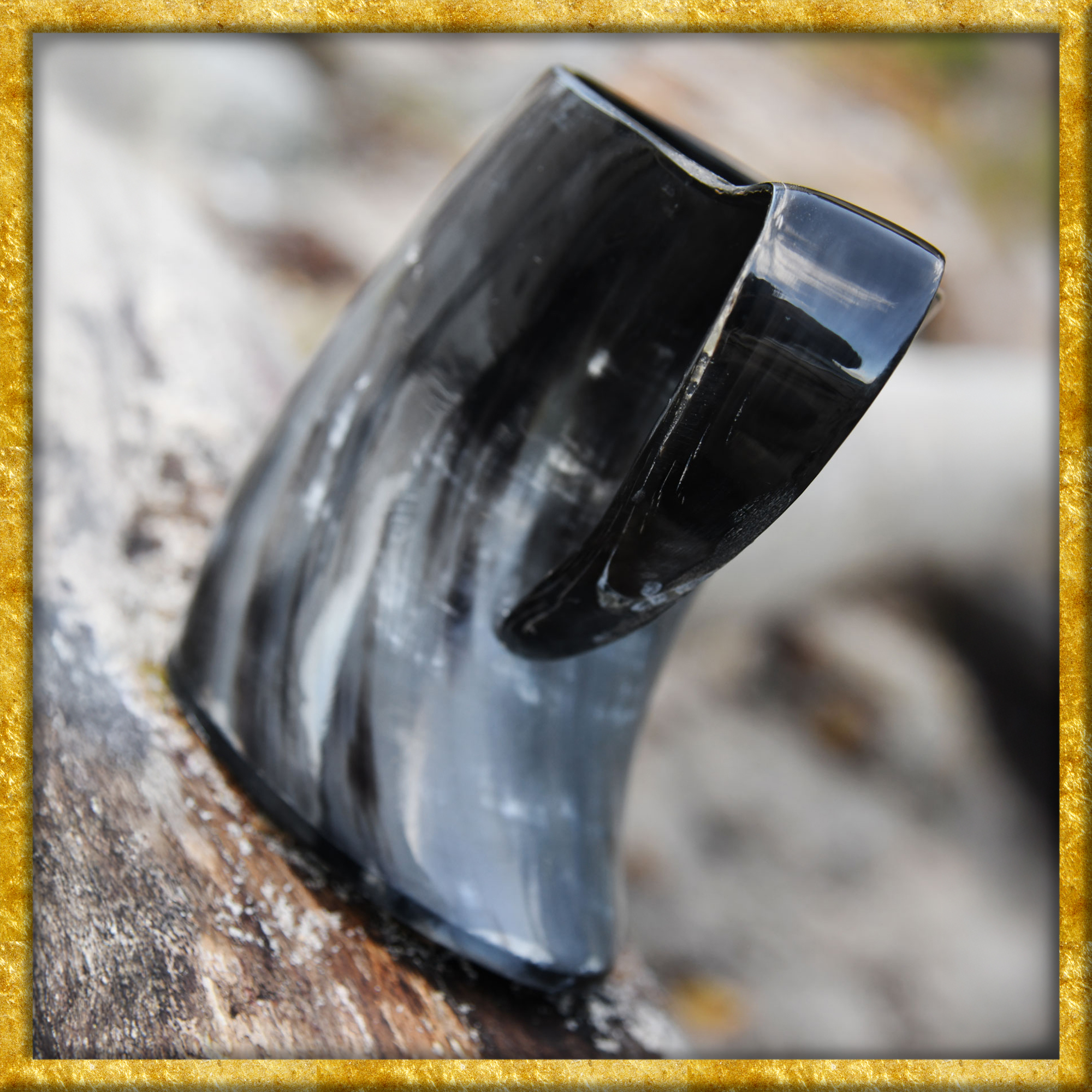 Dieser grosszügig bemessene Henkelbecher oder Humpen wird aus Rinderhorn in Handarbeit gefertigt, poliert, und mit einem eingravierten Drachen, einem beliebten Motiv der Wikingerkunst, verziert. Der Hornkrug ist aus hygienischen Gründen von innen lebensmittelecht lackiert.