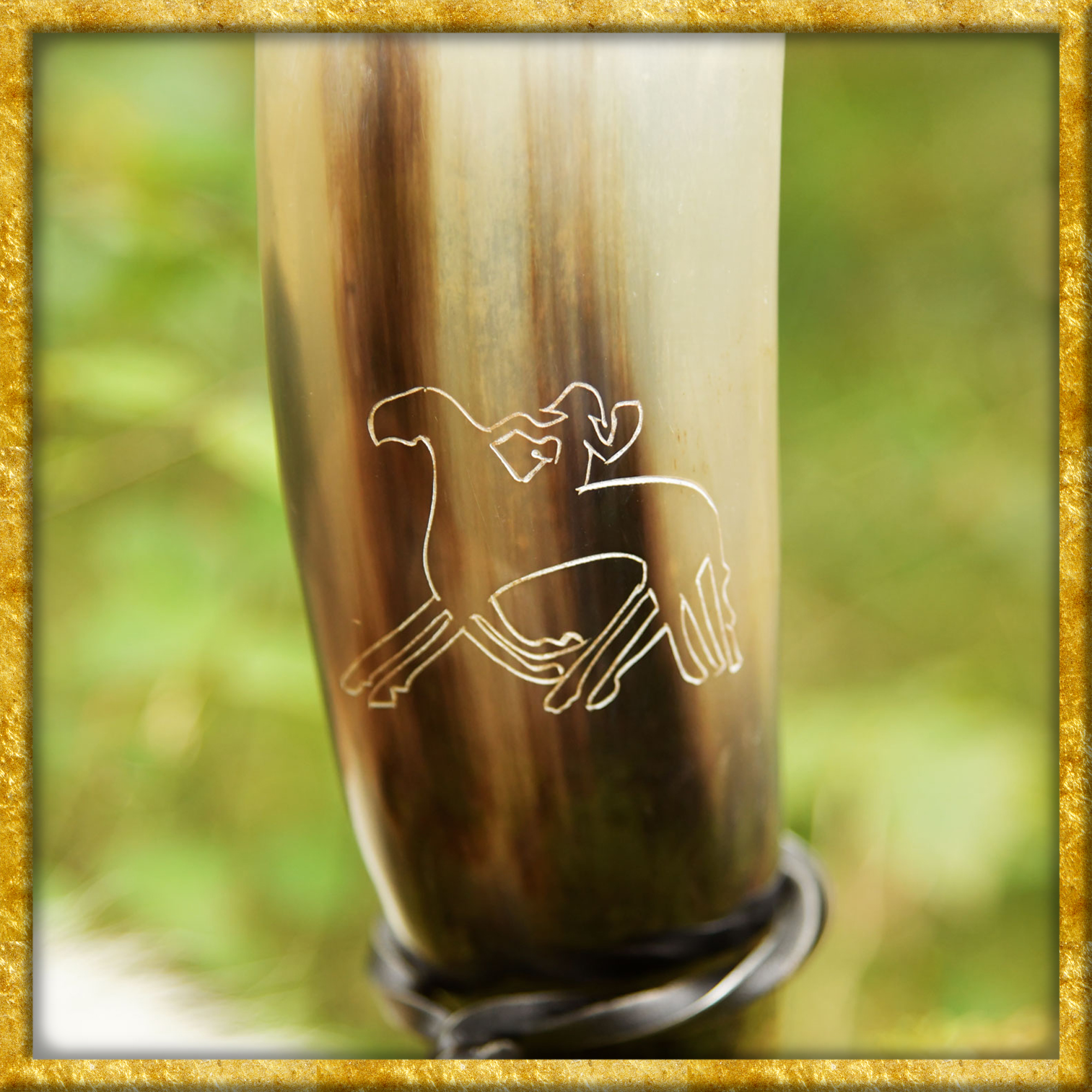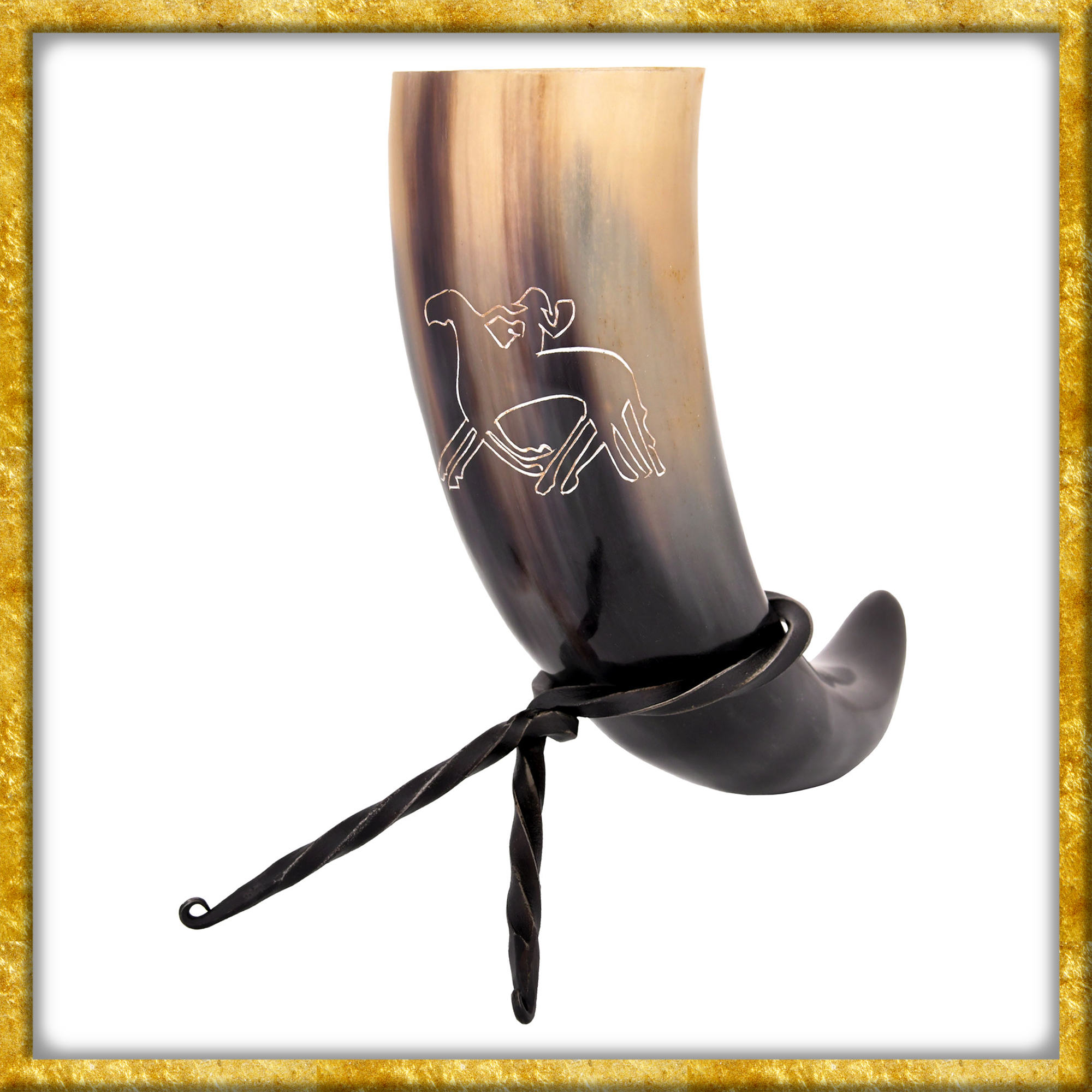 Dieses verzierte Trinkhorn ist aus Rinderhorn in Handarbeit gefertigt, poliert, und mit einem eingravierten Motiv von Odin auf seinem sagenumwobenen, achtbeinigen Pferd Sleipnir verziert. Ob im modernen Zuhause oder für Reenactment-Zwecke in einer Mittelalter- oder Wikingerzeit-Kulisse, dieses rustikale, sehr dekorative Trinkgefäss ist ein echter Hingucker auf jedem Esstisch.