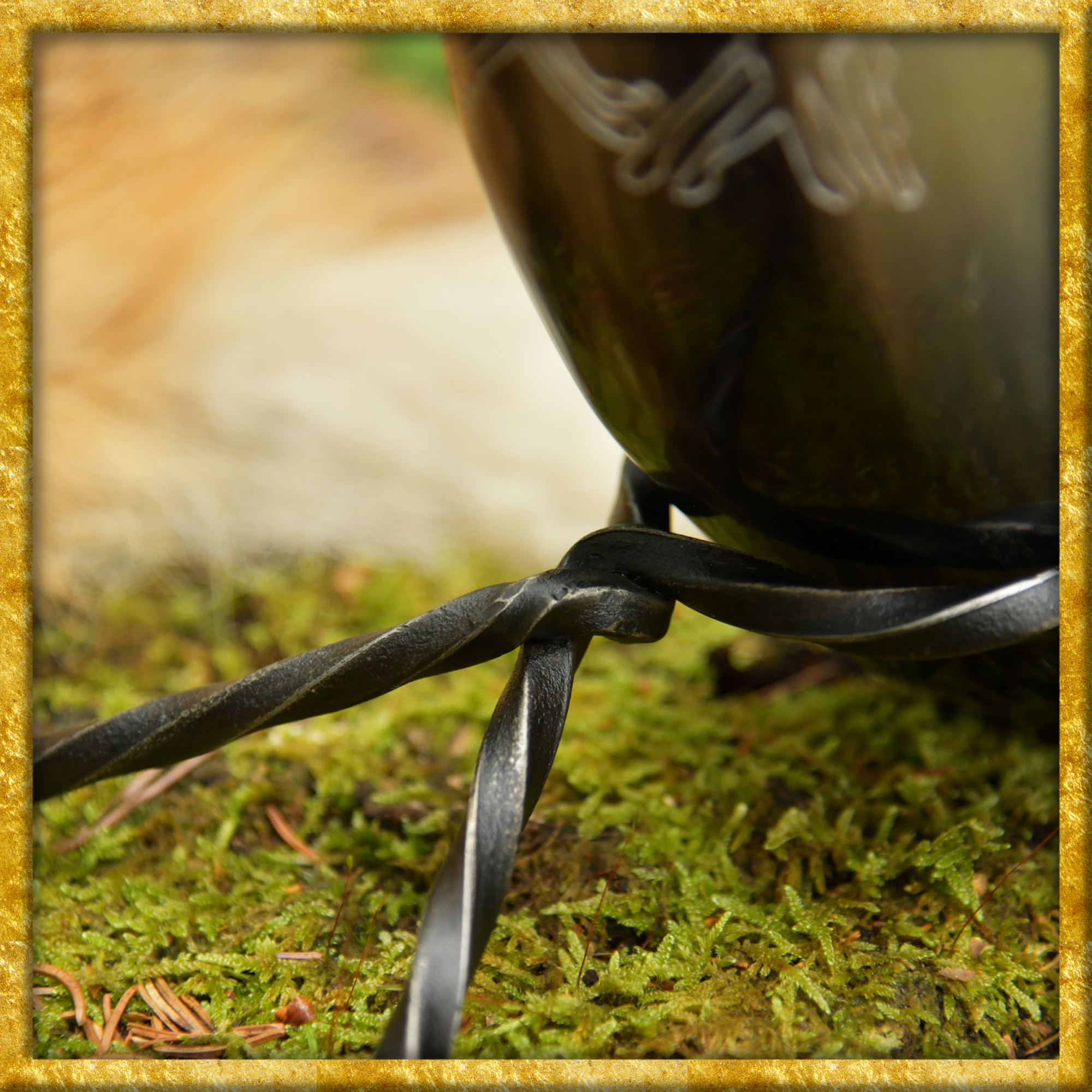 Zum Lieferumfang gehört ein praktischer, gut transportabler Trinkhornständer aus handgeschmiedetem Stahl mit einfachem Prinzip: Steckt man das Horn durch die Öffnung, bilden die Beine des Ständers und die Hornspitze ein standsicheres Dreibein. So kannst Du Dein Trinkhorn immer sicher abstellen.