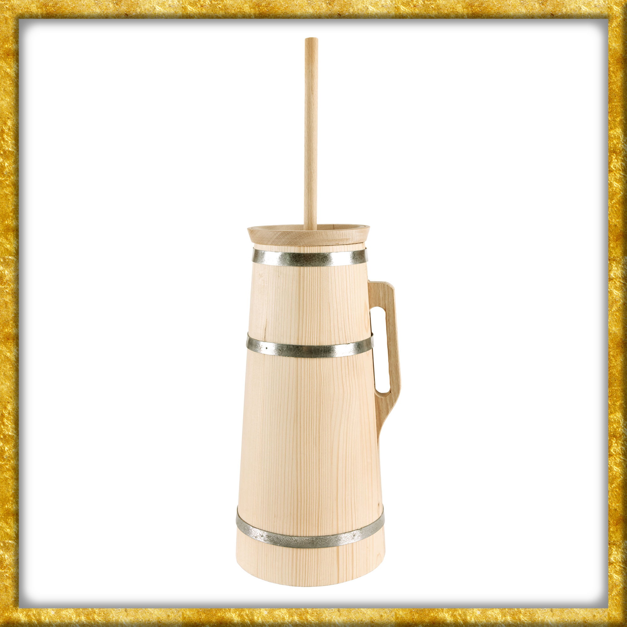 Dieses dekorative und zugleich benutzbare Butterfass ist aus massivem Fichtenholz. Drei Stahlstreifen an dem Körper des Fasses sorgen für einen guten zusammen Halt, so dass auch das stärkste Stampfen kein Problem mehr ist. Alle drei im Lieferumfang enthaltenden Teile des Artikels sind unabhängig voneinander, was bedeutet, dass auch das Saubermachen nach dem Buttern kein Problem ist. Die Fasshöhe innen beträgt ca. 40cm.