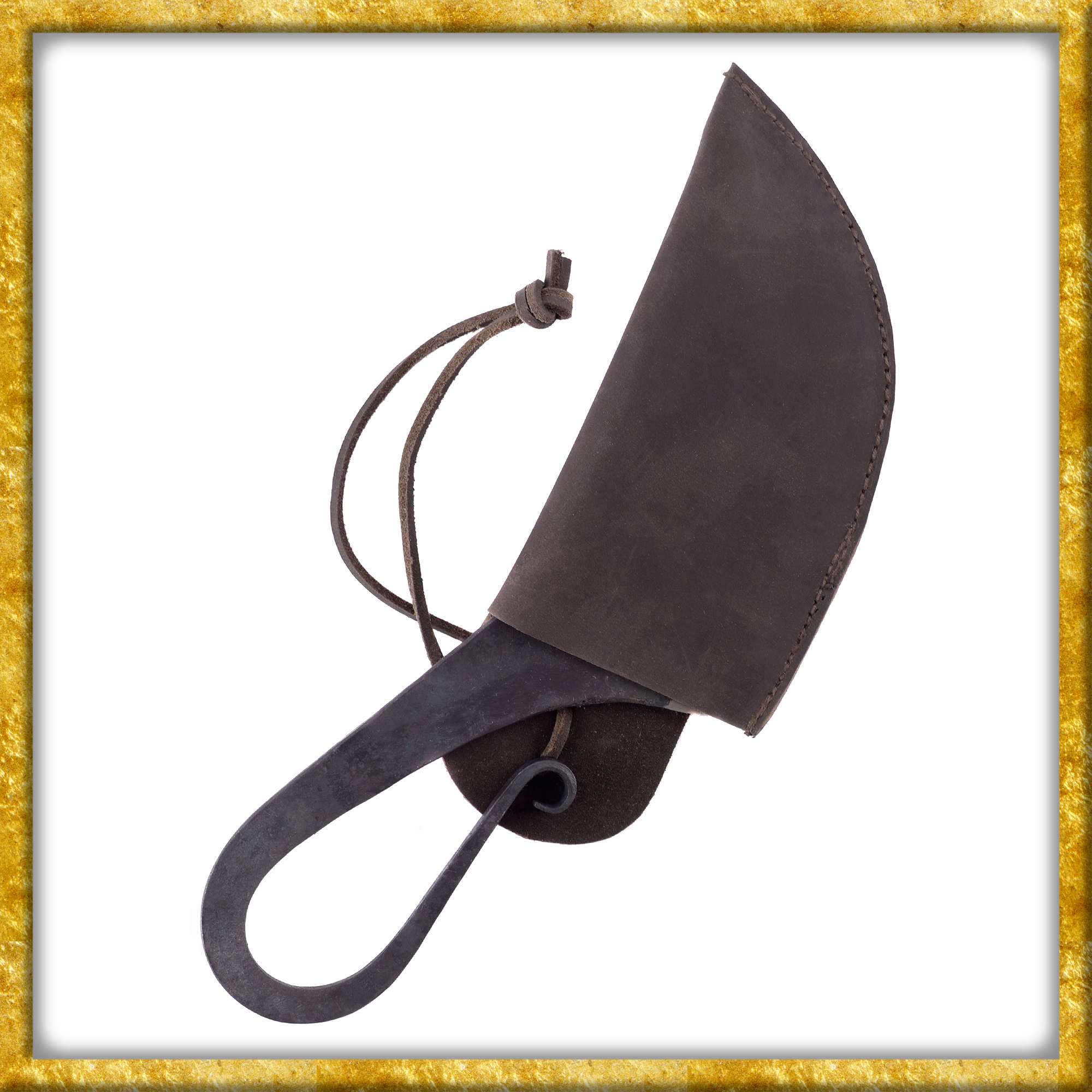 Dieses mittelalterliche Gebrauchsmesser ist handgeschmiedet aus Kohlenstoffstahl. Im Lieferumfang enthalten ist eine Scheide aus braunem Wildleder inkl. einer Befestigungsschlaufe.