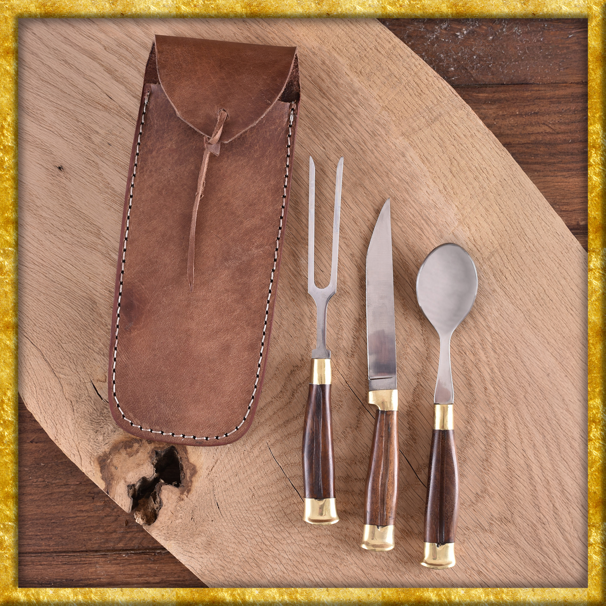 Dieses mittelalterliche Besteck besteht aus Gabel, Messer und Löffel, die aus rostfreiem Edelstahl gefertigt sind und somit für den direkten Kontakt mit Lebensmitteln geeignet. Dieses Besteck kommt mit einer authentischen Lederscheide.
