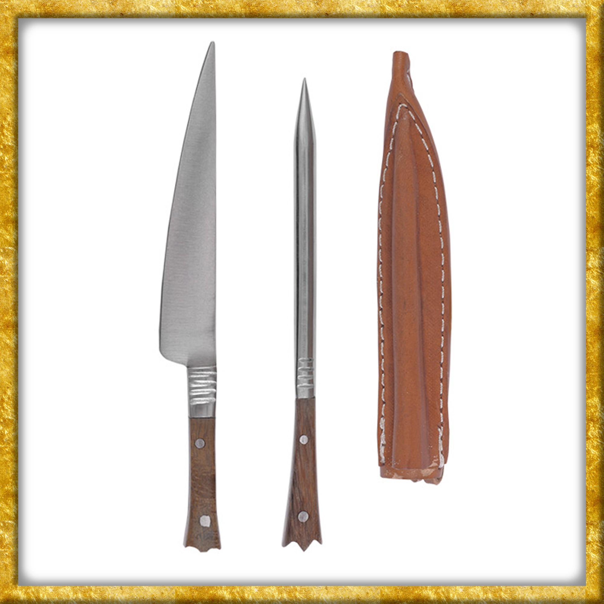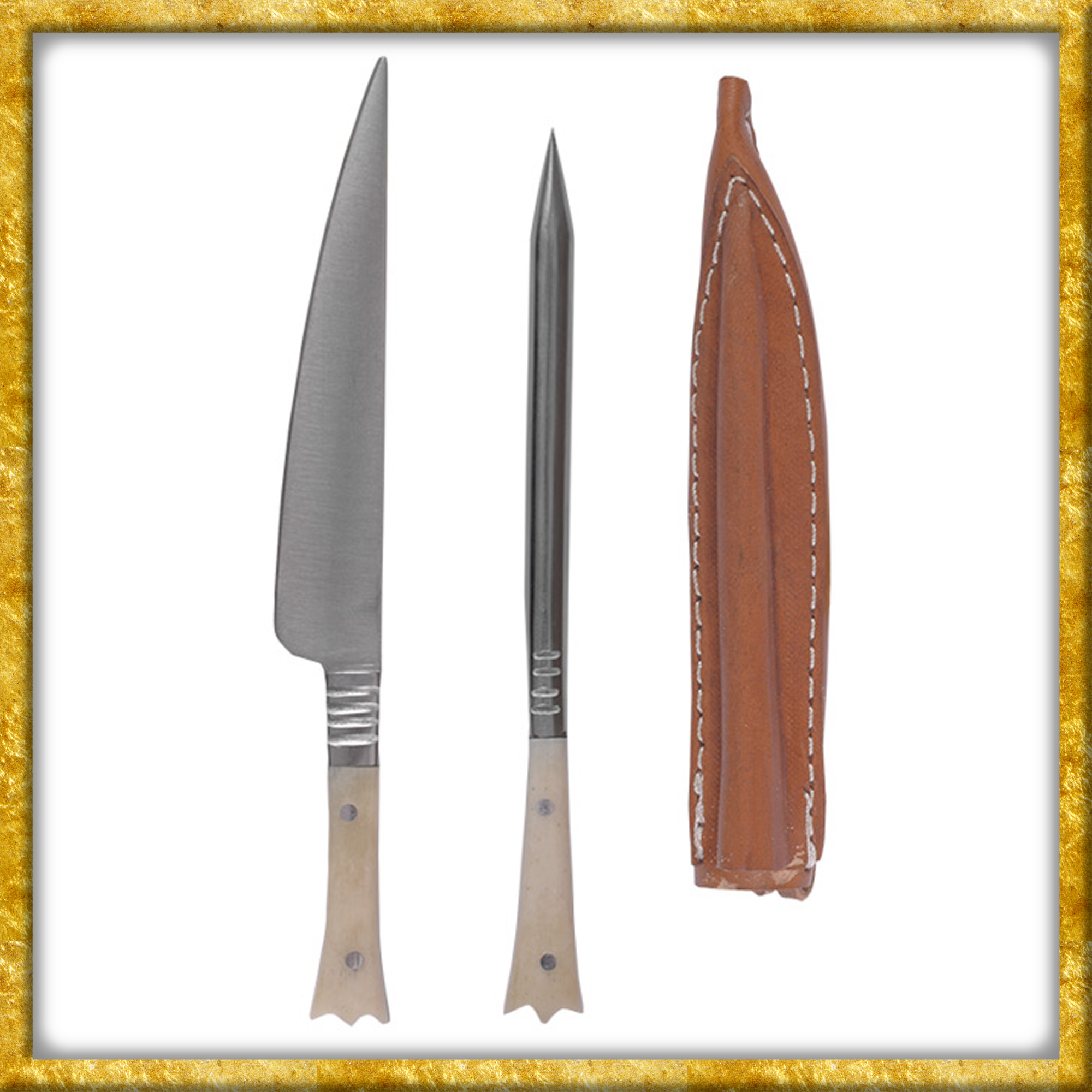 Dieses mittelalterliche Essbesteck besteht aus einem Messer und einem Essdorn, auch Pfriem genannt. Die Länge des Messer beträgt 14,5cm und die des Essdorns 13,5cm. Bei den Griffmaterialien kann man zwischen Holz, Horn und Knochen auswählen. Jedes Besteck kommt mit einer authentischen Lederscheide.