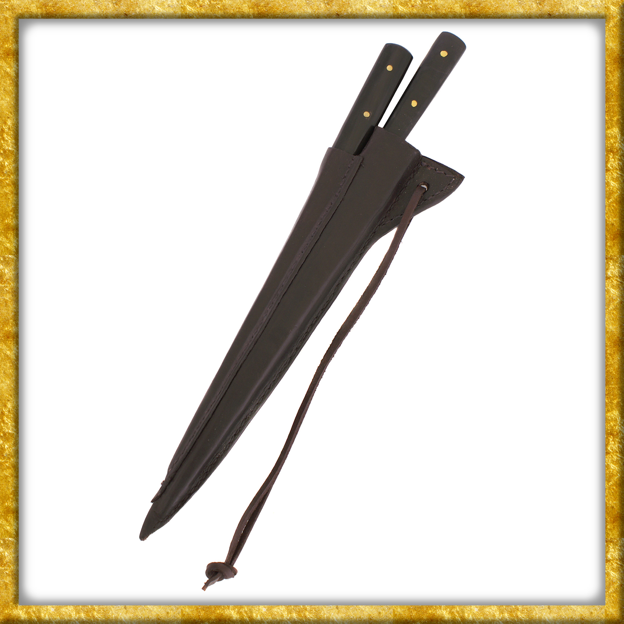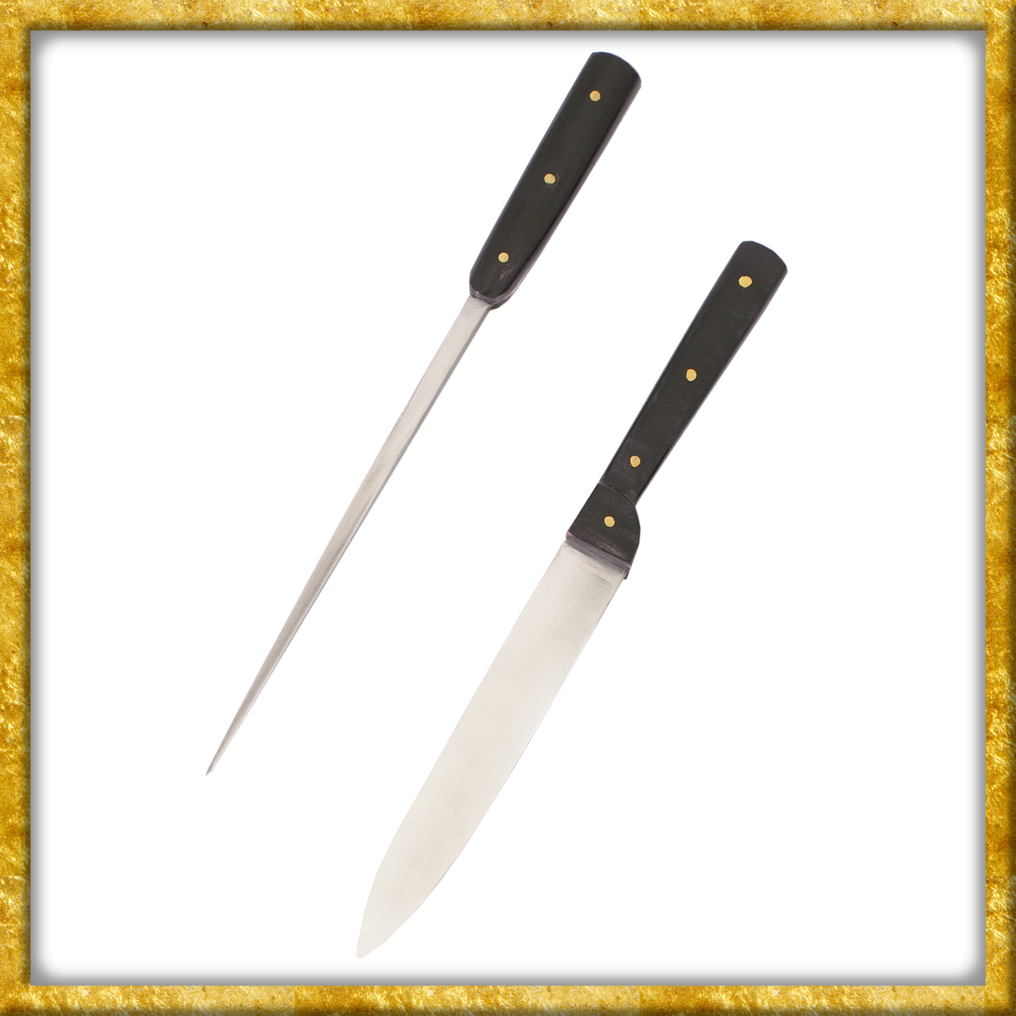Dieser mittelalterliche Besteckset ist authentisch, praktisch, gut! Das Set besteht aus einem Tafelmesser mit Essdorn, auch Pfriem genannt. Die 22cm lange Klinge ist aus rostfreiem Stahl gefertigt. Sie ist nicht sehr scharf geschliffen, ungefähr wie ein Besteckmesser. Es lässt sich jedoch natürlich leicht schärfen. Der Griff besteht aus Hornplatten, welche mittels Messingnieten befestigt sind.