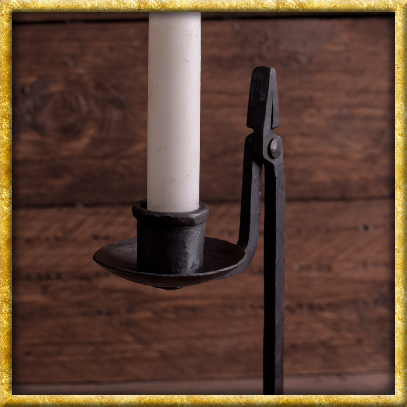 Dieser nach historischen Vorlagen von Hand geschmiedete Kienspanhalter verfügt über Standfüsse. Er ist kombiniert mit einer Kerzenhülle. Der Span wird einfach in das Maul der Zange geklemmt. Je nach Neigungswinkel brennt er heller und schneller oder weniger hell, aber dafür länger.