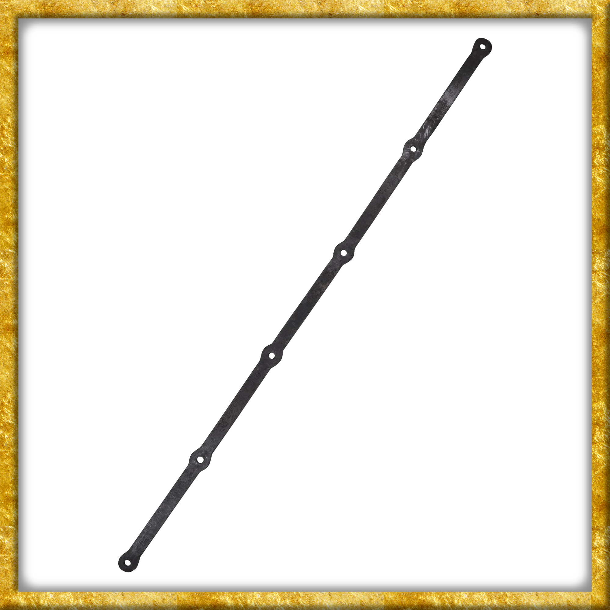 Diese robuste, ca. 150cm lange und 1cm starke Flachstange aus Stahl ist von Hand geschmiedet und mit 6 Löchern mit einem Innendurchmesser von ca. 1,4cm ausgestattet. Ihre Breite beträgt ca. 3 cm. Die Oberfläche ist unbehandelt, um den rustikalen, authentischen Charakter der Stange zu erhalten.