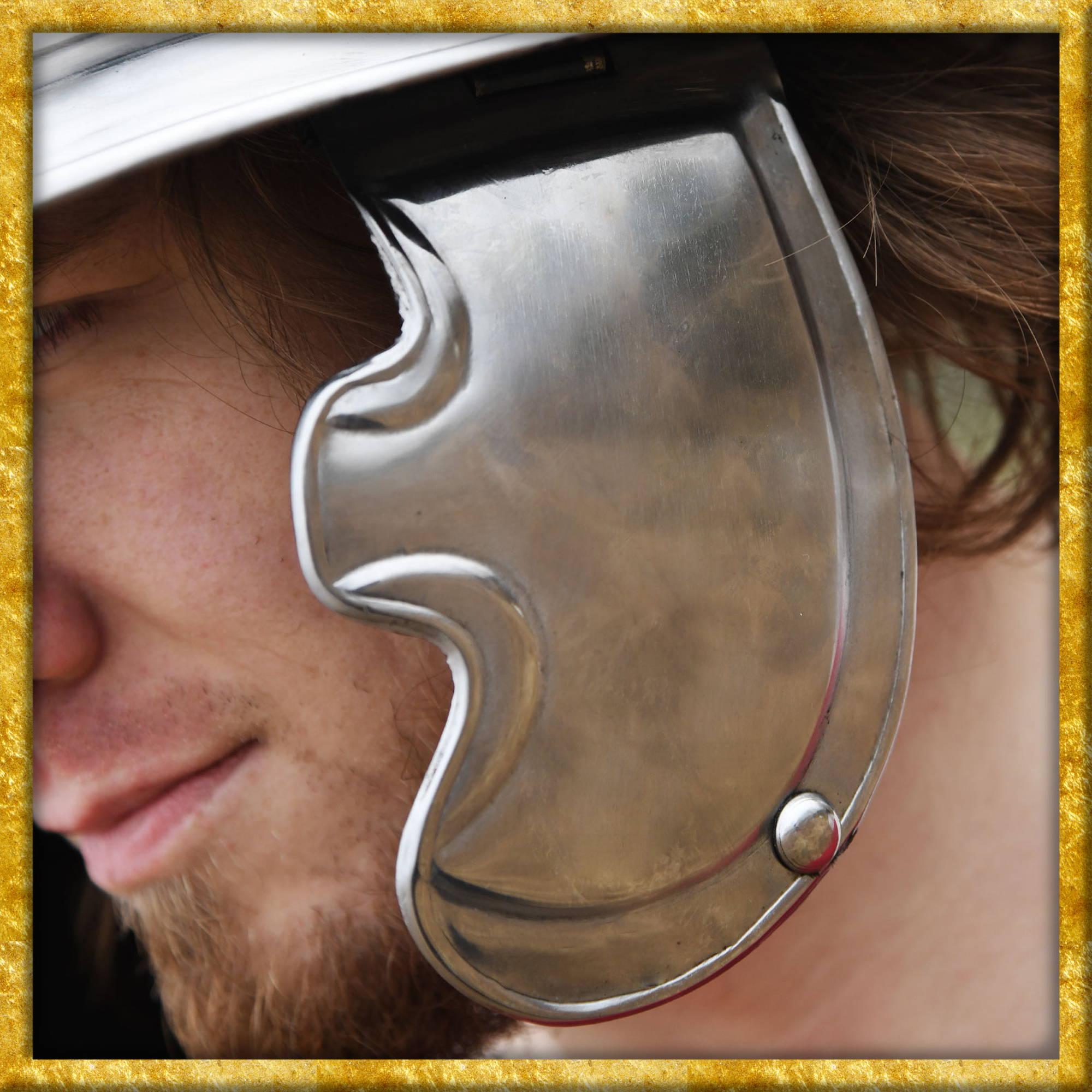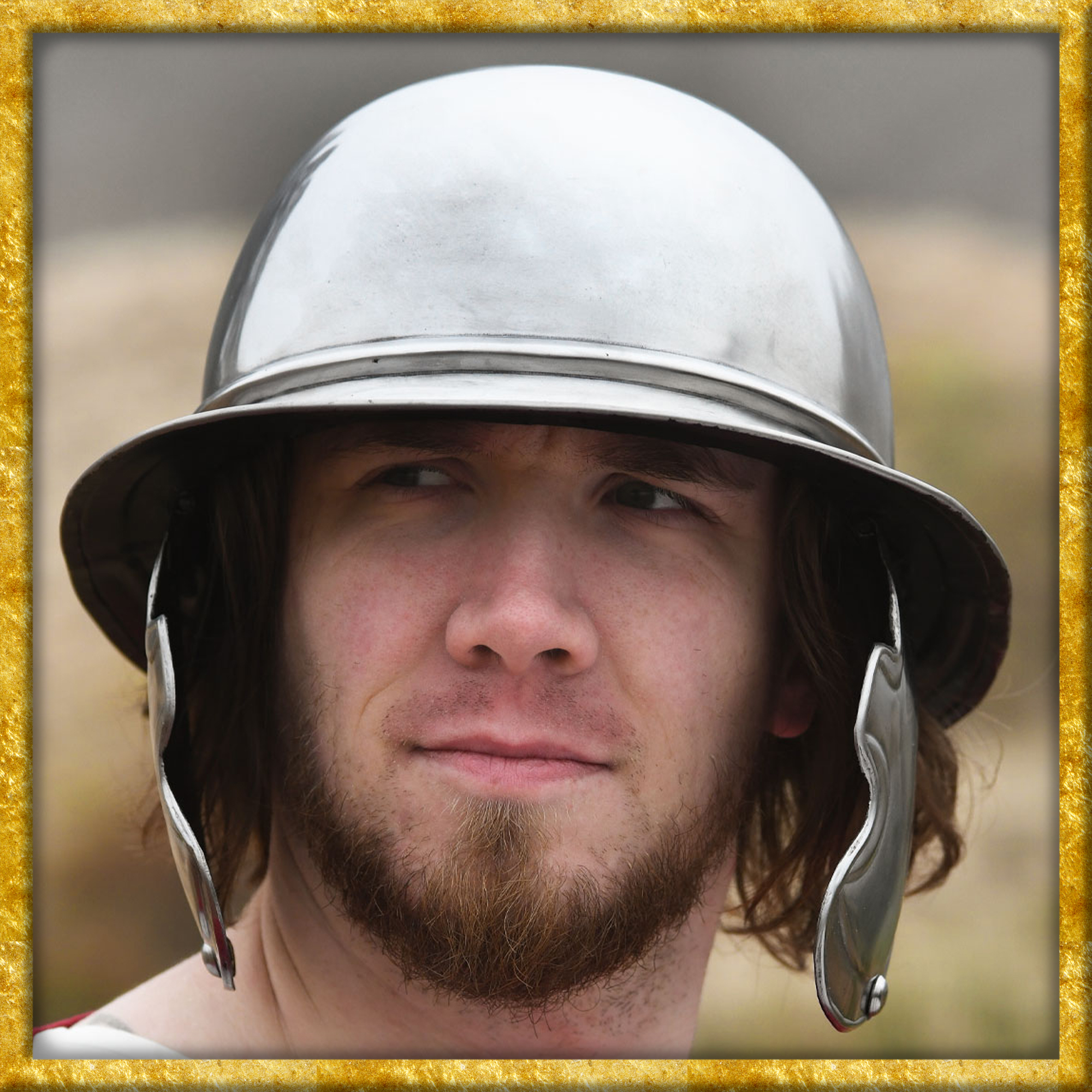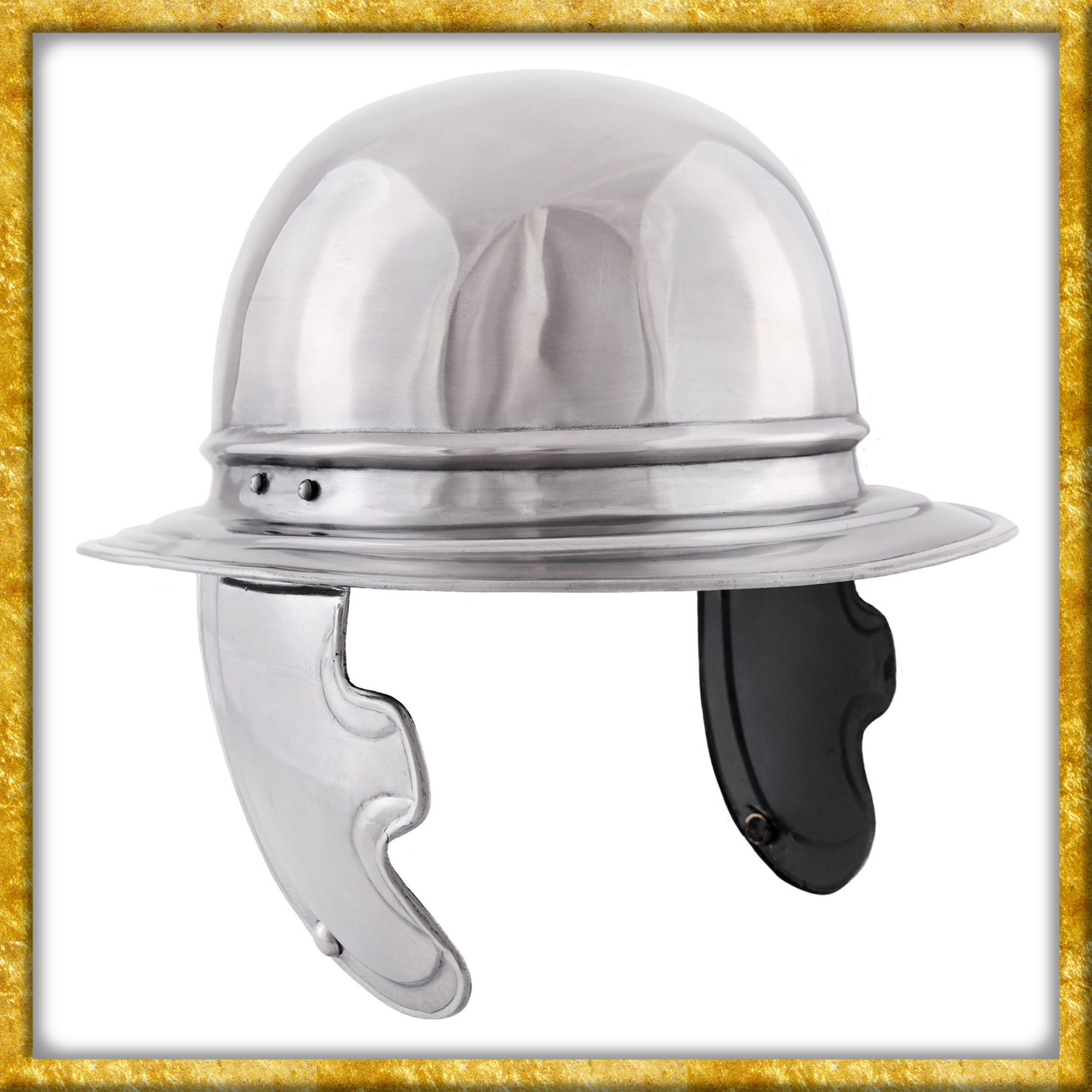 Diese detailreiche Nachbildung ist aus 1,2mm Stahl gefertigt. Ein besonderes Merkmal sind die umlaufenden Zierlinien an der Helmglocke sowie an der 4cm breiten Krempe, die im hinteren Bereich leicht ausgestellt ist und so einen Nackenschutz bildet. Dort verläuft zusätzlich eine weitere halbkreisförmige Zierrille. Die Wangenklappen sind mittels zweier Nieten am Helm befestig. Die Kanten des Helmes sind umlaufend gebördelt und die Innenseite ist zum besseren Schutz vor Korrosion geschwärzt. Zum Lieferumfang gehört zudem eine separate Polsterhaube, die für einen sicheren Sitz und angenehmen Tragekomfort sorgt.