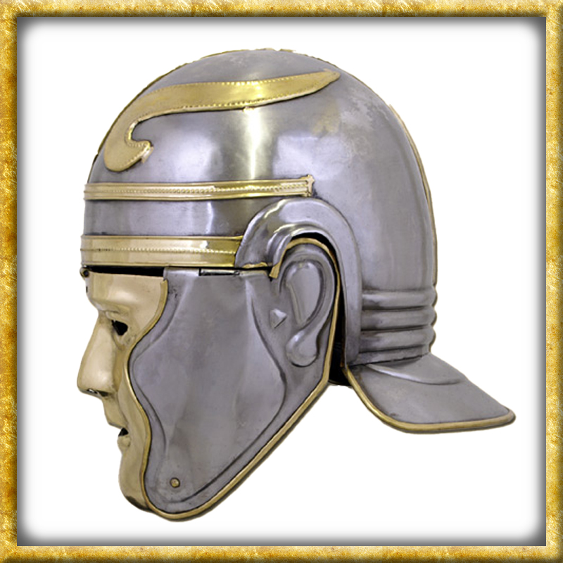 Dein prunkvoller Gesichtshelm aus Stahl und Messing ist nicht nur eine schützende Rüstung, sondern ein Symbol deiner Ehre und Macht als römischer Zenturio. Die filigranen Messingverzierungen glänzen im Sonnenlicht und betonen deine Stärke und Autorität. Wenn du dich unter das Banner des Imperiums stellst, verkündet dieser imposante Helm deine Führung und Entschlossenheit. Deine Legionäre erheben sich mit neuer Zuversicht, wenn sie den strahlenden Glanz dieses Helms erblicken, denn sie wissen, dass ein tapferer Anführer sie in die Schlacht führt.