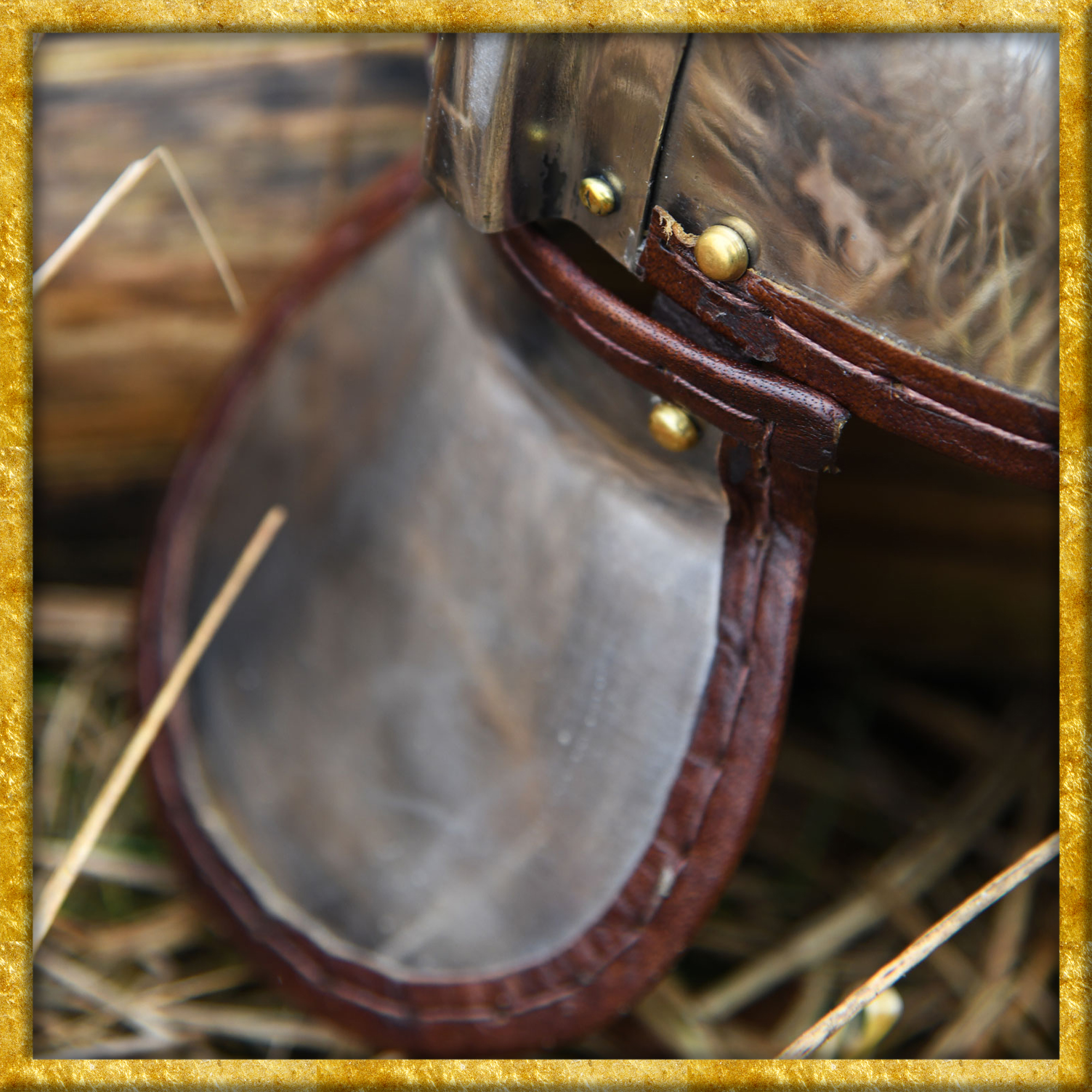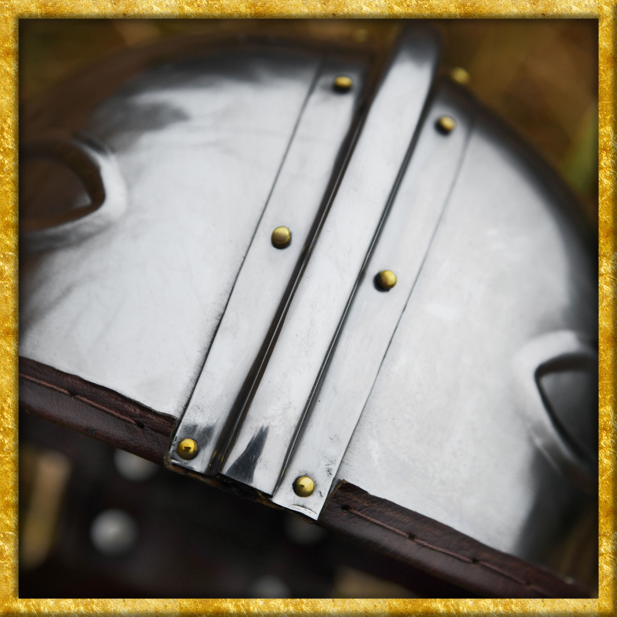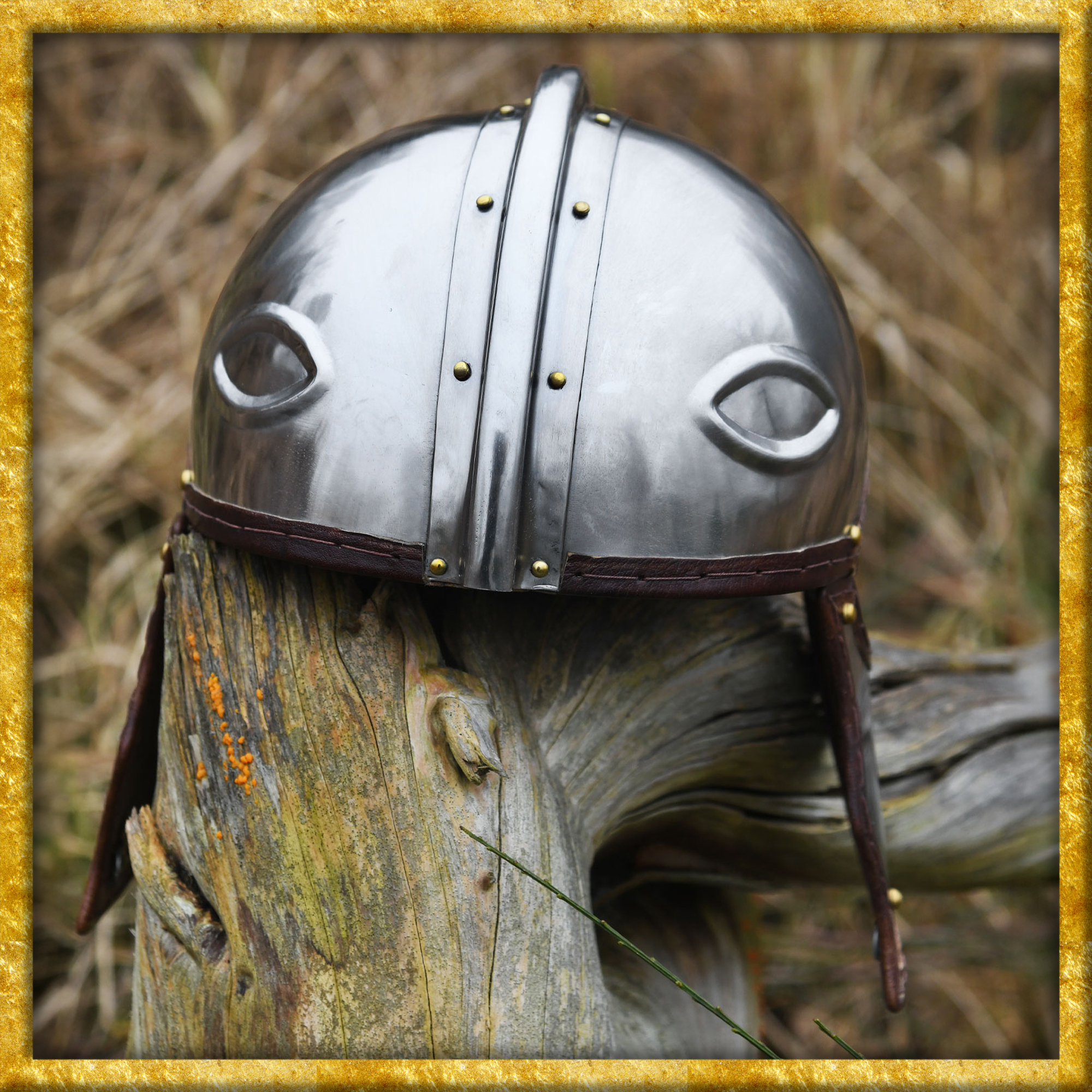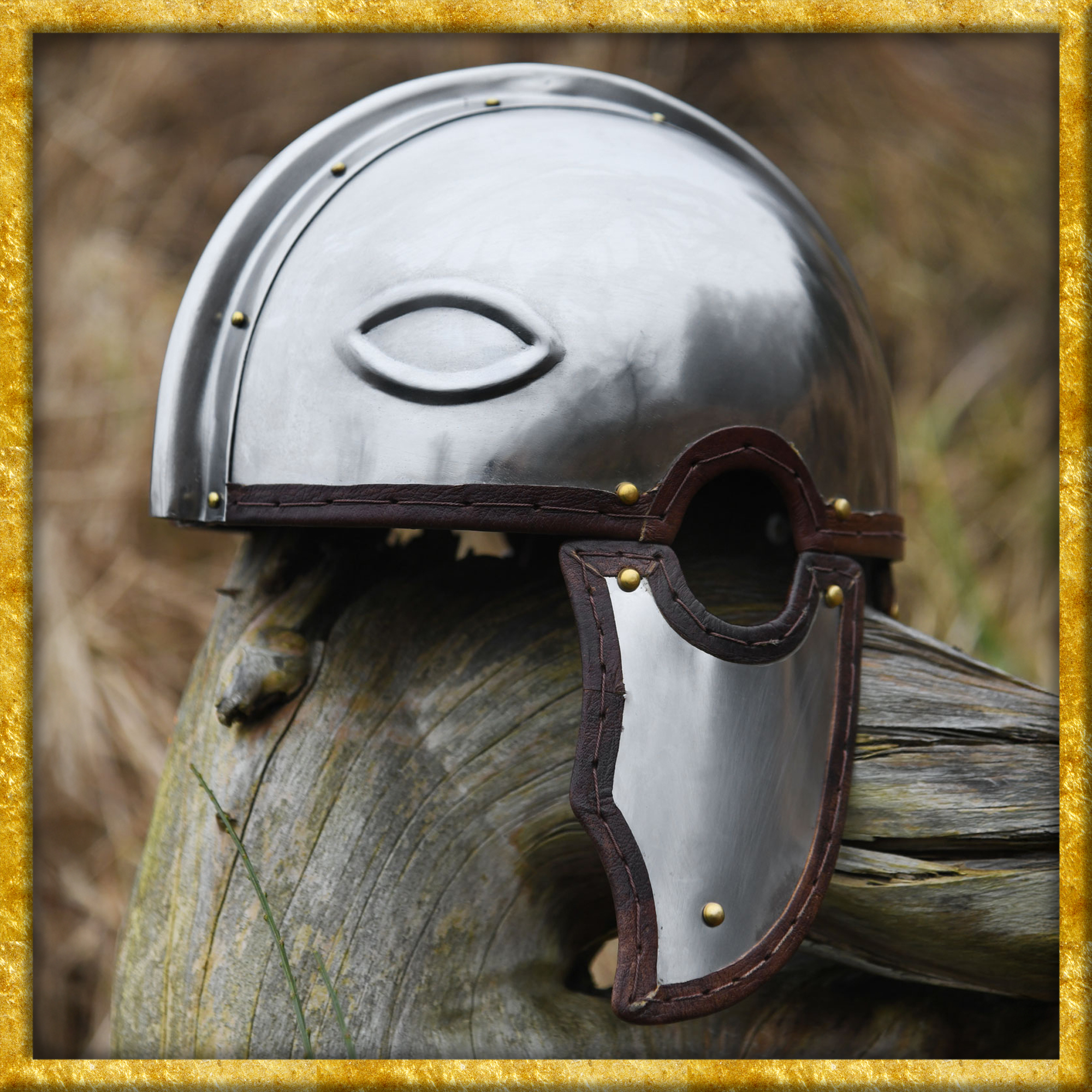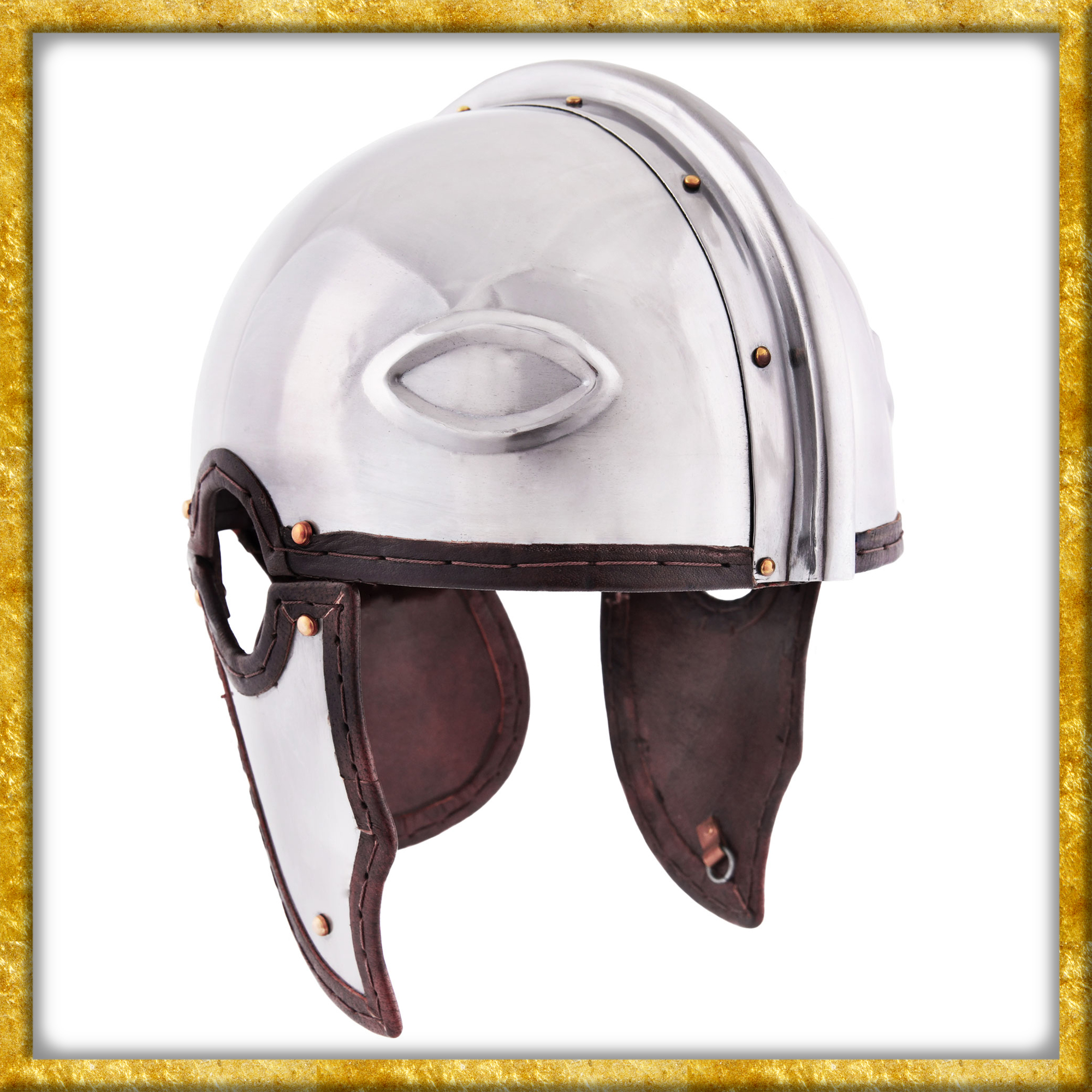 Diese detailgetreue Rekonstruktion eines römischen Helms Intercisa I ist aus 1,2 mm Stahl gefertigt und weist alle typischen Merkmale dieses Helmtyps auf. Besonders charakteristisch sind die Augenmotive auf der Stirnseite, die über den echten Augen des Trägers liegen und direkt nach vorne blicken. Die Ohrlöcher, die für diesen römischen Helm typisch sind, werden durch spezielle Aussparungen im Helm und in den Wangenklappen gebildet. Die Wangenklappen und der Nackenschutz sind mit robusten Lederriemen am Helm vernietet. Alle Kanten sind mit einem Lederrand versäubert und ein angenietetes, verstellbares Lederinlet sorgt für eine individuelle Größenanpassung sowie optimalen Tragekomfort.