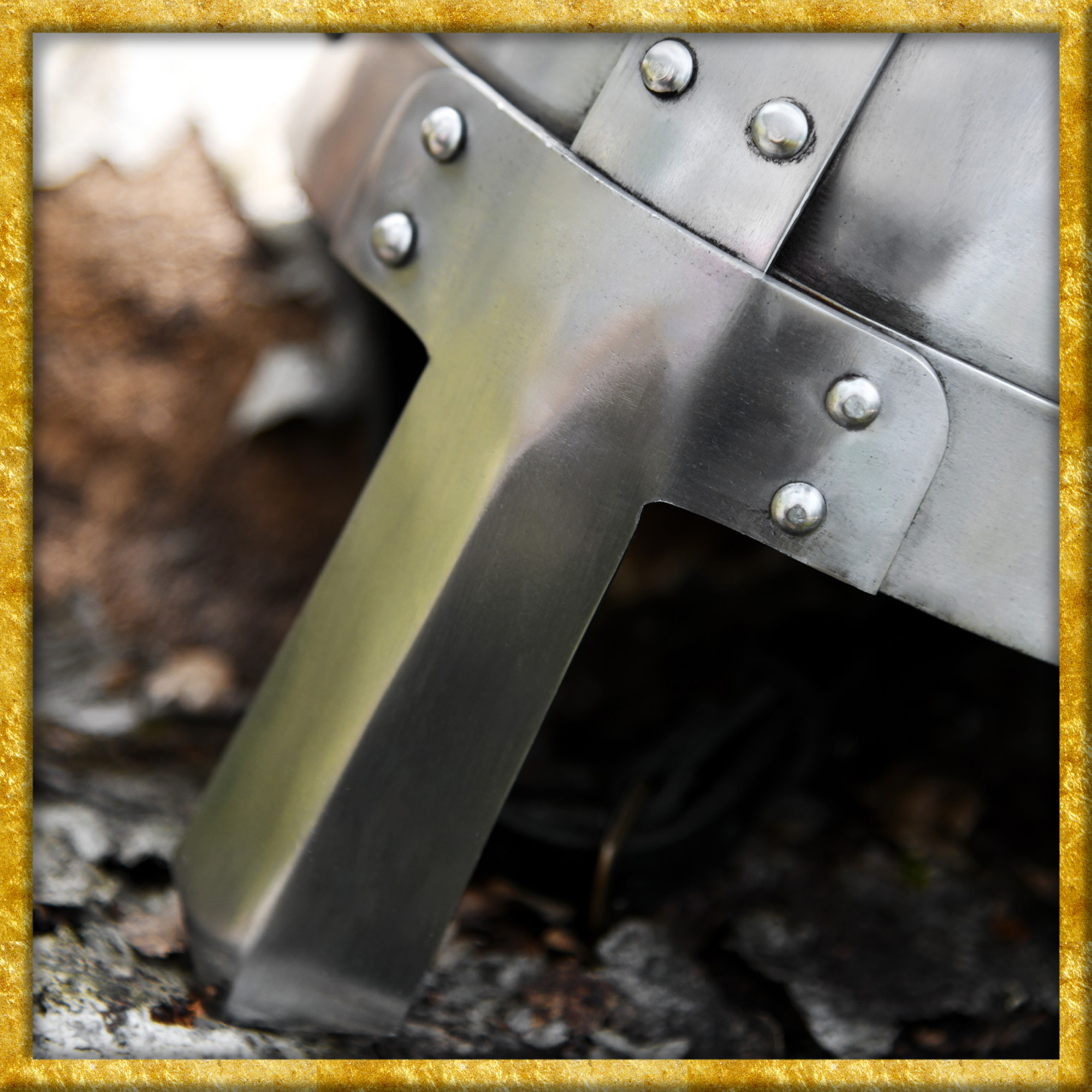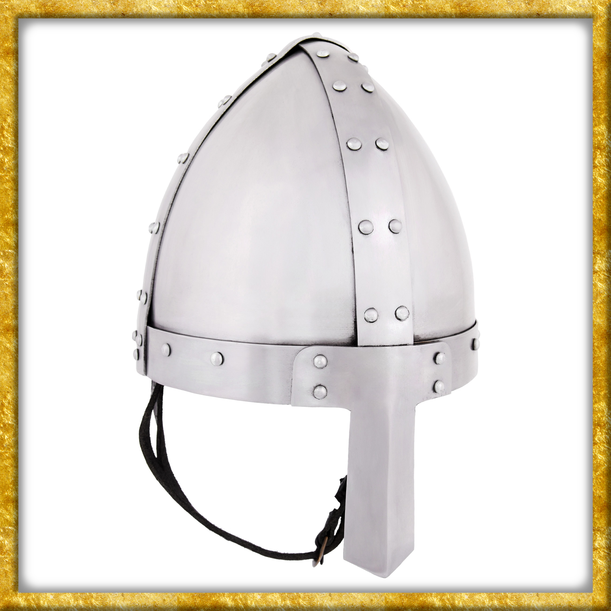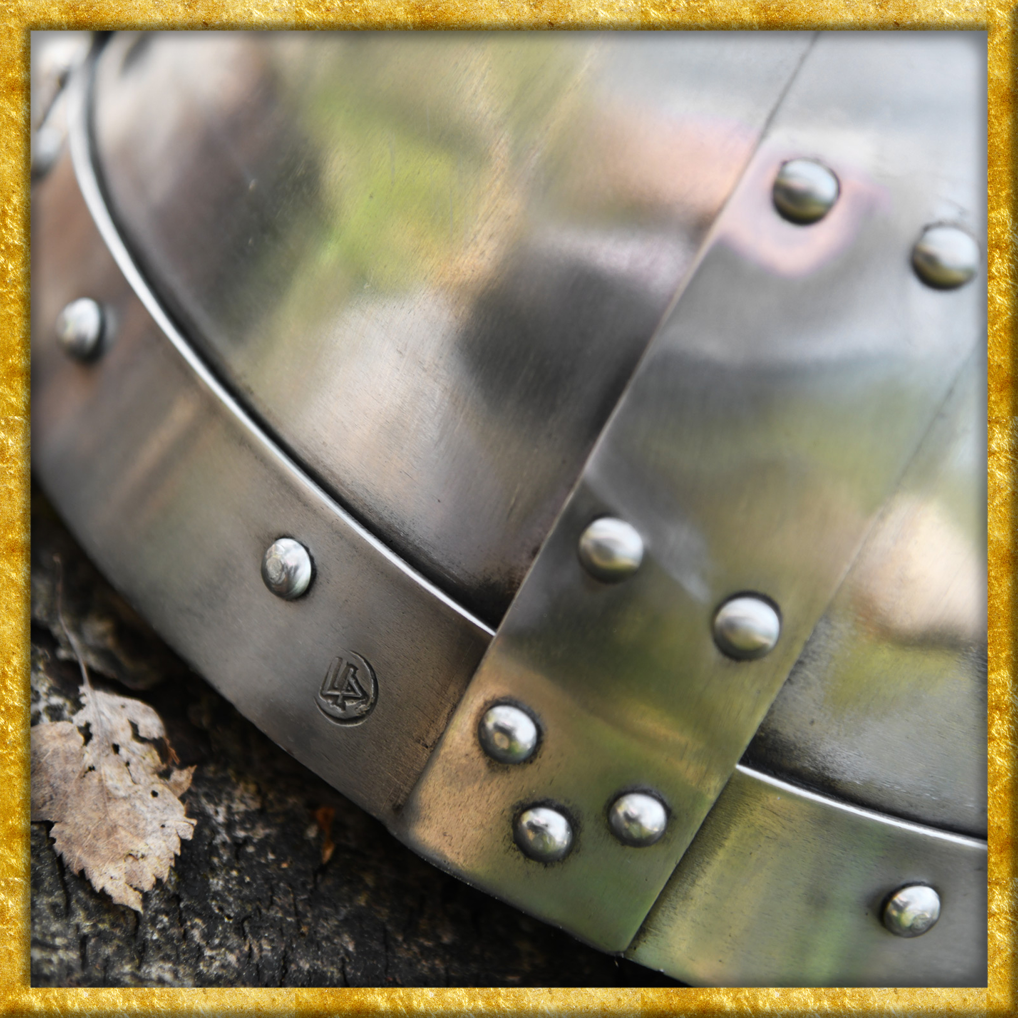 Bei diesem Helm handelt sich um eine voll schaukampftaugliche Replik eines historischen Spangenhelmes. Hergestellt aus 1,6 bis 3,2mm starkem Stahl. Die beiden Hälften des Helmes sind fest verschweisst. Die Bandbeschläge sind an den Helm angenietet, ebenso wie das Nasal aus 3mm starkem Stahl.