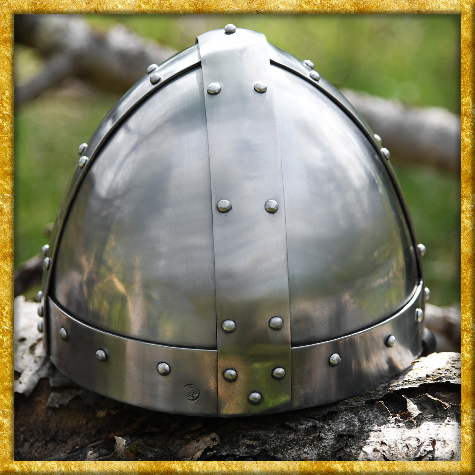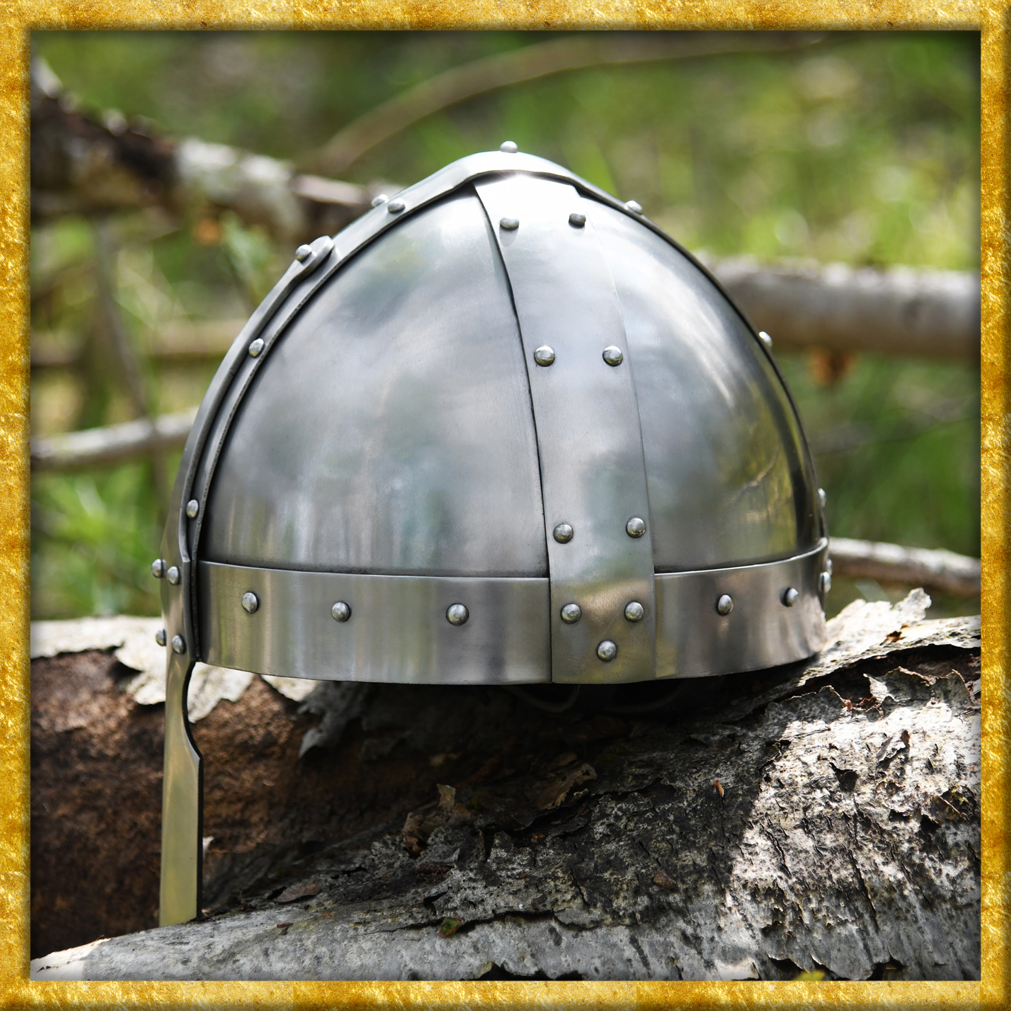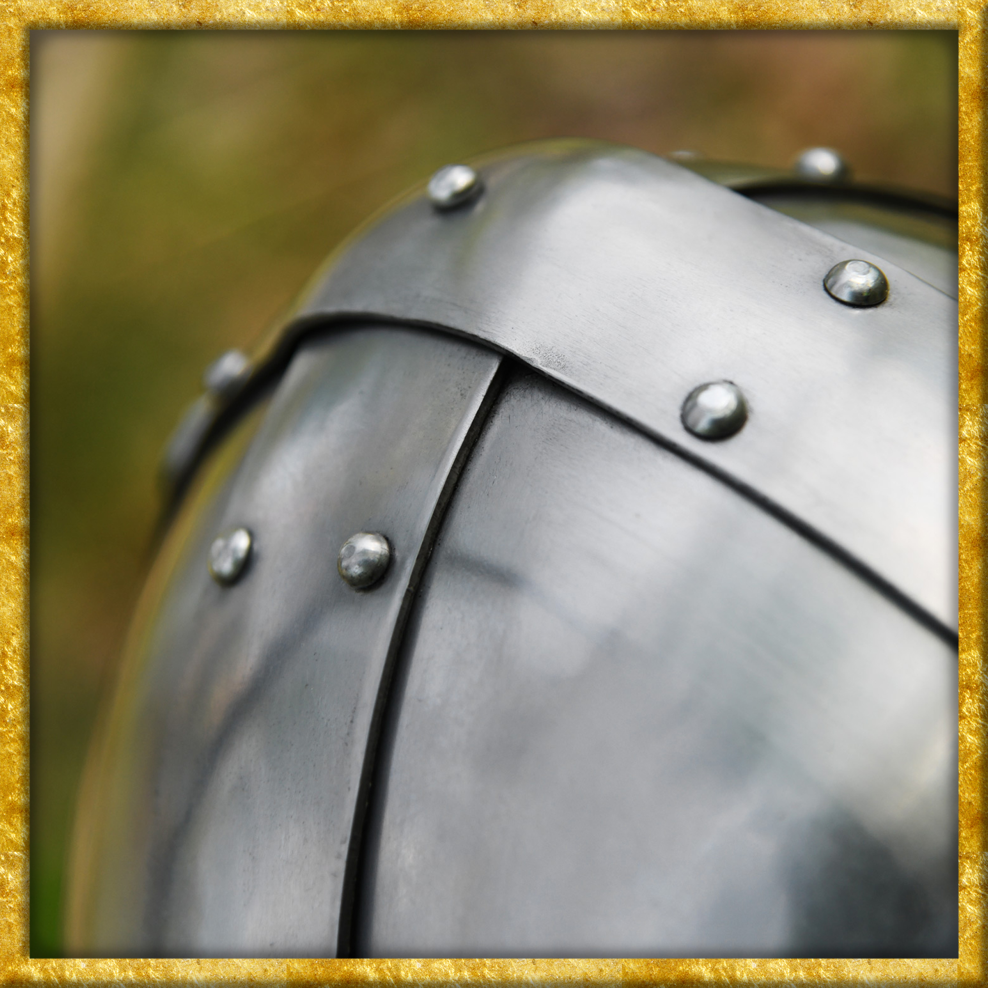 Bei diesem Helm handelt sich um eine voll schaukampftaugliche Replik eines historischen Spangenhelmes. Hergestellt aus 2,0 bis 3,2mm starkem Stahl. Die beiden Hälften des Helmes sind fest verschweisst. Die Bandbeschläge sind an den Helm angenietet, ebenso wie das Nasal aus 3mm starkem Stahl.