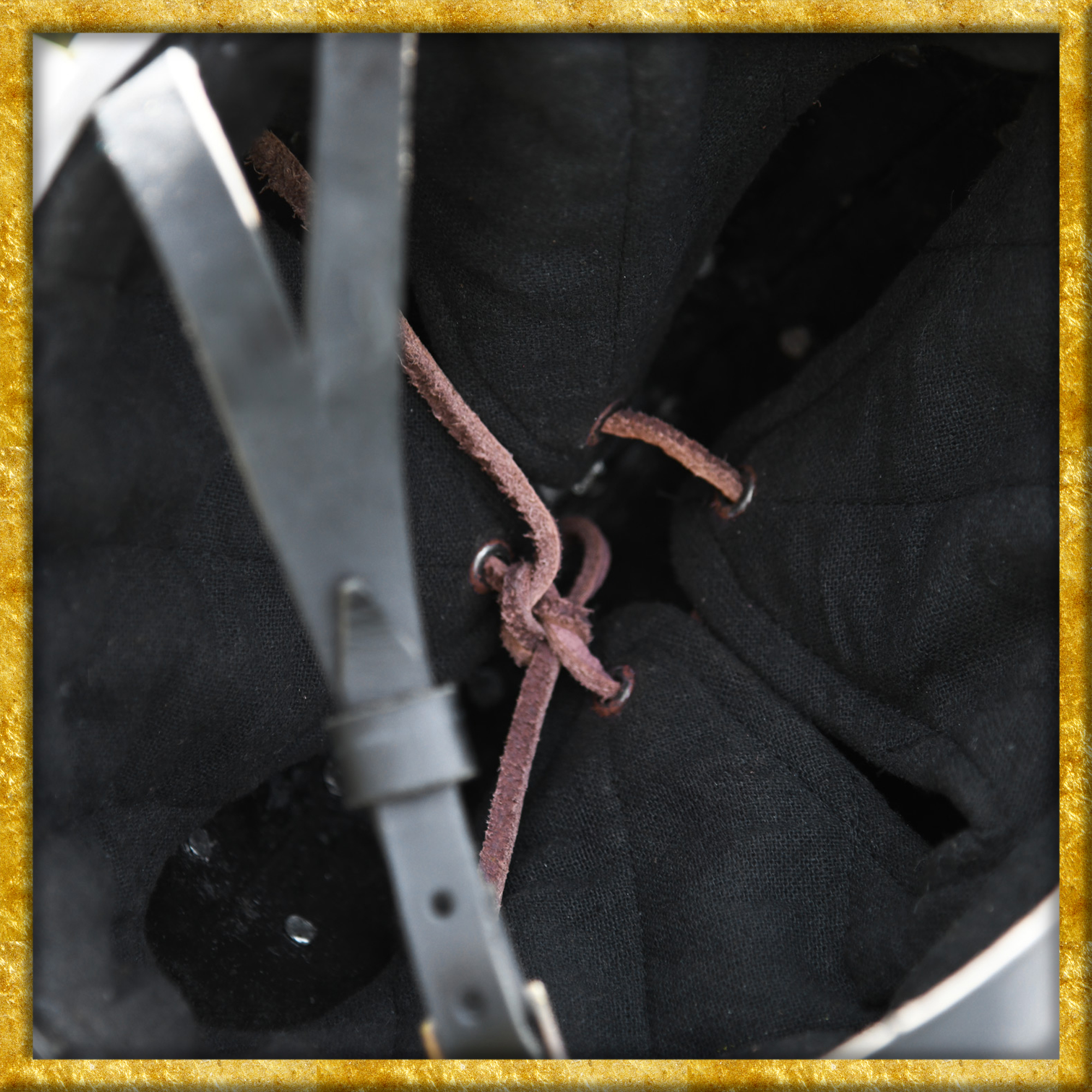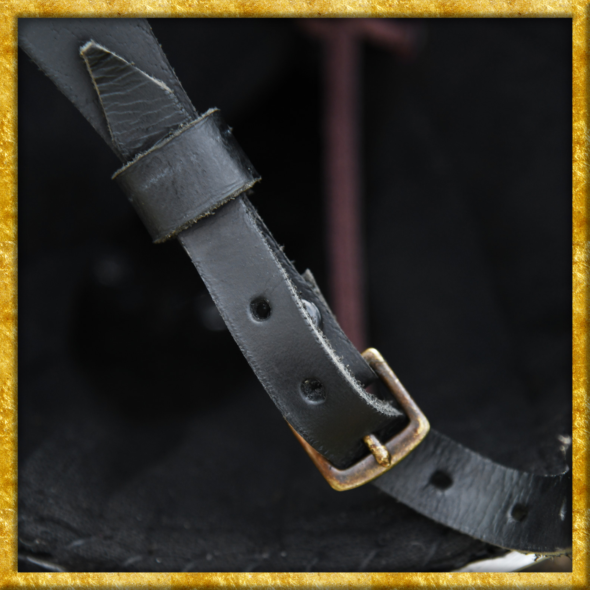 Diese Verarbeitung und die Überlappung gewährleistet höchste Robustheit und somit grossen Schutz beim Schaukampf. Mitgeliefert wird ein eingenietetes, hochwertiges und verstellbares gepolstertes Inlays und Kinnriemen aus Leder.