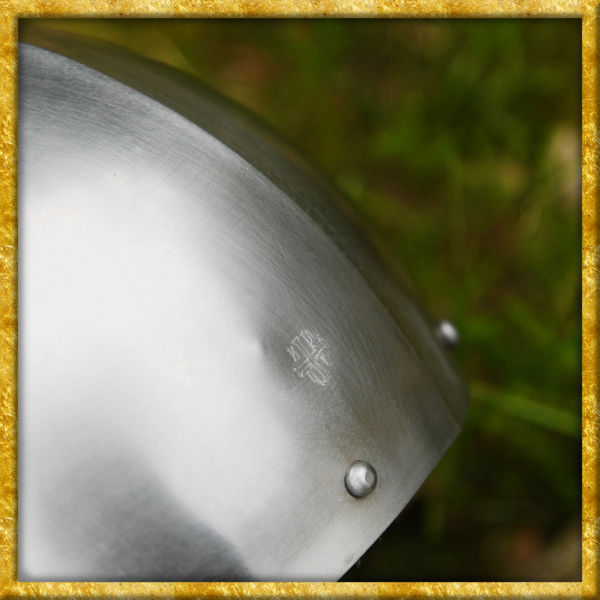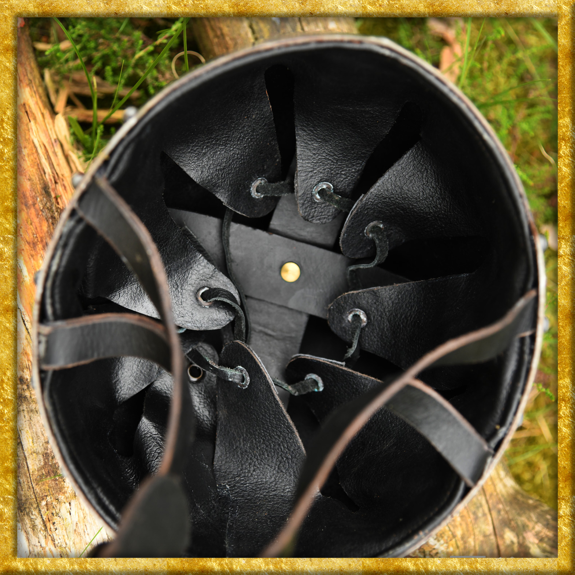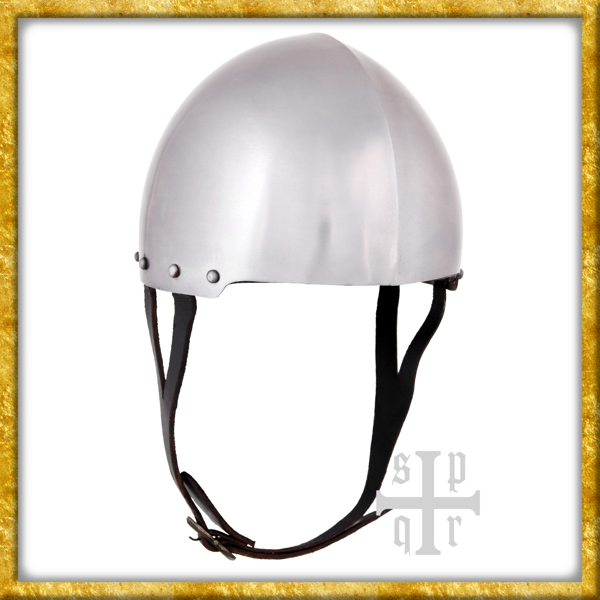 Diese Rekonstruktion einer hochmittelalterlichen, visierlosen Hirnhaube, wie sie im 13. Jahrhundert getragen wurde, ist aus 2mm Stahl gefertigt. Bei diesem Schaukampfhelm ist die Innenseite zum besseren Schutz vor Korrosion geschwärzt und mit einem eingenieteten, verstellbaren Lederinlay versehen. Der robuste, justierbare Kinnriemen aus Leder ist mit einer Schnalle aus Messing mit Antik-Finish ausgestattet.