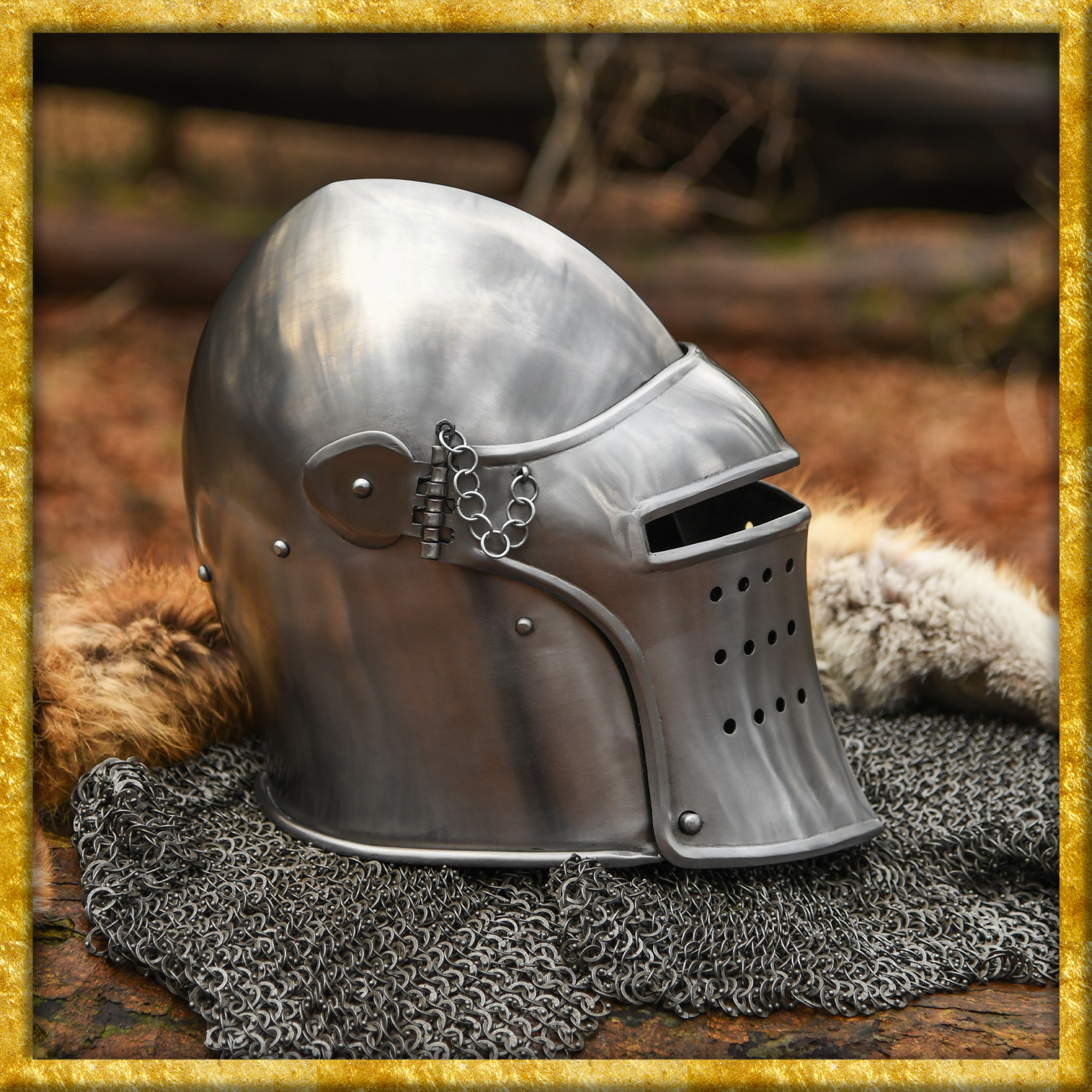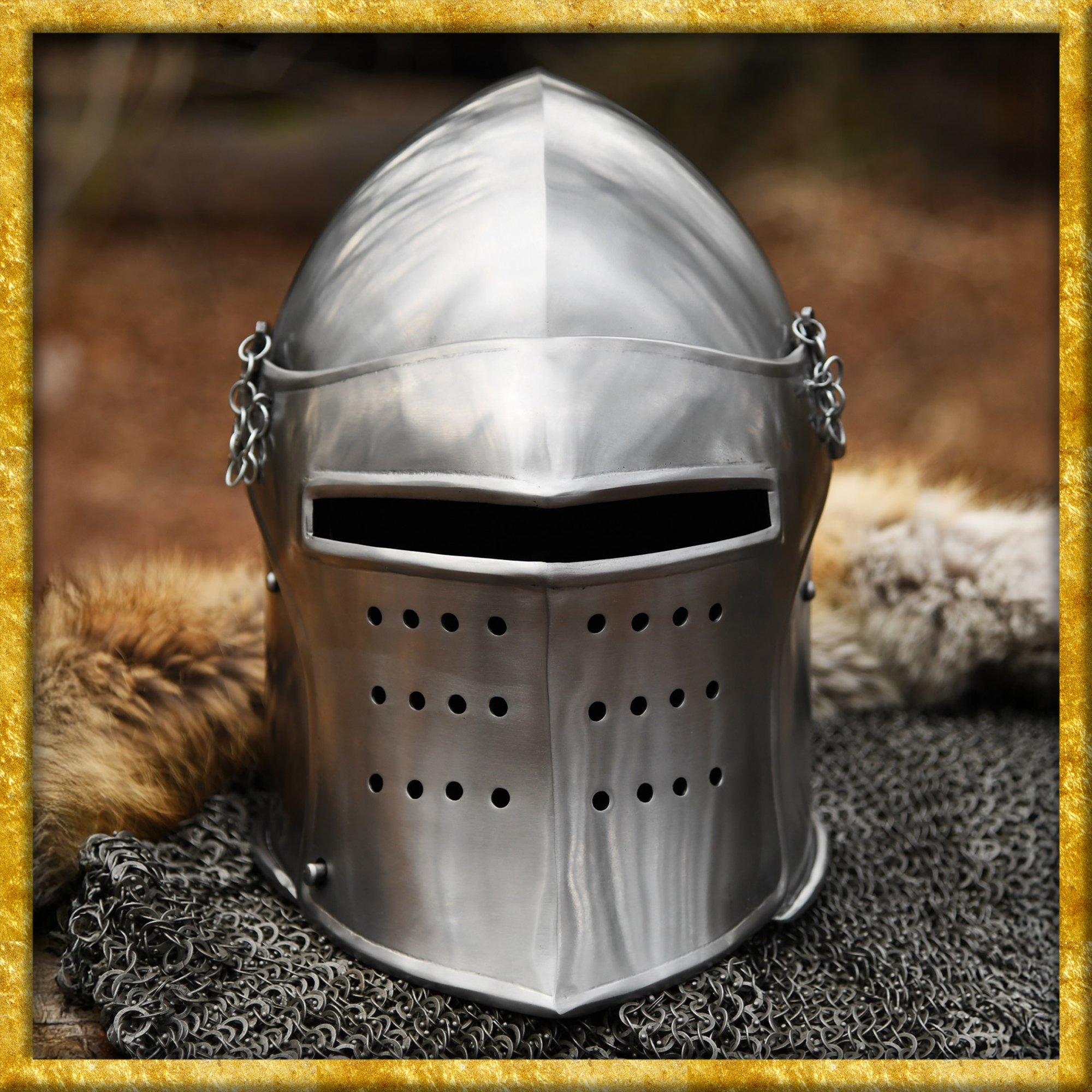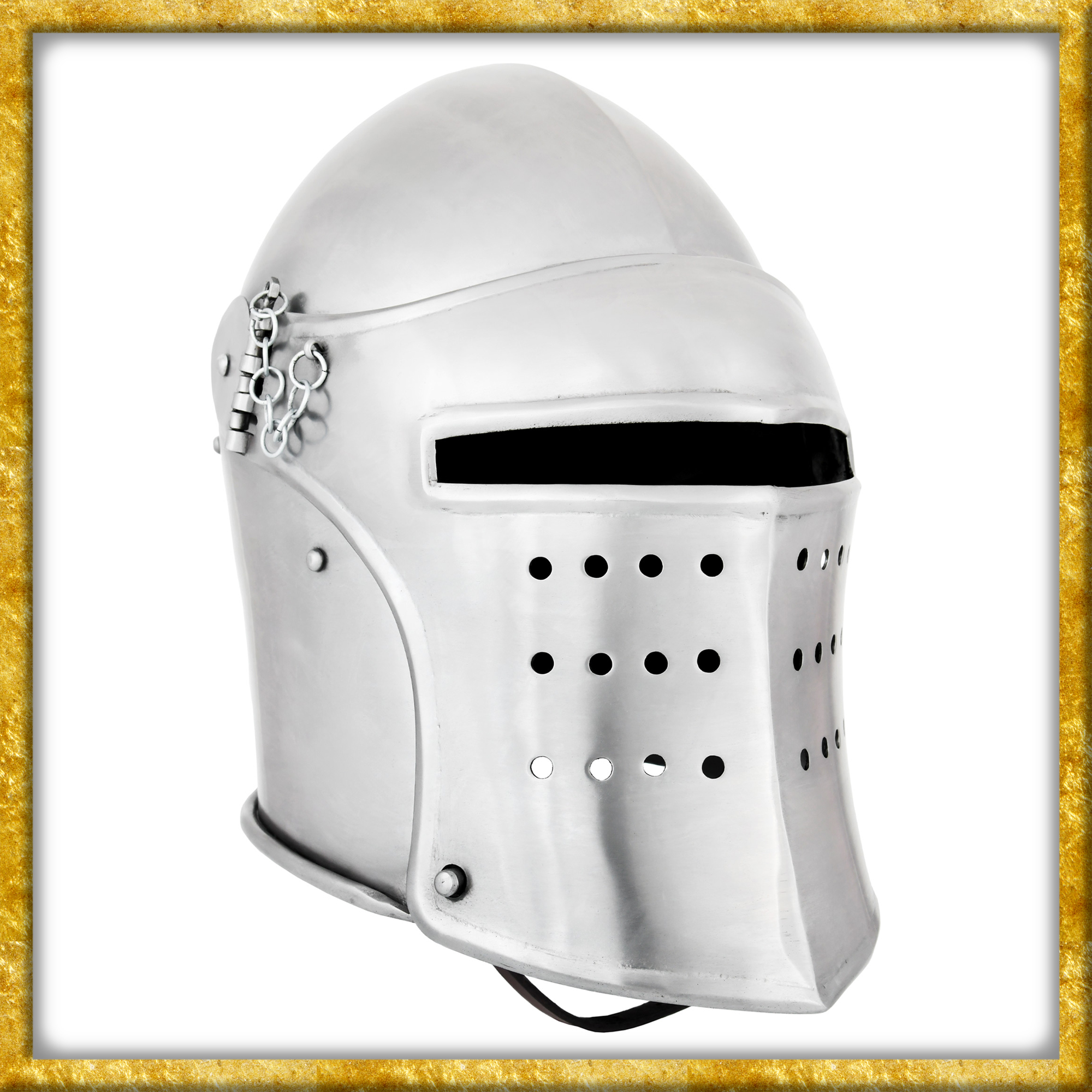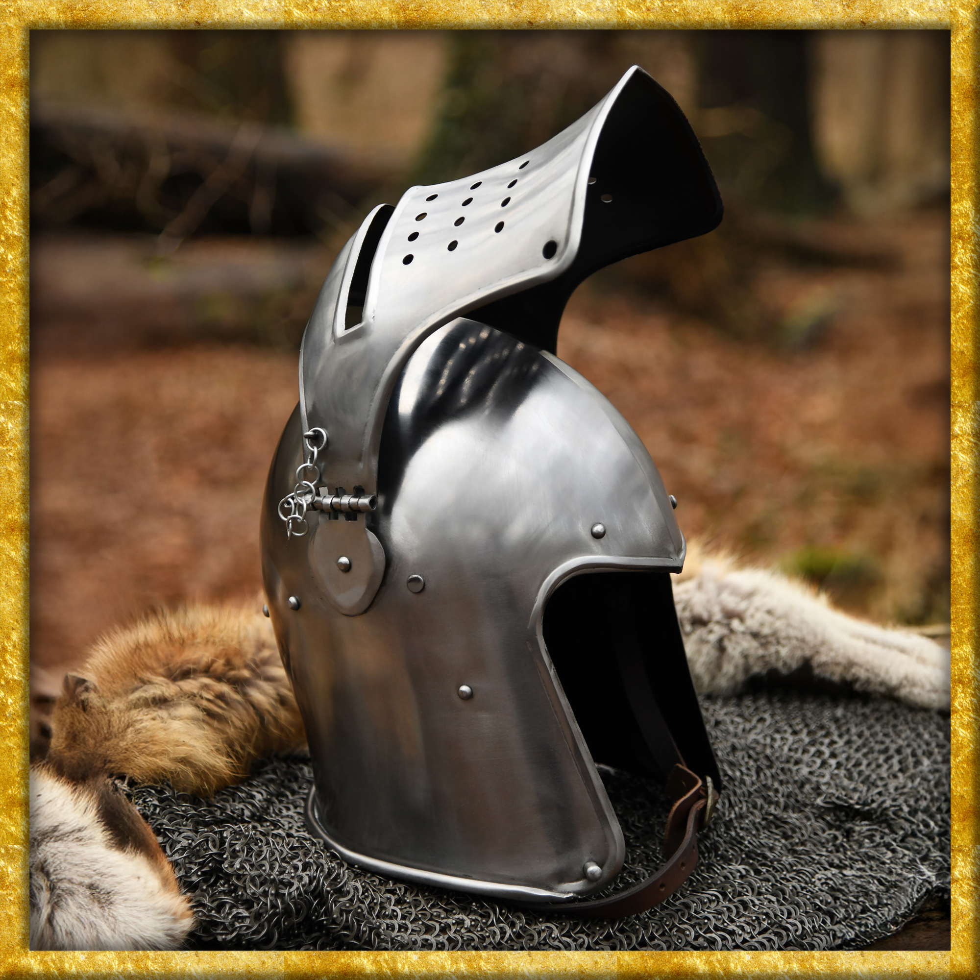 Die hier angebotene Rekonstruktion einer spätmittelalterlichen Beckenhaube wurde aus 1,6mm Stahl gefertigt und anschliessend poliert. Der Helm besitzt ein bewegliches, voll abnehmbares Visier, welches mit Steckstiften und Kettchen sicher in Position gehalten wird. Das Klappvisier ist mit einem rechteckigen, ca. 2 bis 2,5 cm breiten Sehschlitz ausgestattet, und die vielen runden Aussparungen an der unteren Hälfte sorgen für die nötige Luftzirkulation.