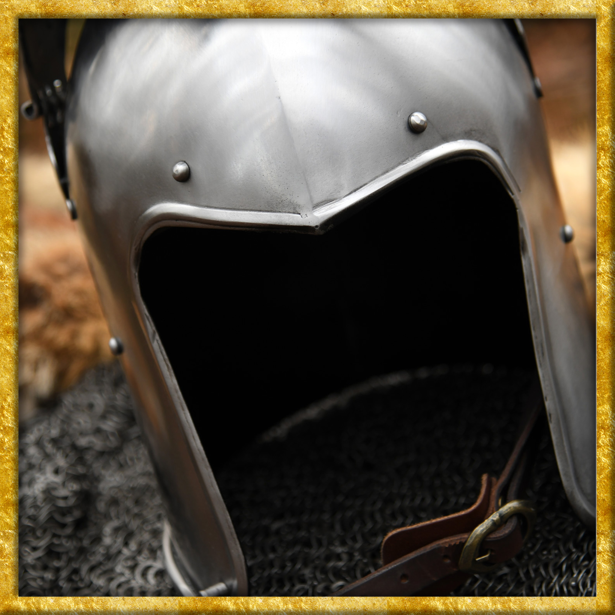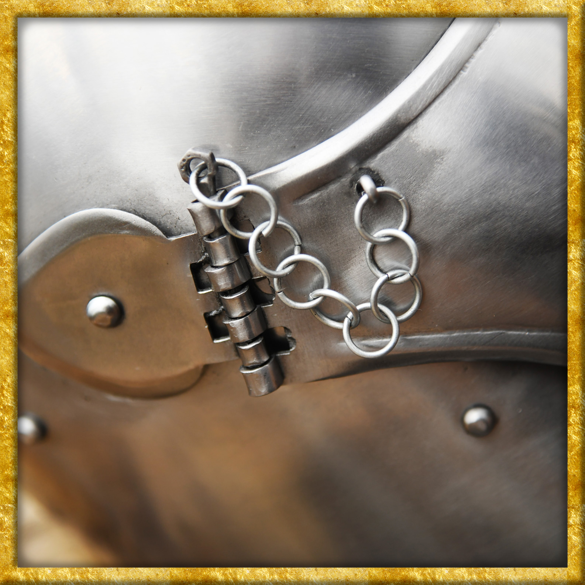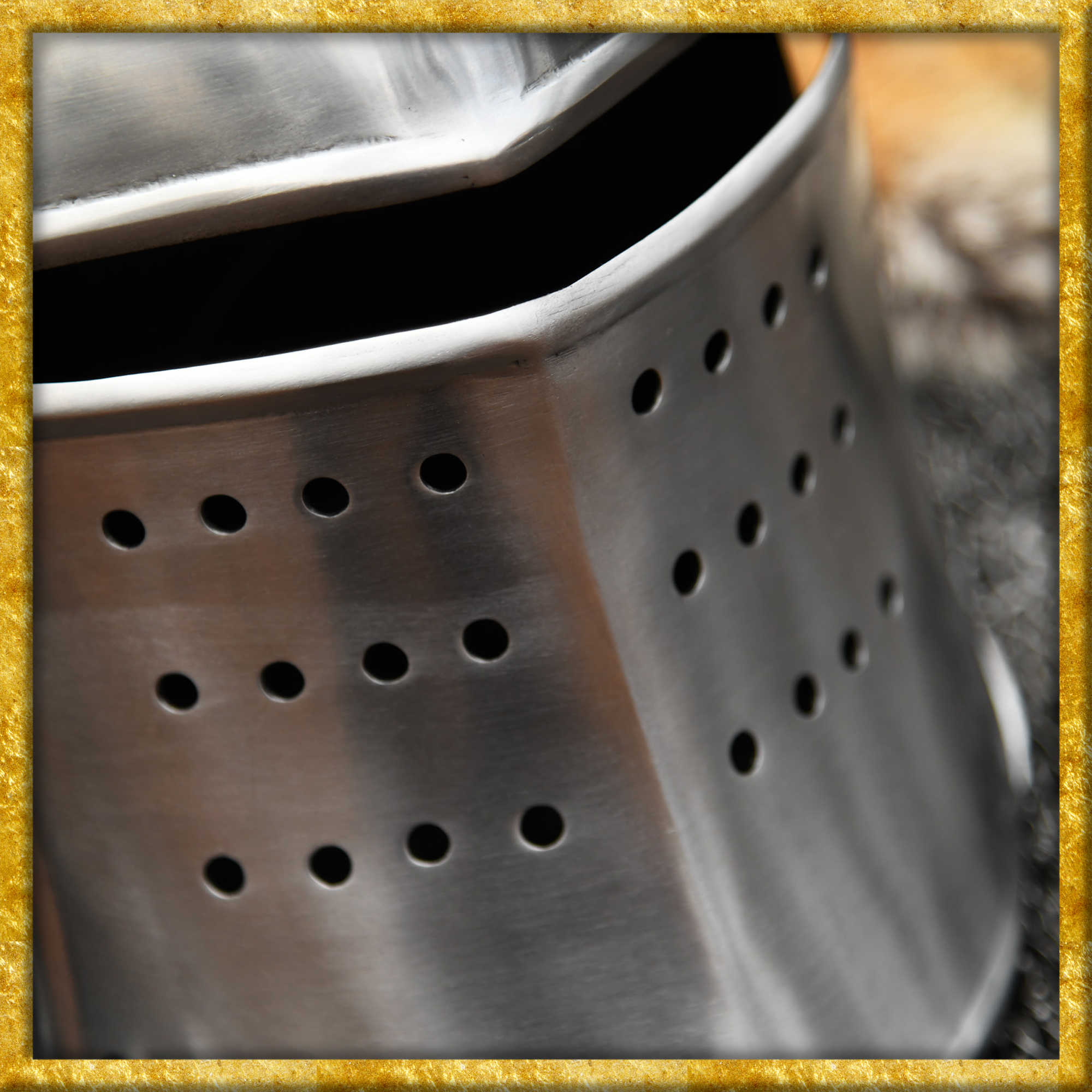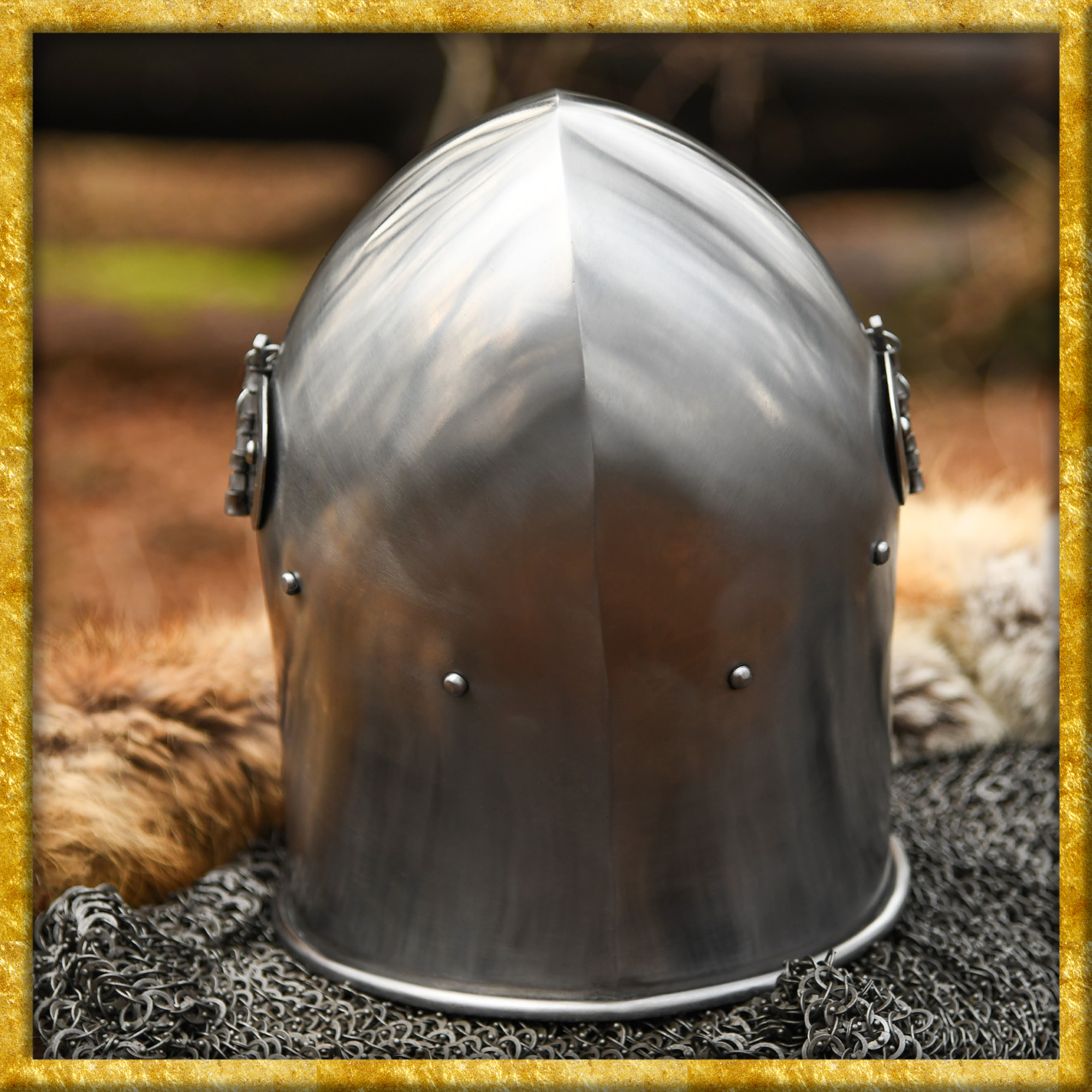Die hier angebotene Rekonstruktion einer spätmittelalterlichen Beckenhaube wurde aus 1,6mm Stahl gefertigt und anschliessend poliert. Der Helm besitzt ein bewegliches, voll abnehmbares Visier, welches mit Steckstiften und Kettchen sicher in Position gehalten wird. Das Klappvisier ist mit einem rechteckigen, ca. 2 bis 2,5 cm breiten Sehschlitz ausgestattet, und die vielen runden Aussparungen an der unteren Hälfte sorgen für die nötige Luftzirkulation.