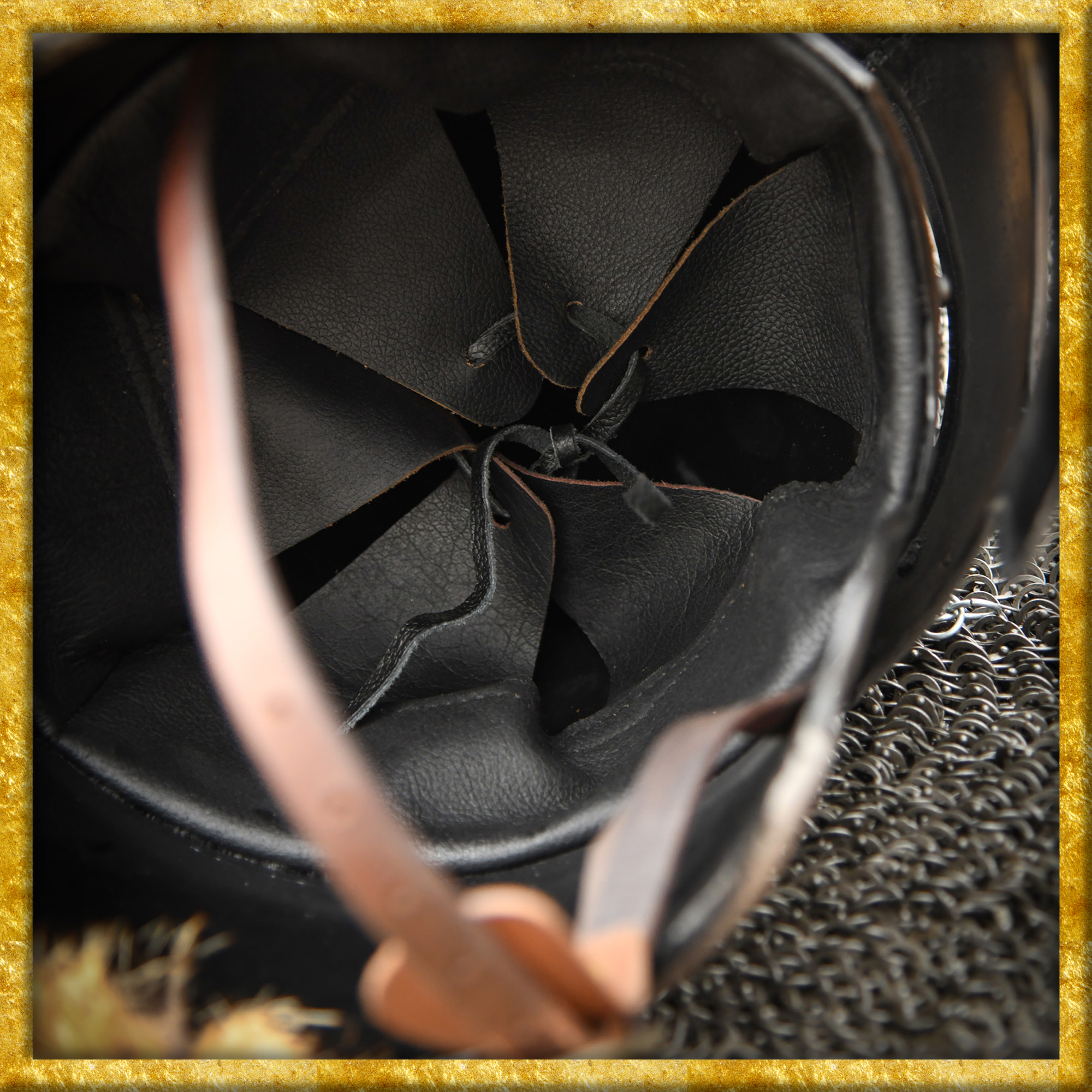 Die Innenseite ist mit einem dünnen, mit Nieten an der Helmglocke befestigten Lederinlay versehen. Der Kinnriemen aus schwarzem, 2 mm starkem Leder ist mit einer Schnalle aus Stahl ausgestattet.