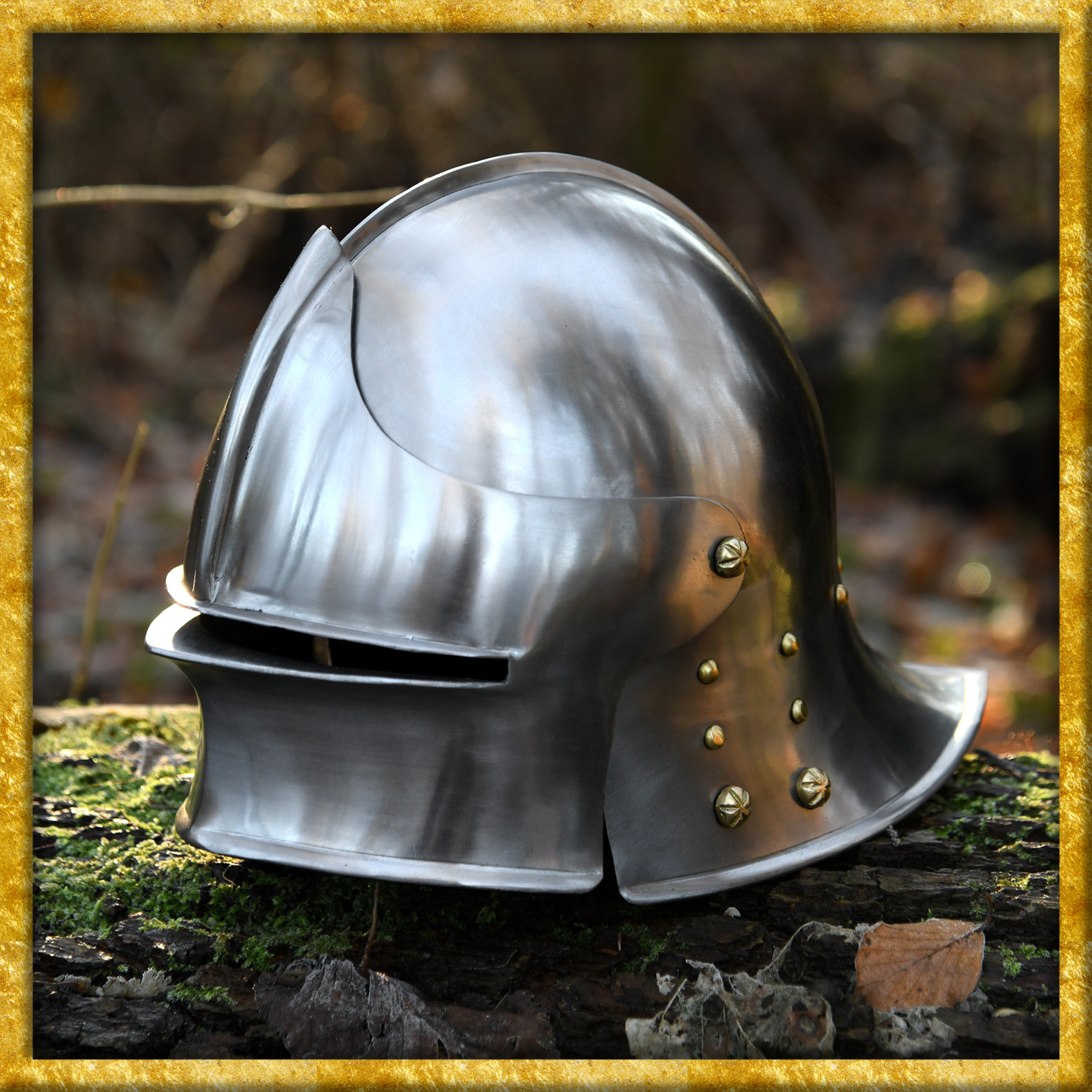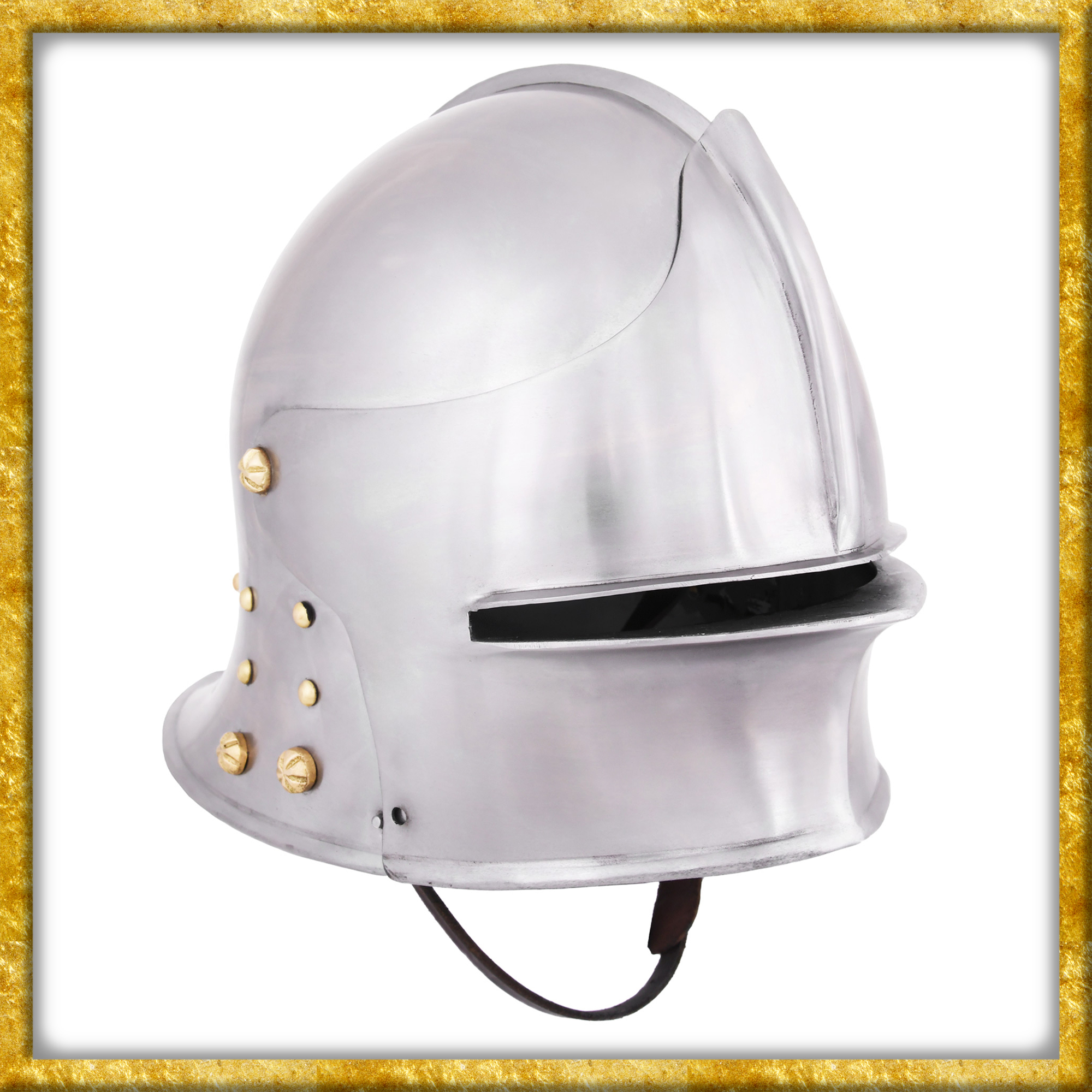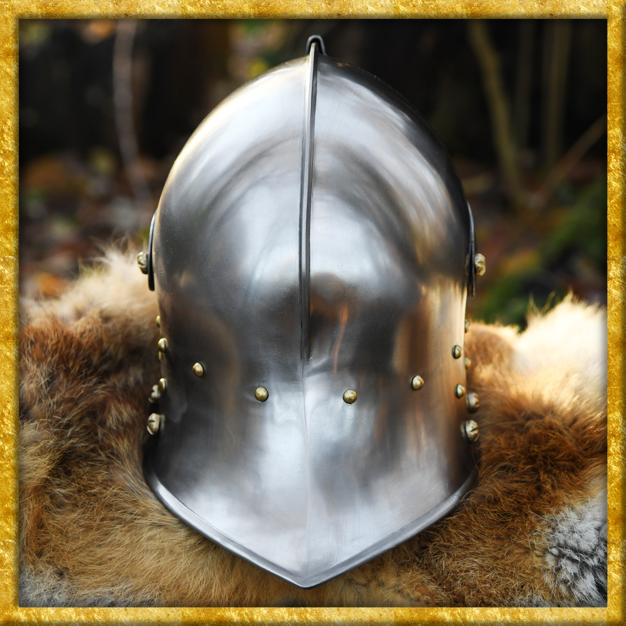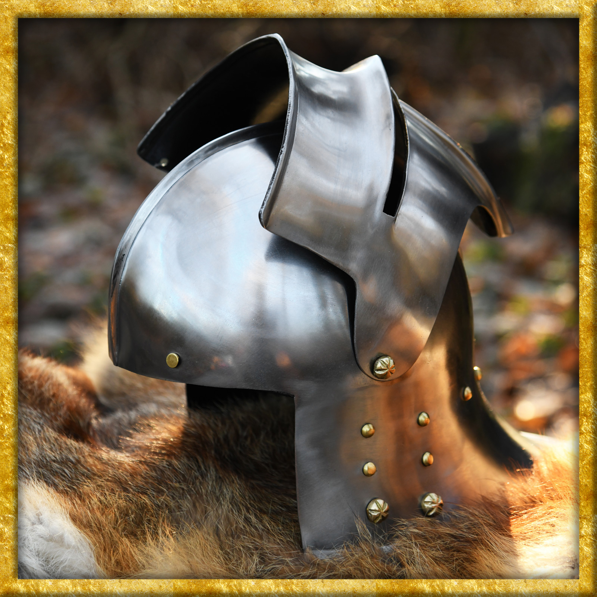 Diese sehr originalgetreue und schaukampftaugliche Rekonstruktion eines deutschen Schallers verbindet sowohl authentische Darstellung als auch grosse Sicherheit beim Schaukampf. Das Visier ist durch einen angebrachten Dorn in der untersten Stufe arretierbar. Der Helm hat ein sehr komfortables Lederinlay und einen soliden Kinnriemen mit Schnalle.