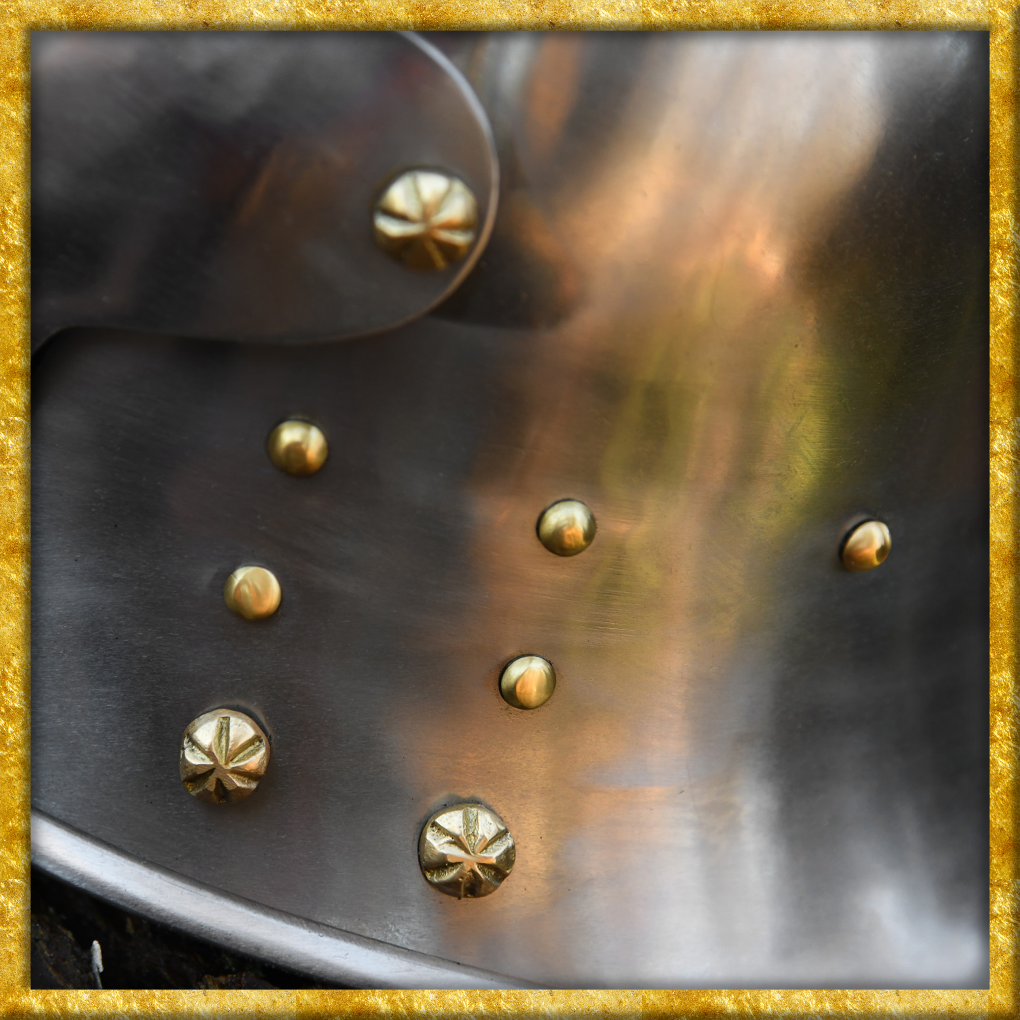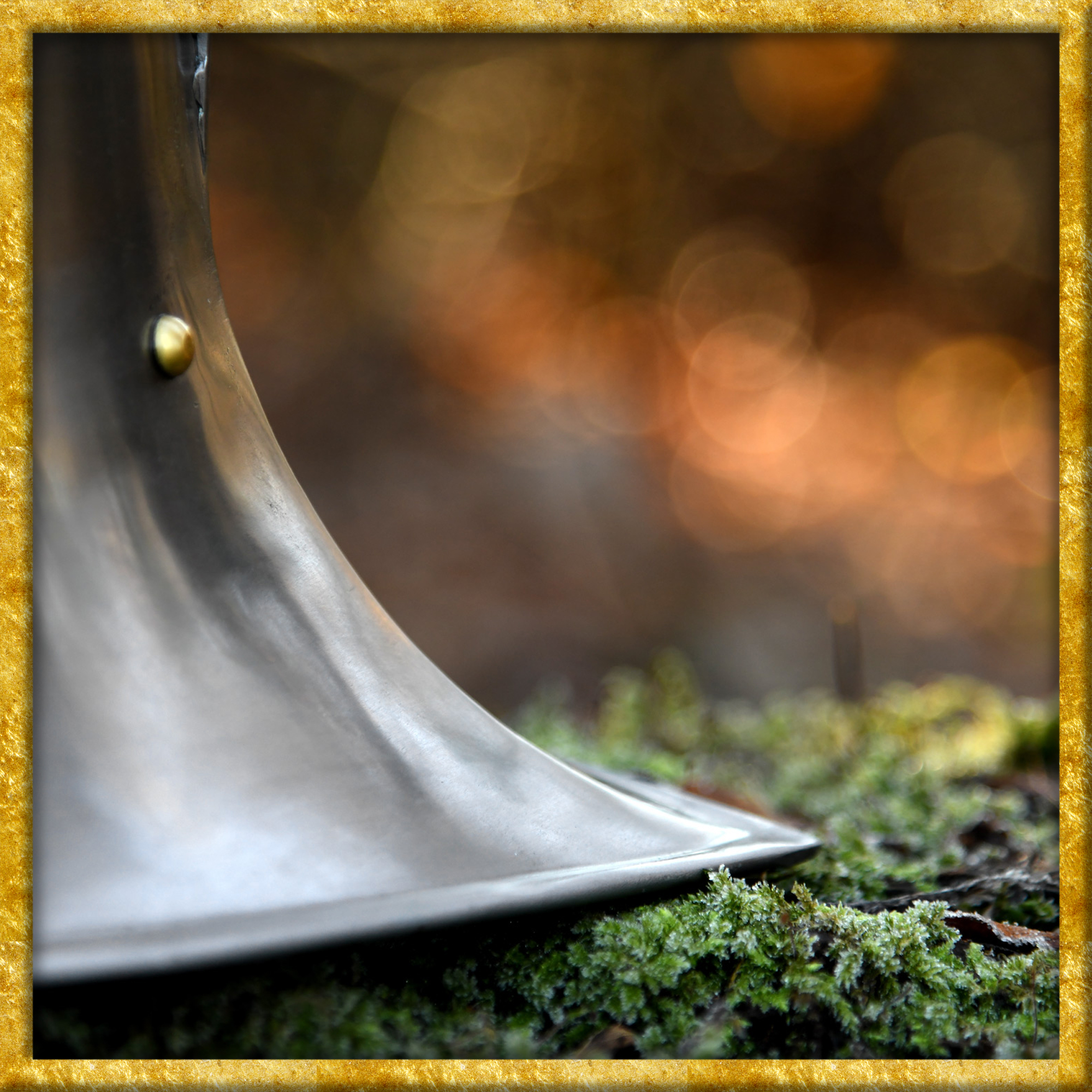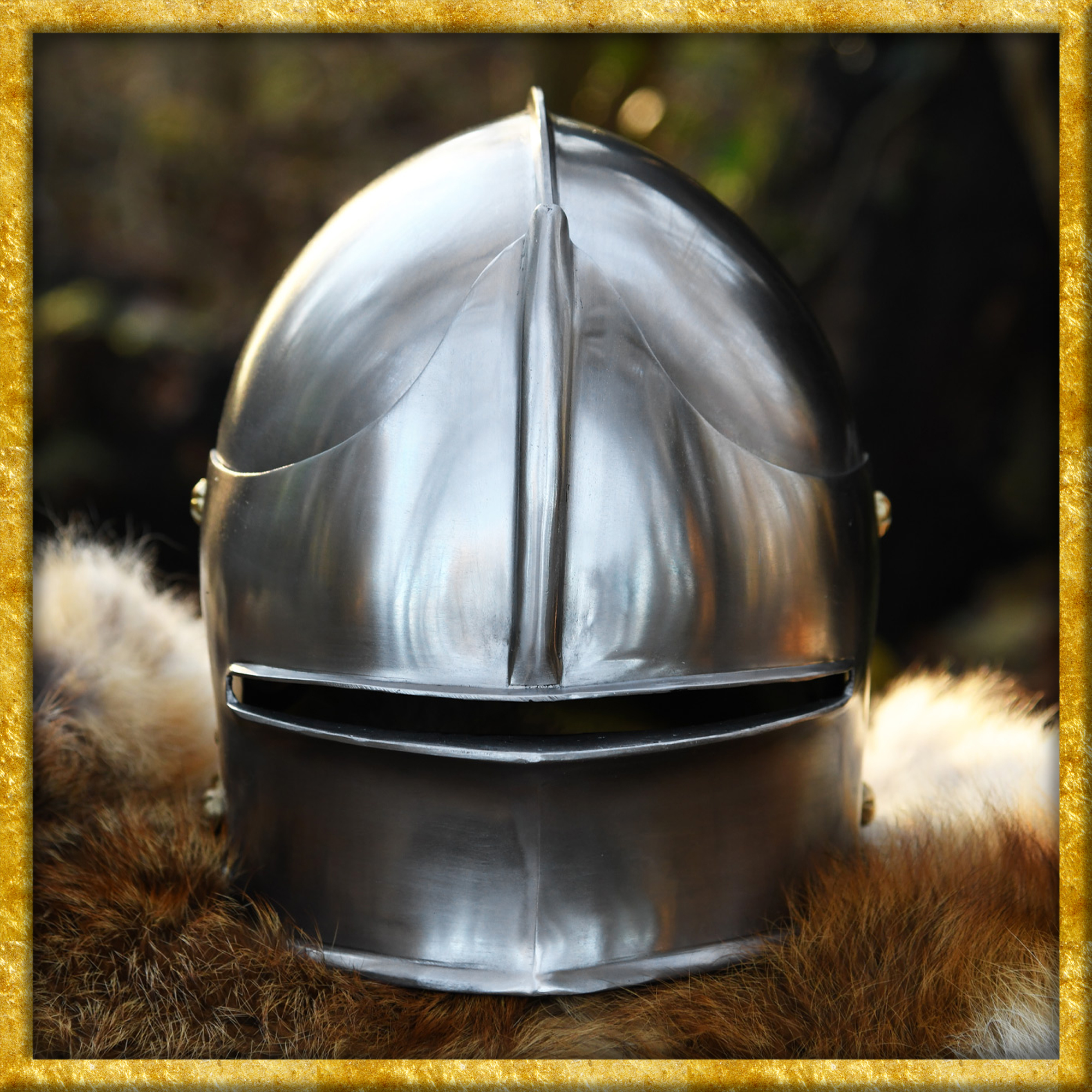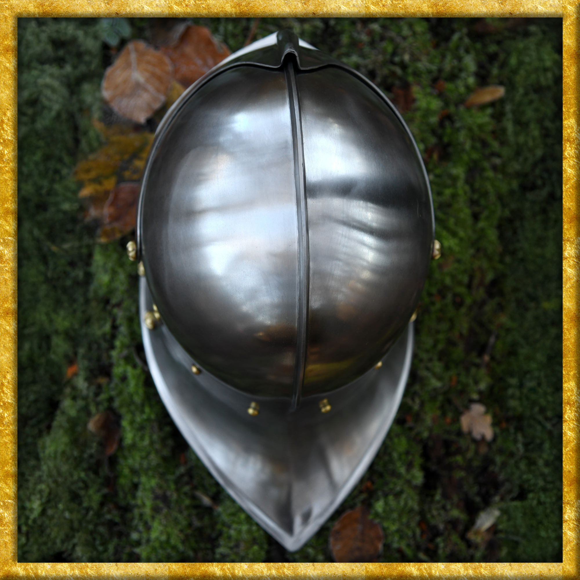 Diese sehr originalgetreue und schaukampftaugliche Rekonstruktion eines deutschen Schallers verbindet sowohl authentische Darstellung als auch grosse Sicherheit beim Schaukampf. Das Visier ist durch einen angebrachten Dorn in der untersten Stufe arretierbar. Der Helm hat ein sehr komfortables Lederinlay und einen soliden Kinnriemen mit Schnalle.