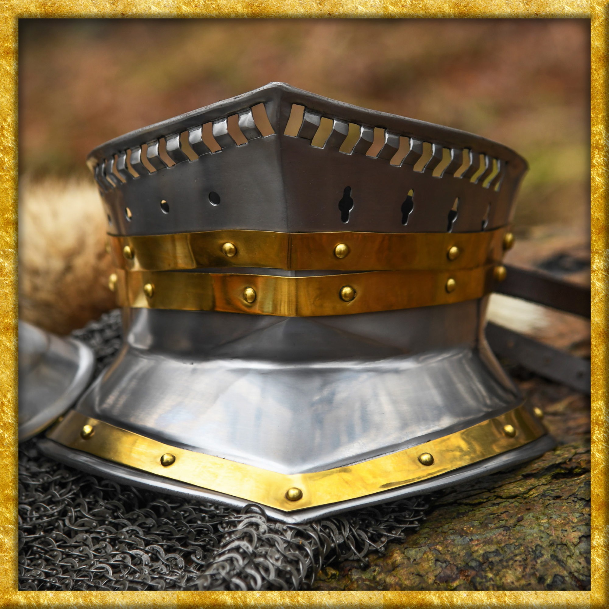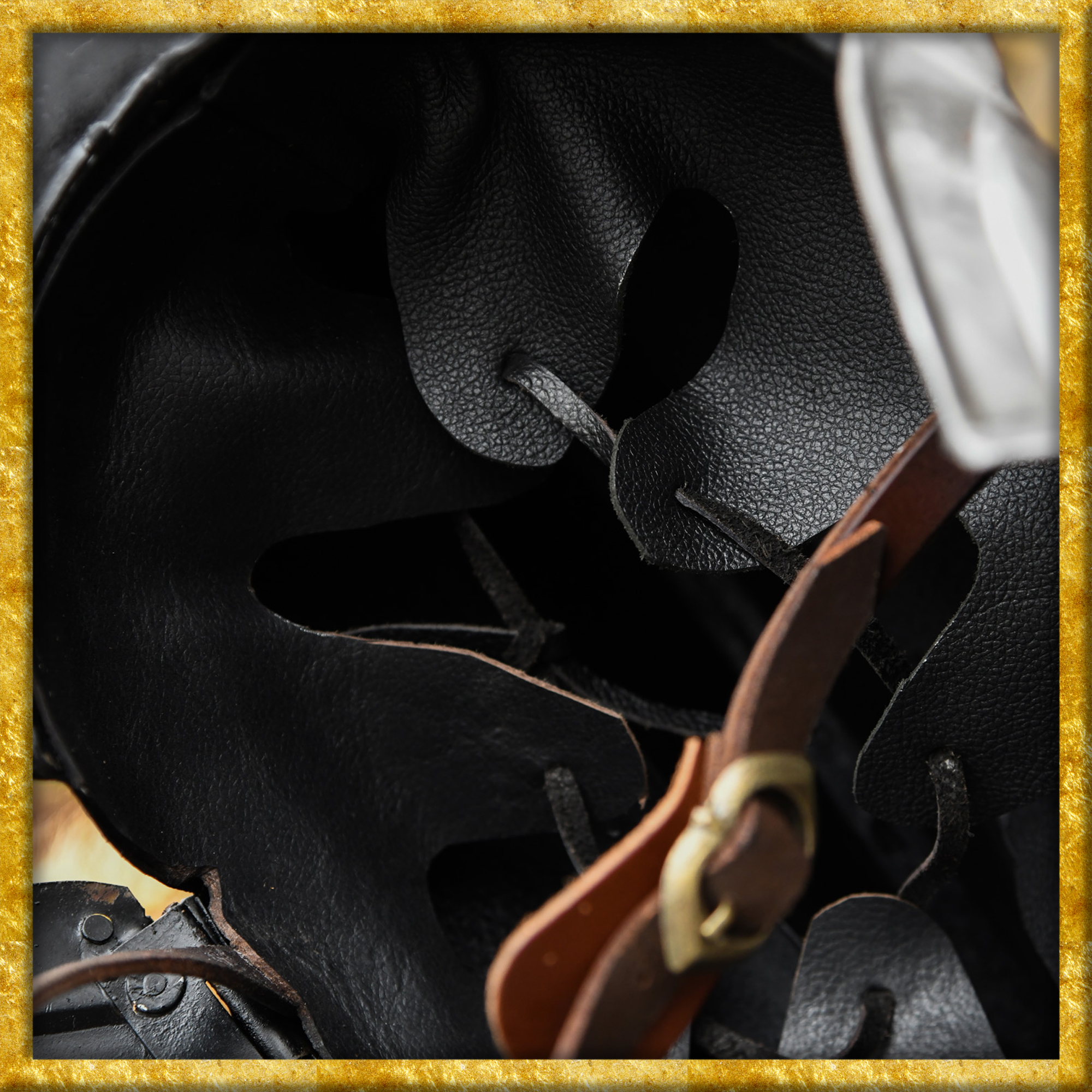Die zusätzliche Halsberge, auch Helmbart genannt, ist ebenfalls mit Messingelementen und messingfarbenen Nieten versehen, mit dreiteiligem Geschübe ausgearbeitet und wird mit einem Lederriemen vor das Kinn des Trägers und die Wangenklappen des Helmes geschnallt.Der Helm verfügt über ein ledernes Inlay mit Kinnriemen.