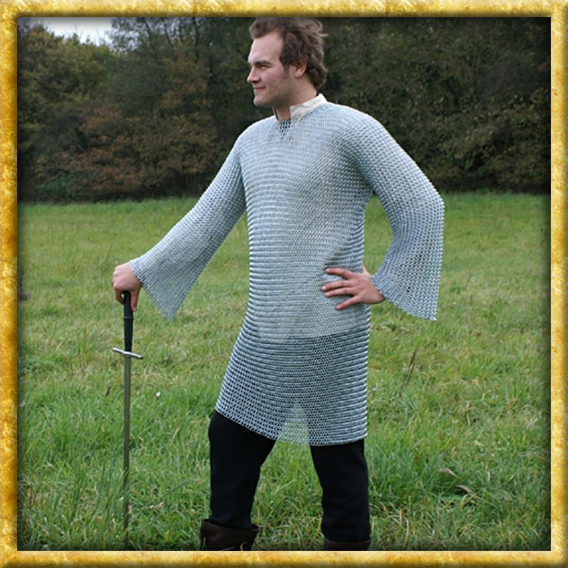 Dieses mittelalterliche Kettenhemd wurde aus aus galvanisch verzinkten, hochwertigen Kohlenstoffstahlringen hergestellt. Die Kettenringe wurden 4 in 1 handgeflochten, die typische mittelalterliche Art Kettenzeug zu flechten. Der Innendurchmesser der Kettenringe beträgt lediglich 9 mm.