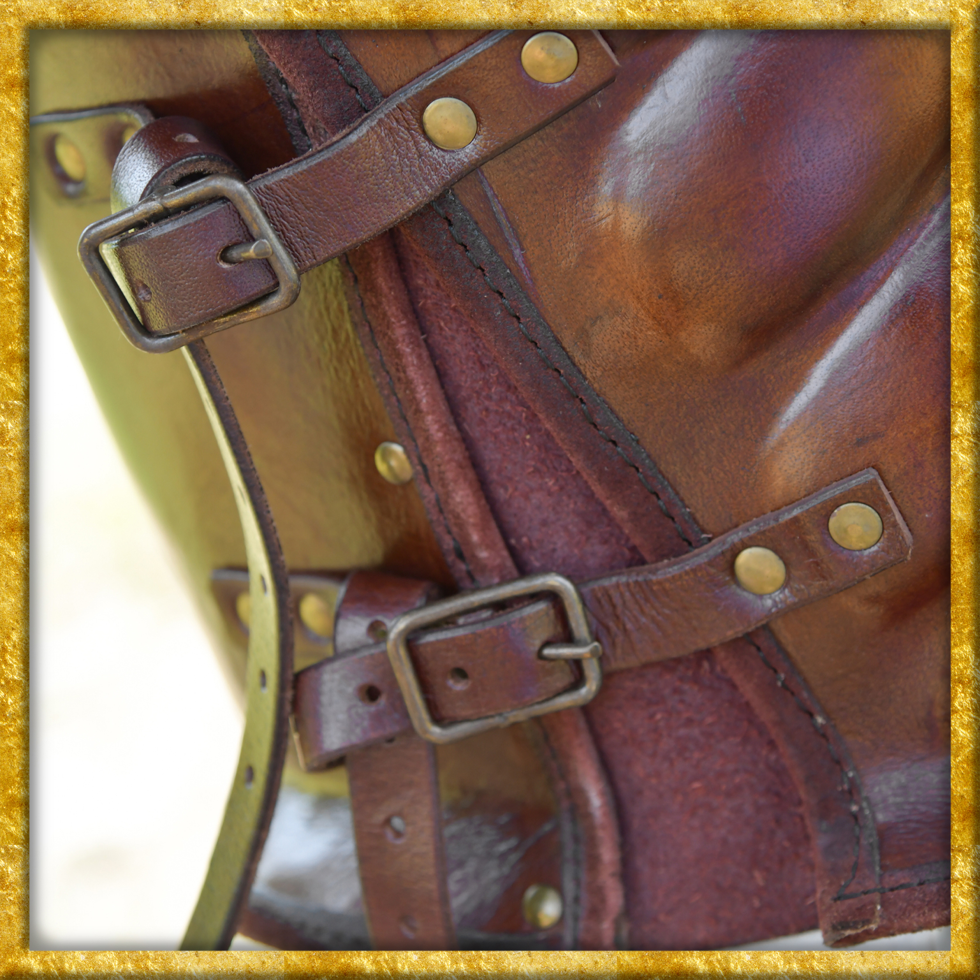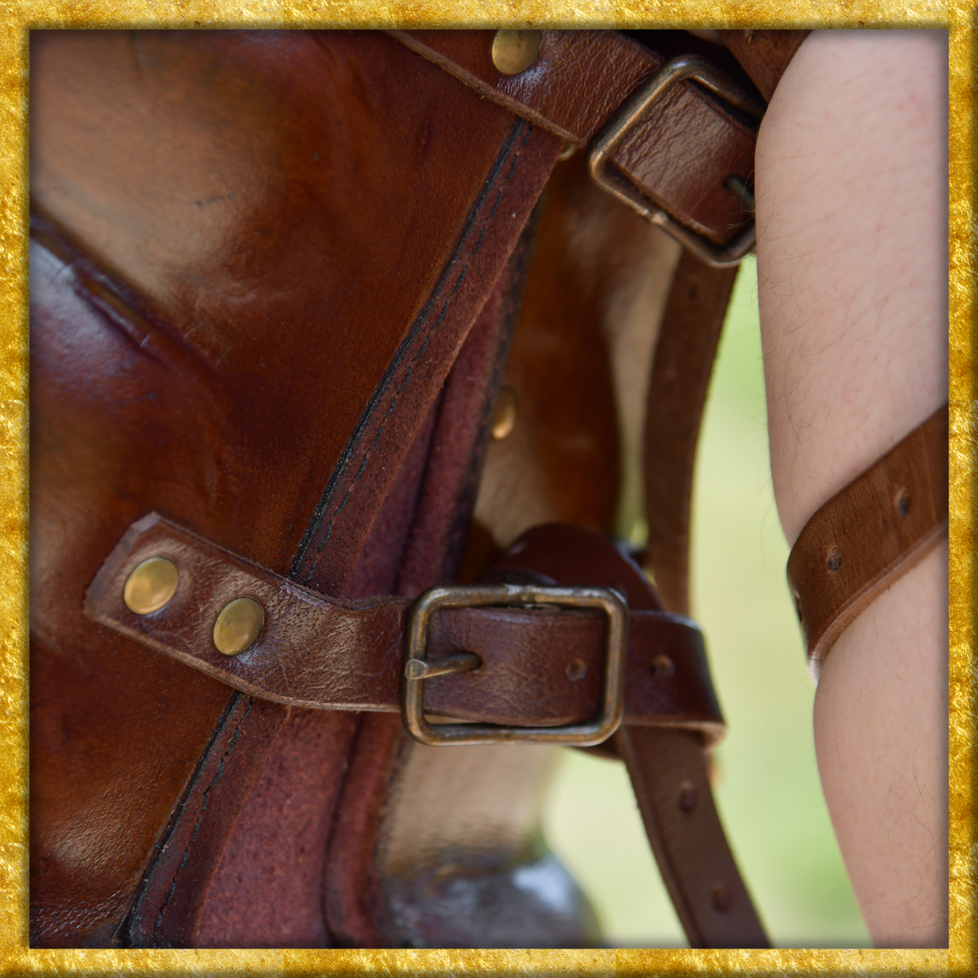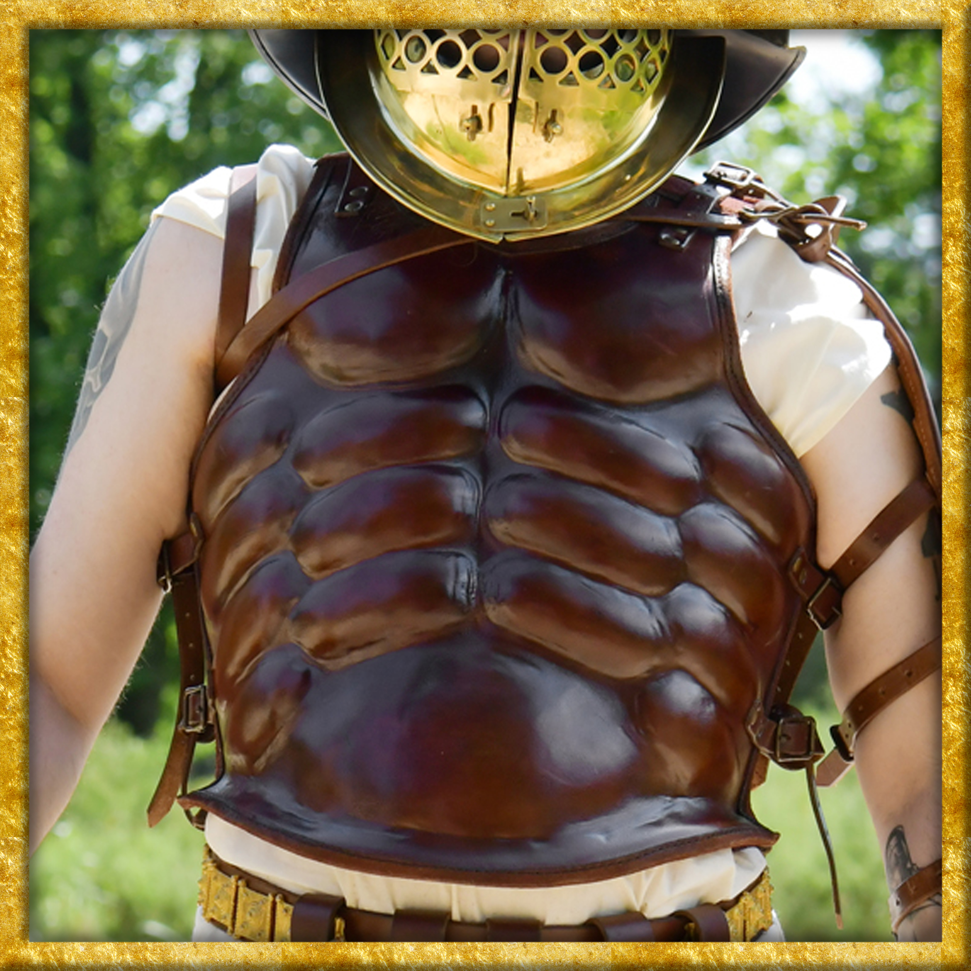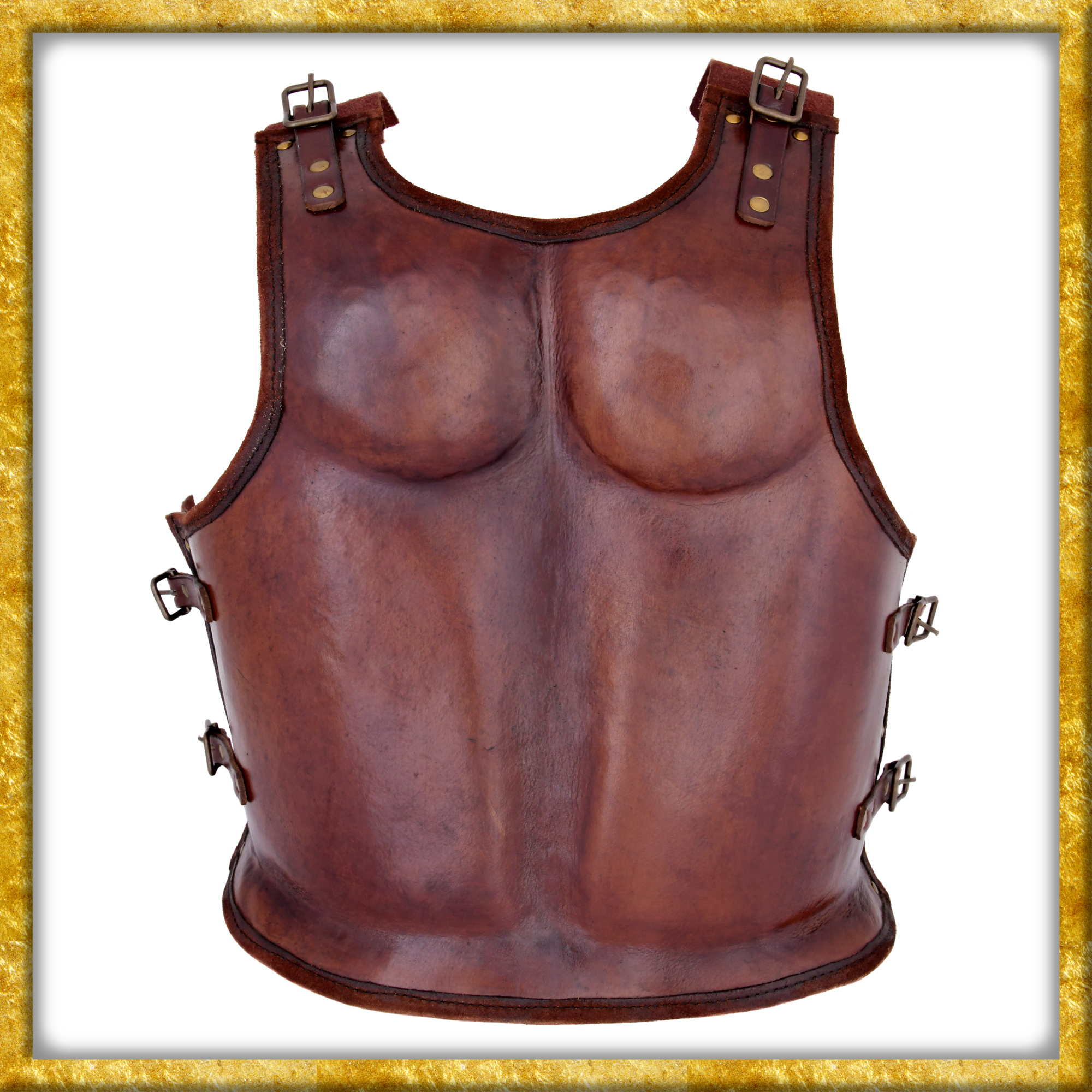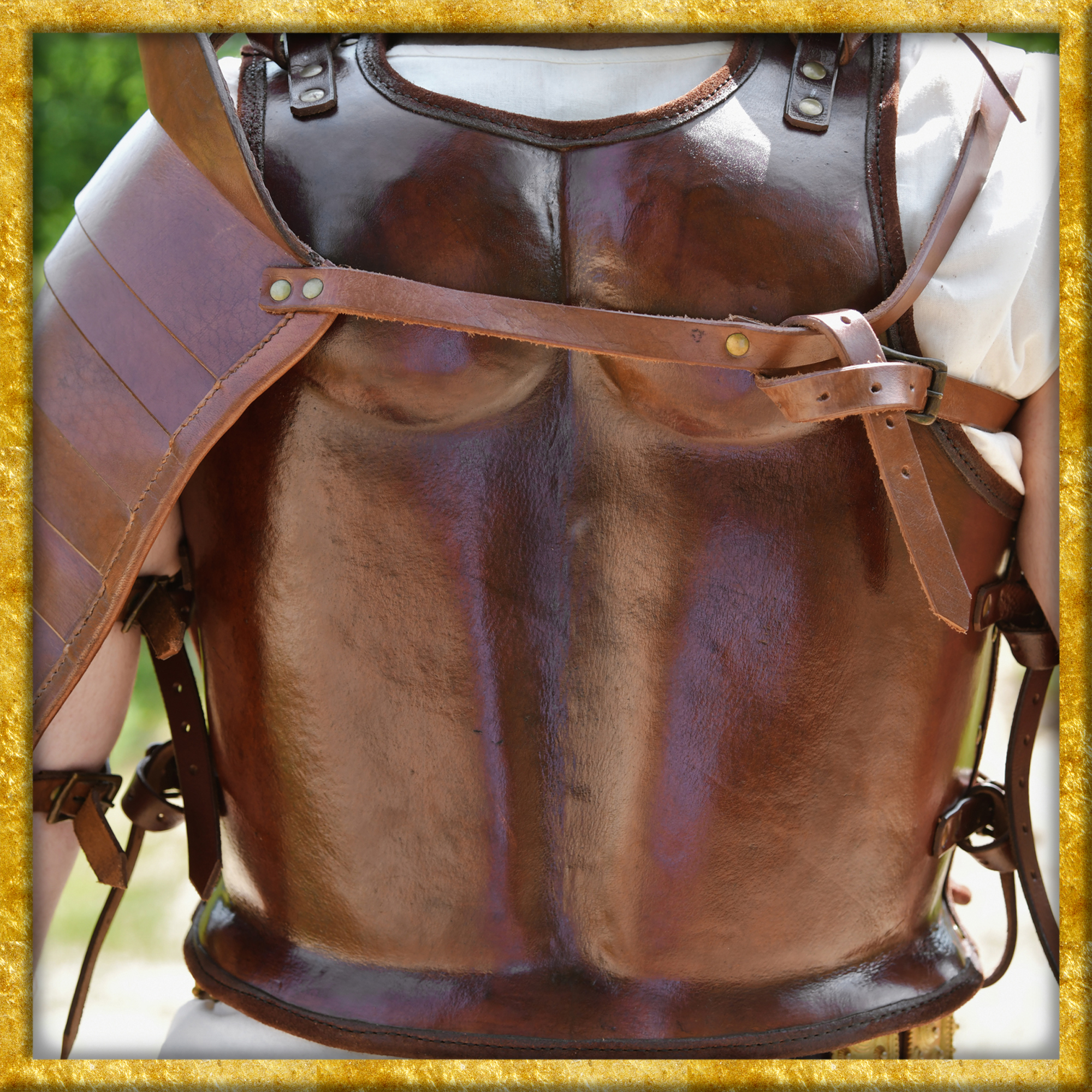 Dieser tragbare Muskelharnisch ist aus starkem Rindsleder hergestellt. Der Harnisch besteht aus einem Brustpanzer und einem Rückenpanzer samt 6 Lederriemen mit Schnallen zur individuellen Grössenverstellung. An den Rändern ist das Leder vernäht.