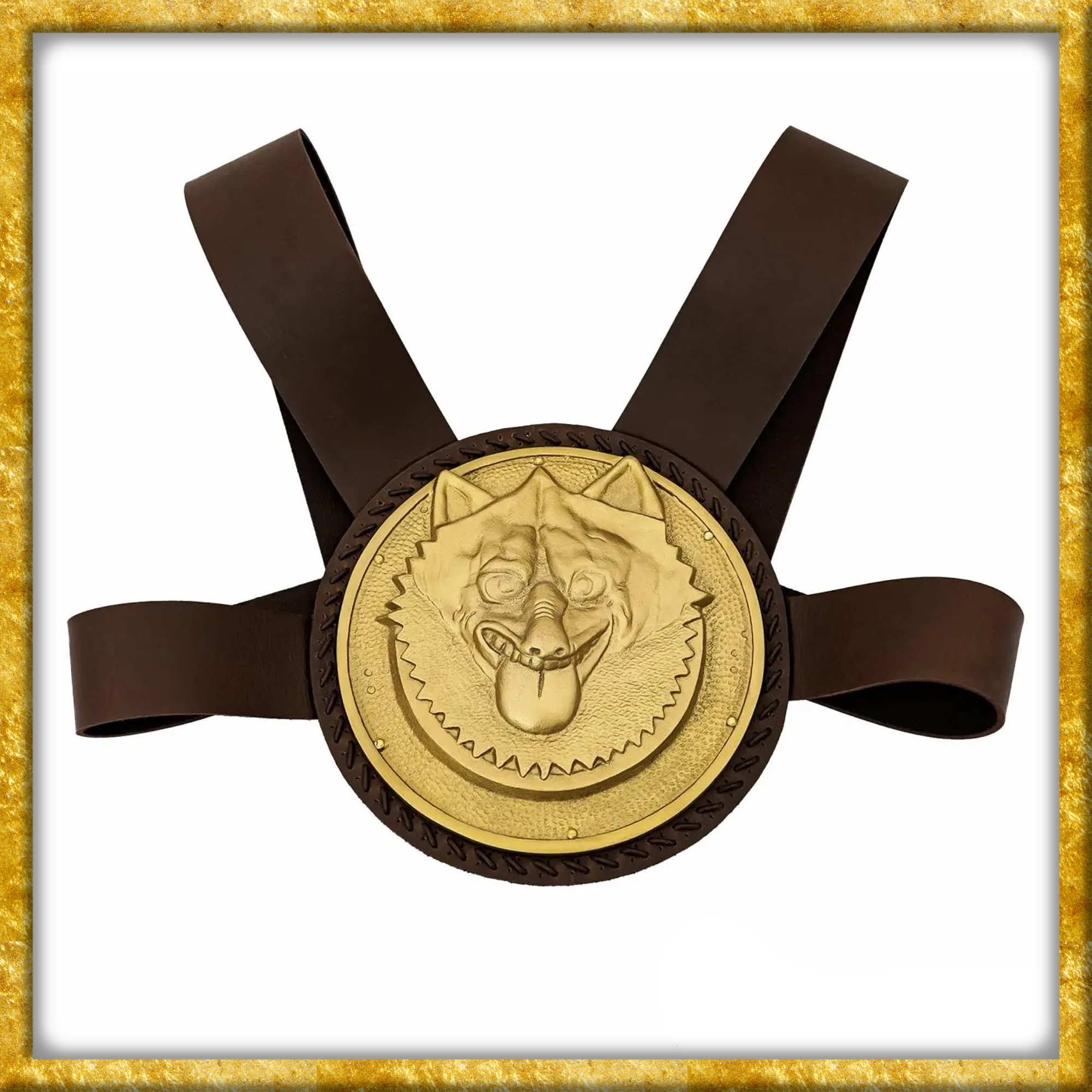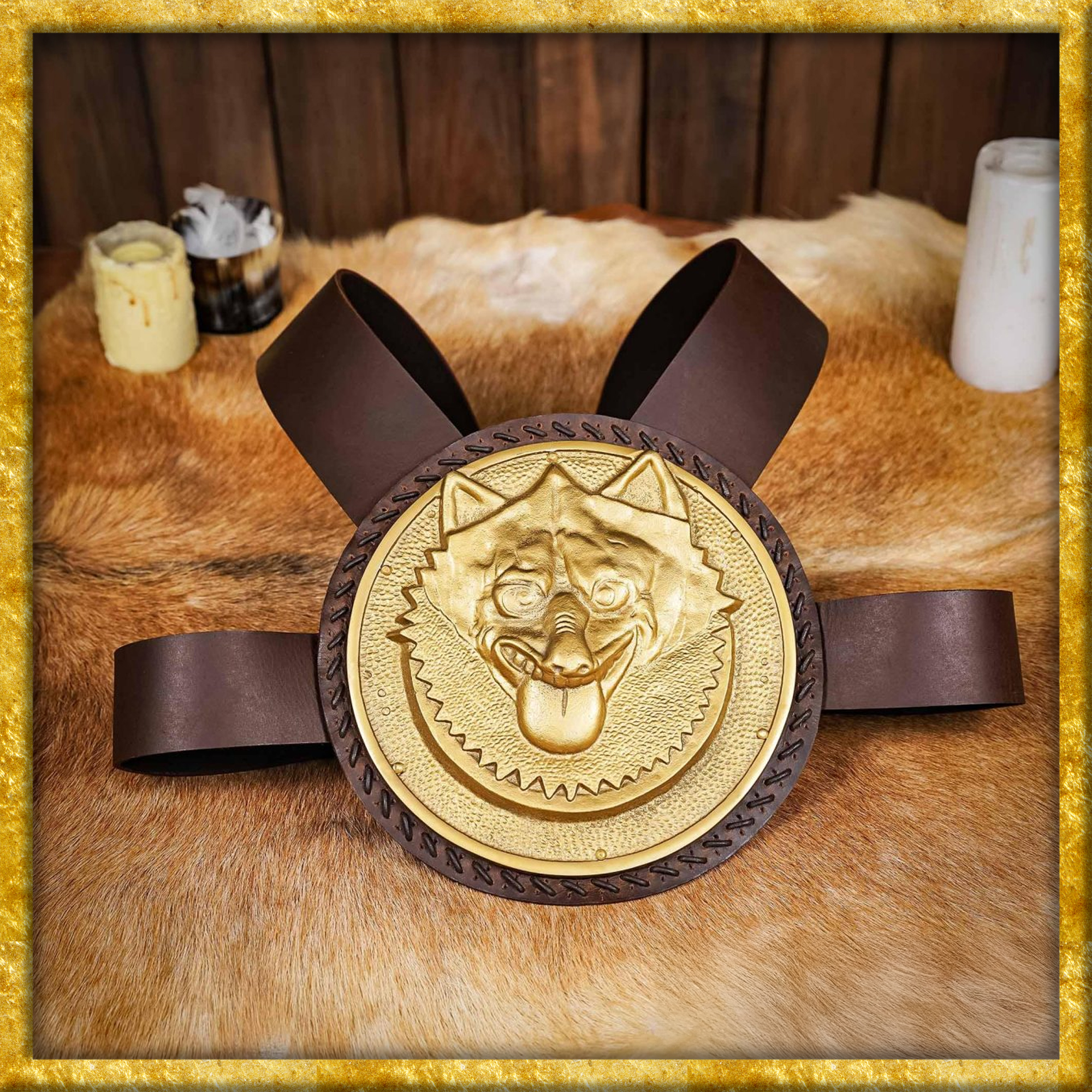 Werde zum unerschrockenen iberischen Krieger mit diesem beeindruckenden Cardiophylax! Dies ist eine runde Brustplatte aus festem, dunkelbraunem Leder vor, verziert mit einer massiven Messingplakette. Diese Plakette ist nicht irgendein Schmuckstück – es ist ein wilder iberischer Wolf mit heraushängender Zunge, ein Symbol für Stärke und Unbezähmbarkeit. Siehst du die detailliert ausgearbeiteten Gesichtszüge des Wolfskopfes und den verzierten, gravierten Rand der gesamten Plakette? All das ist Handarbeit, die diesem Stück einen einzigartigen Charakter verleiht. Die Plakette erinnert an eine römische Phalera, was dem Kardiofylax eine zusätzliche historische Tiefe verleiht.