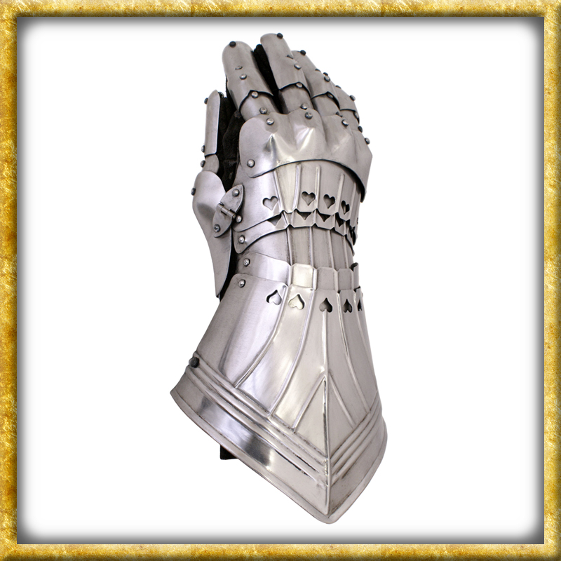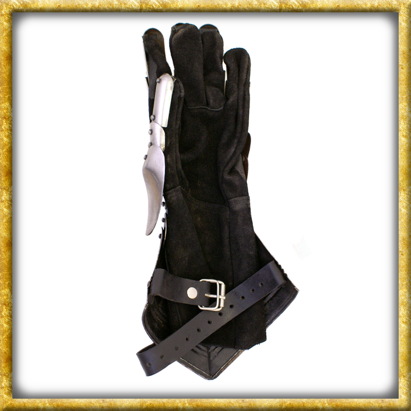 Dieses bewegliche und bequem tragbare Paar Plattenhandschuhe ist aus 1,3 mm starkem Rüstungsstahl geschmiedet. Innen ist ein Handschuh aus weichem Wildleder eingenäht und angenietet. Ausserdem gibt jeweils ein Lederriemen zusätzlichen Halt.