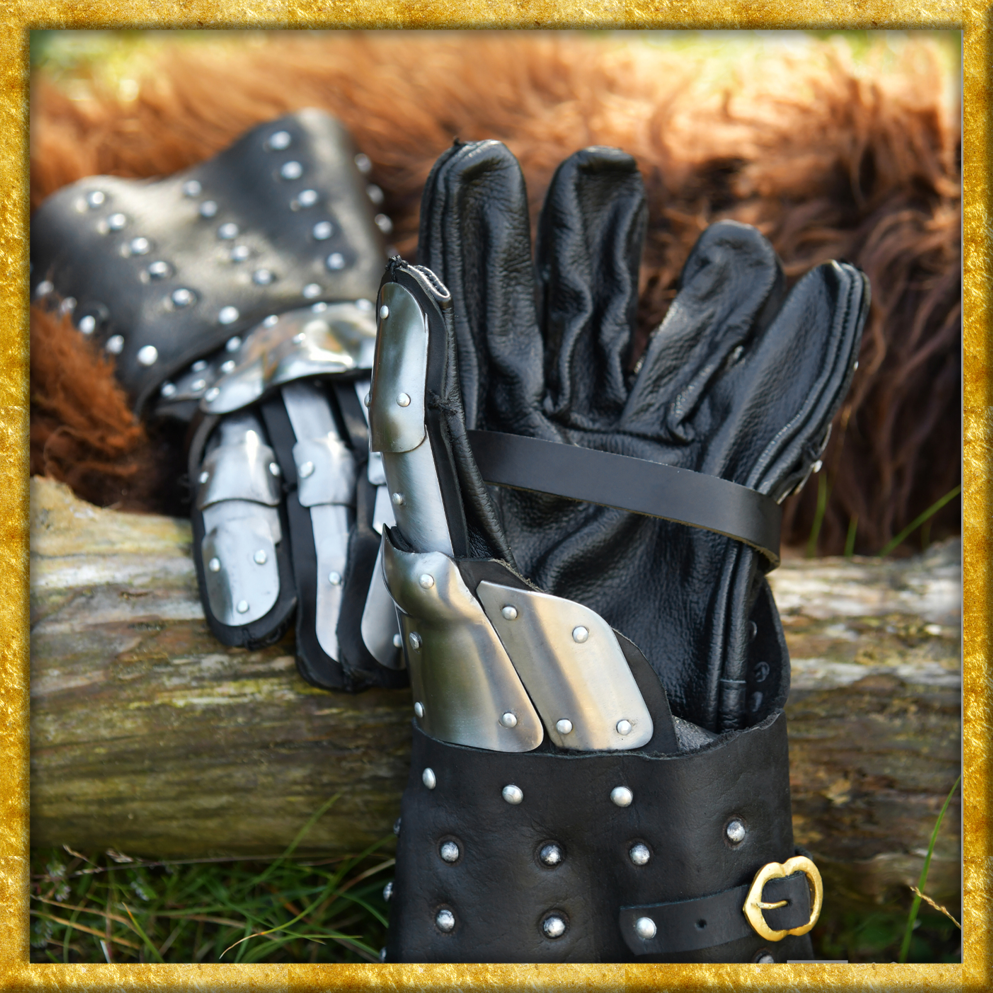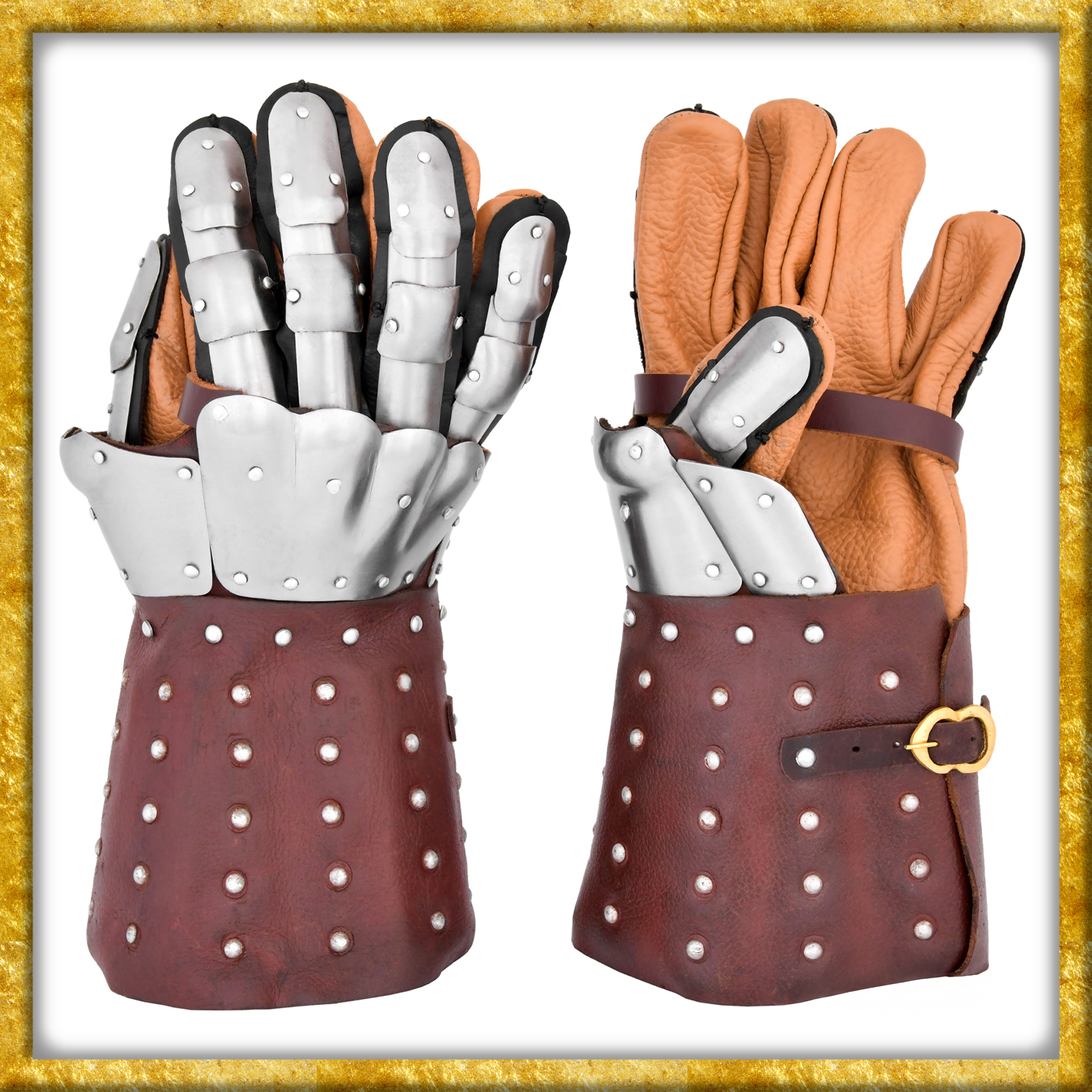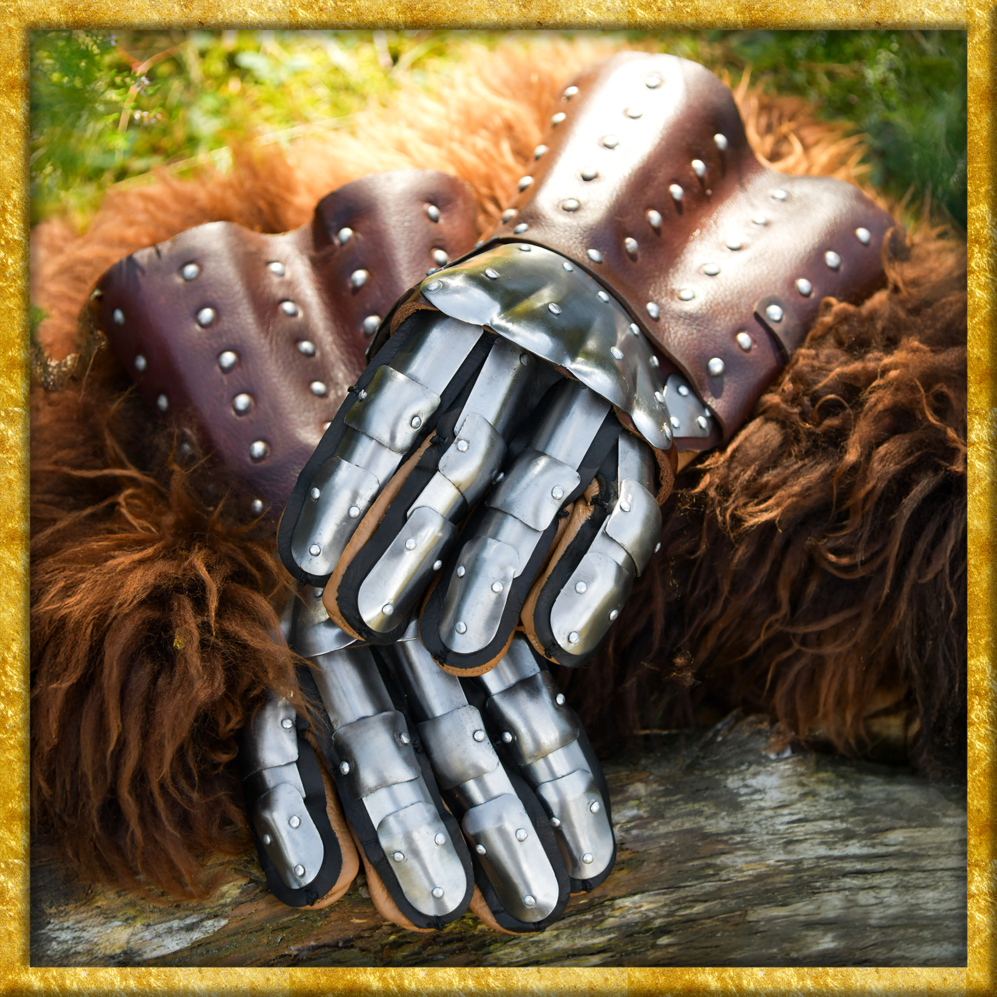 Diese gegliederten Leder- und Plattenhandschuhe bieten eine Kombination aus Schutz, Beweglichkeit und Tragekomfort. Sie passen am besten zu Spätmittelalter-Kulissen und sind für die Darstellung eines nordeuropäischen Kriegers aus dem 14. Jahrhundert besonders gut geeignet. Ein ideales Accessoire für Reenactment und LARP.