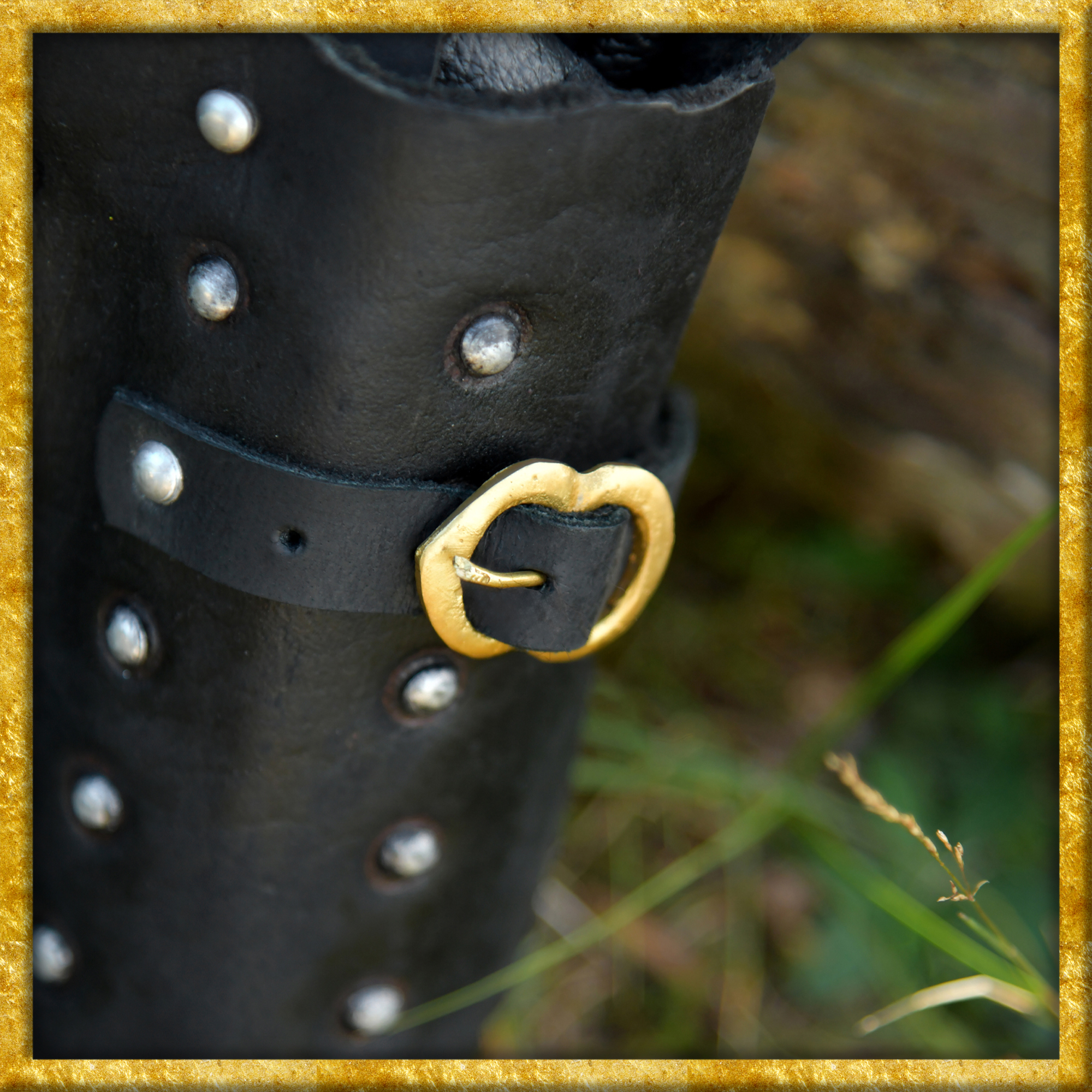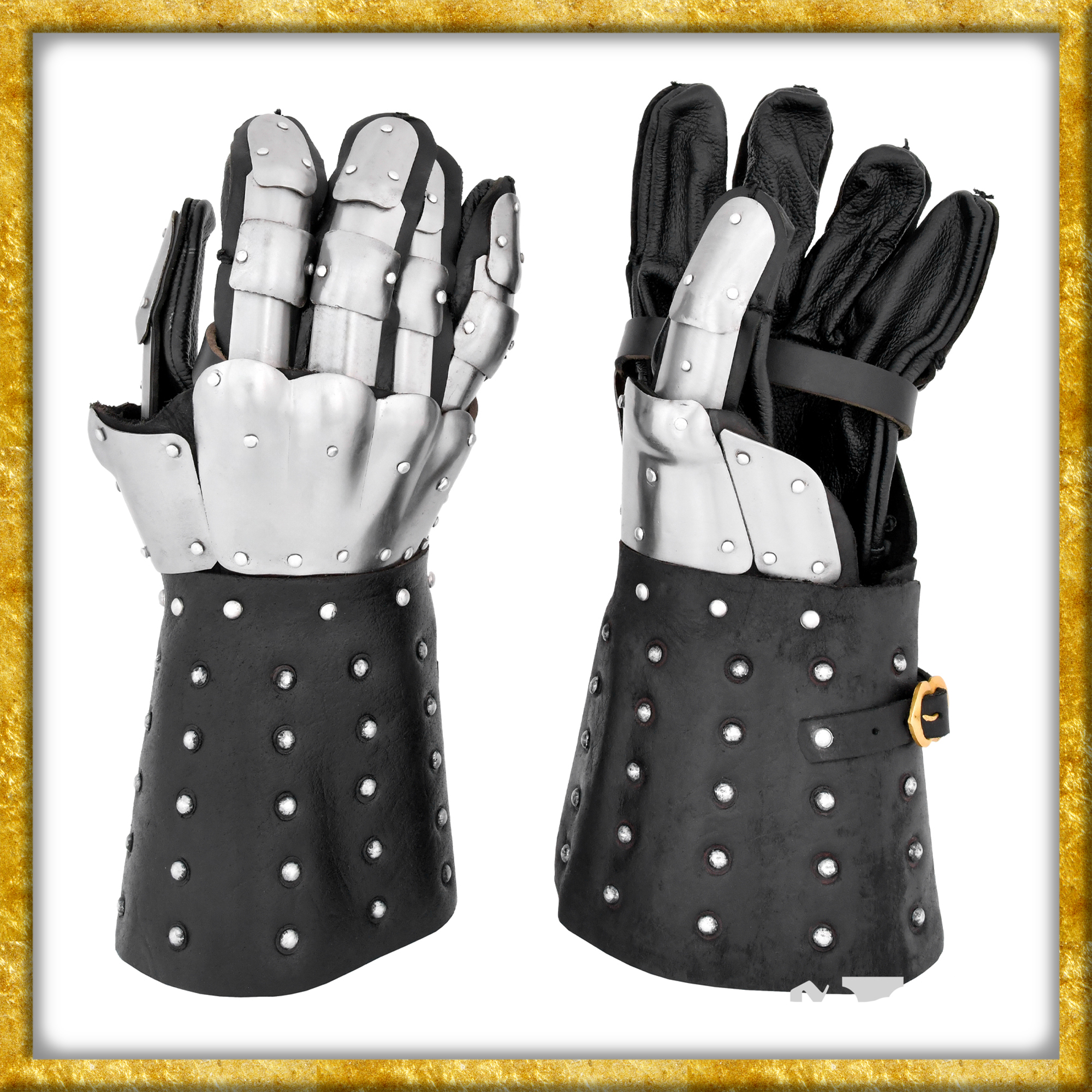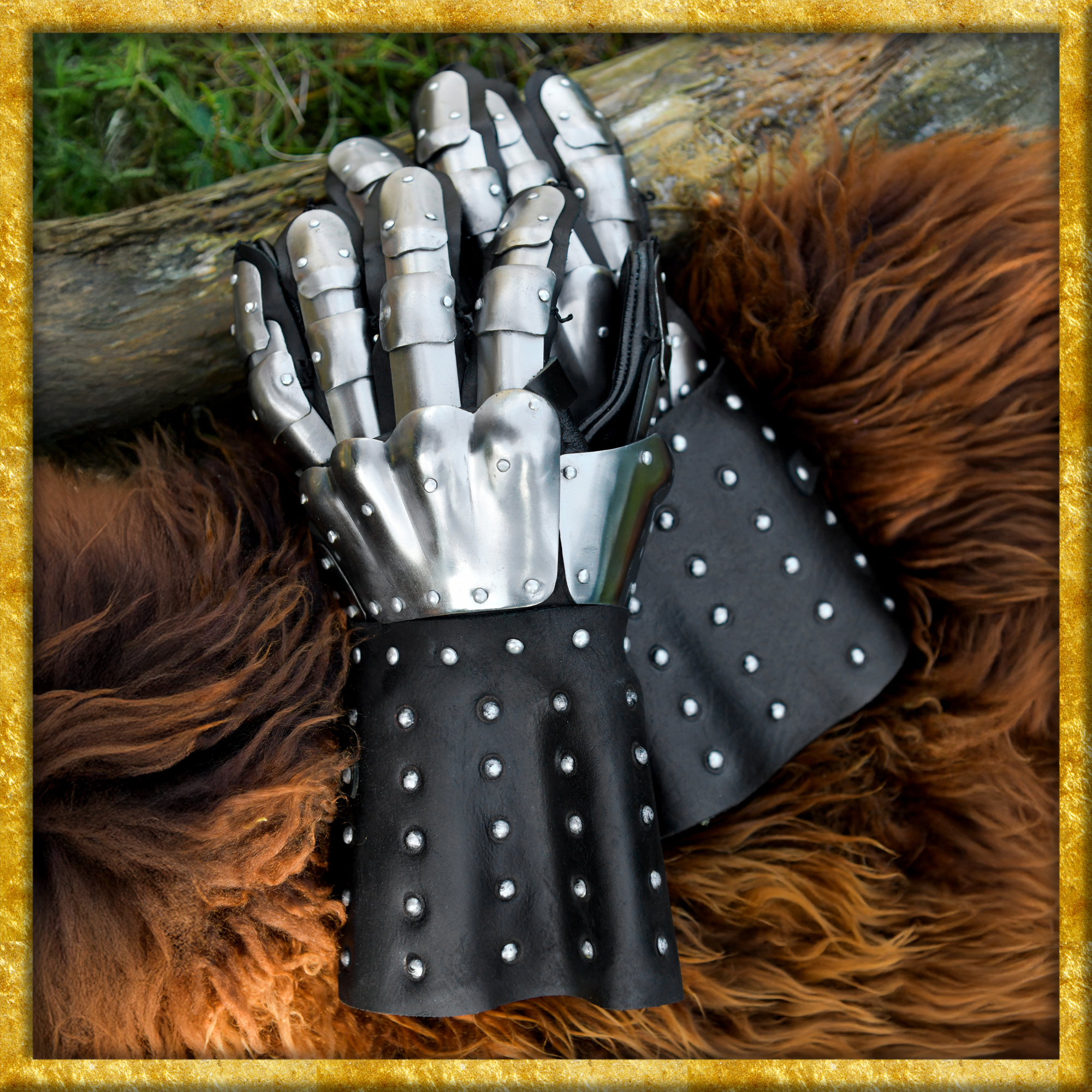 Diese gegliederten Leder- und Plattenhandschuhe bieten eine Kombination aus Schutz, Beweglichkeit und Tragekomfort. Sie passen am besten zu Spätmittelalter-Kulissen und sind für die Darstellung eines nordeuropäischen Kriegers aus dem 14. Jahrhundert besonders gut geeignet. Ein ideales Accessoire für Reenactment und LARP.