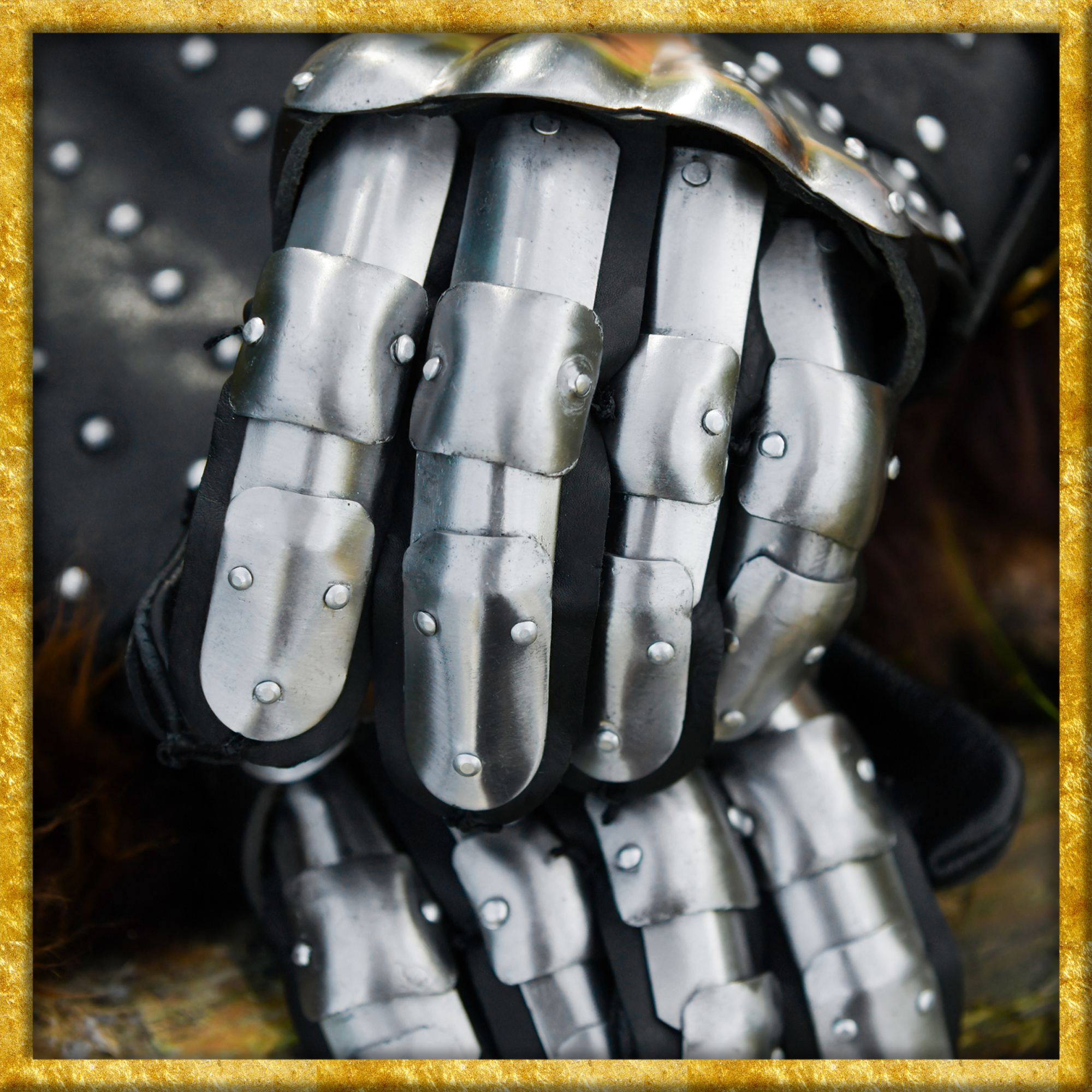 Diese Panzerhandschuhe sind aus 2mm starkem Leder und 1,2mm Stahl gefertigt. Das Obermaterial ist aussenseitig mit angenieteten Metallplatten ausgestattet, die den Handrücken und alle fünf Finger vollständig bedecken. Innenseitig ist ein Handschuh aus geschmeidigem Leder eingenietet. Die lange, angenietete Manschette ist innen mit länglichen Stahlplättchen verstärkt und besitzt einen verstellbaren Lederriemen mit Messingschnalle für eine bequeme, individuelle Passform am Handgelenk.