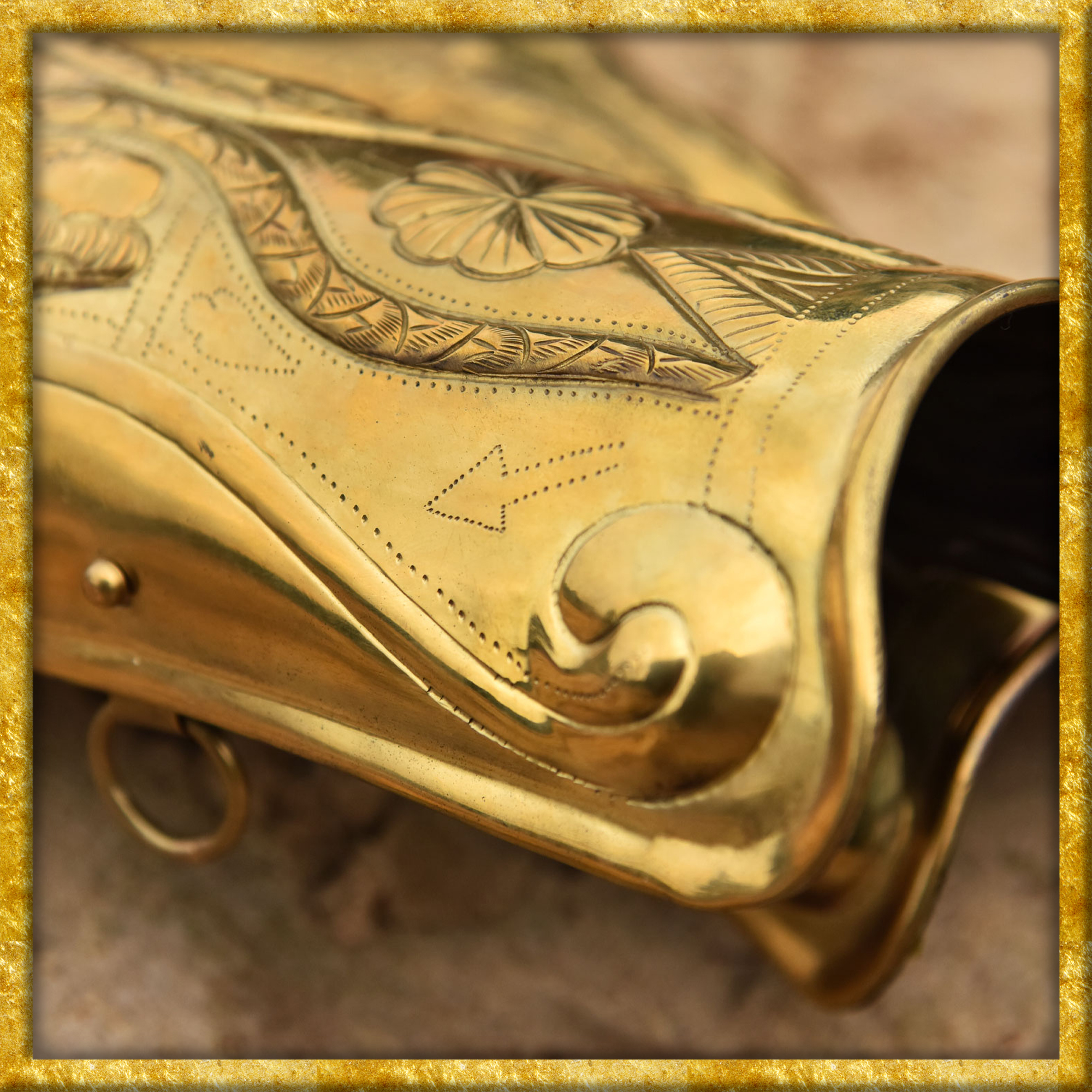 Diese beweglichen, völlig tragbaren römischen Beinschützer sind aus ca. 1mm starkem Messing gefertigt und innenseitig geschwärzt. Schienbeine und Kniebuckel sind mittels Scharnieren miteinander verbunden und bieten so die nötige Bewegungsfreiheit.