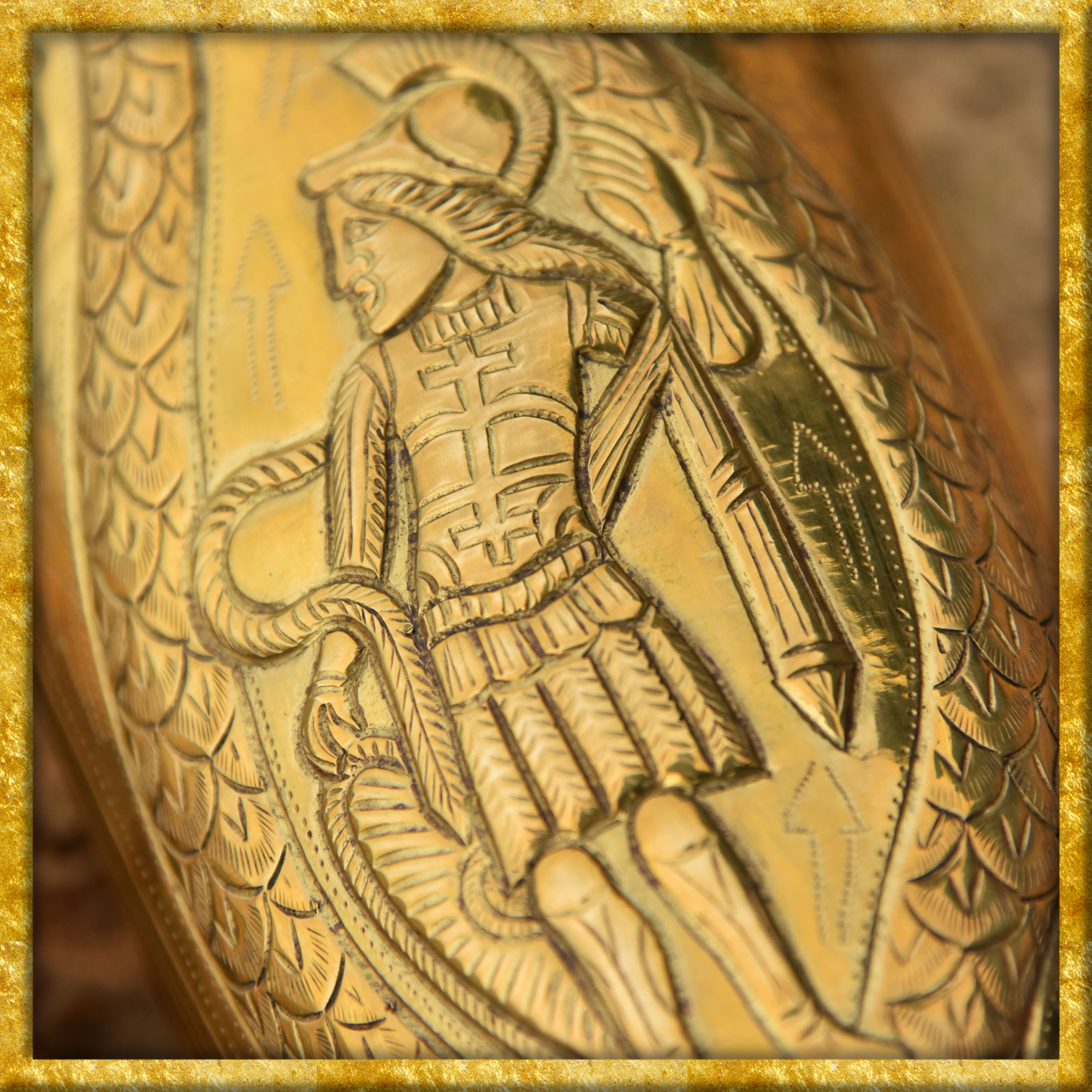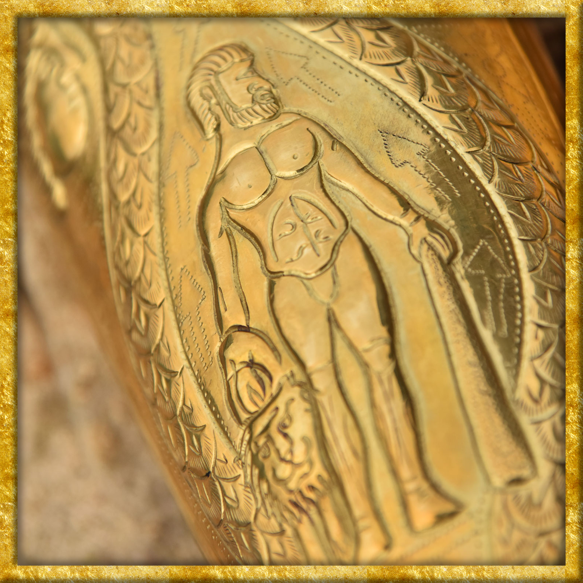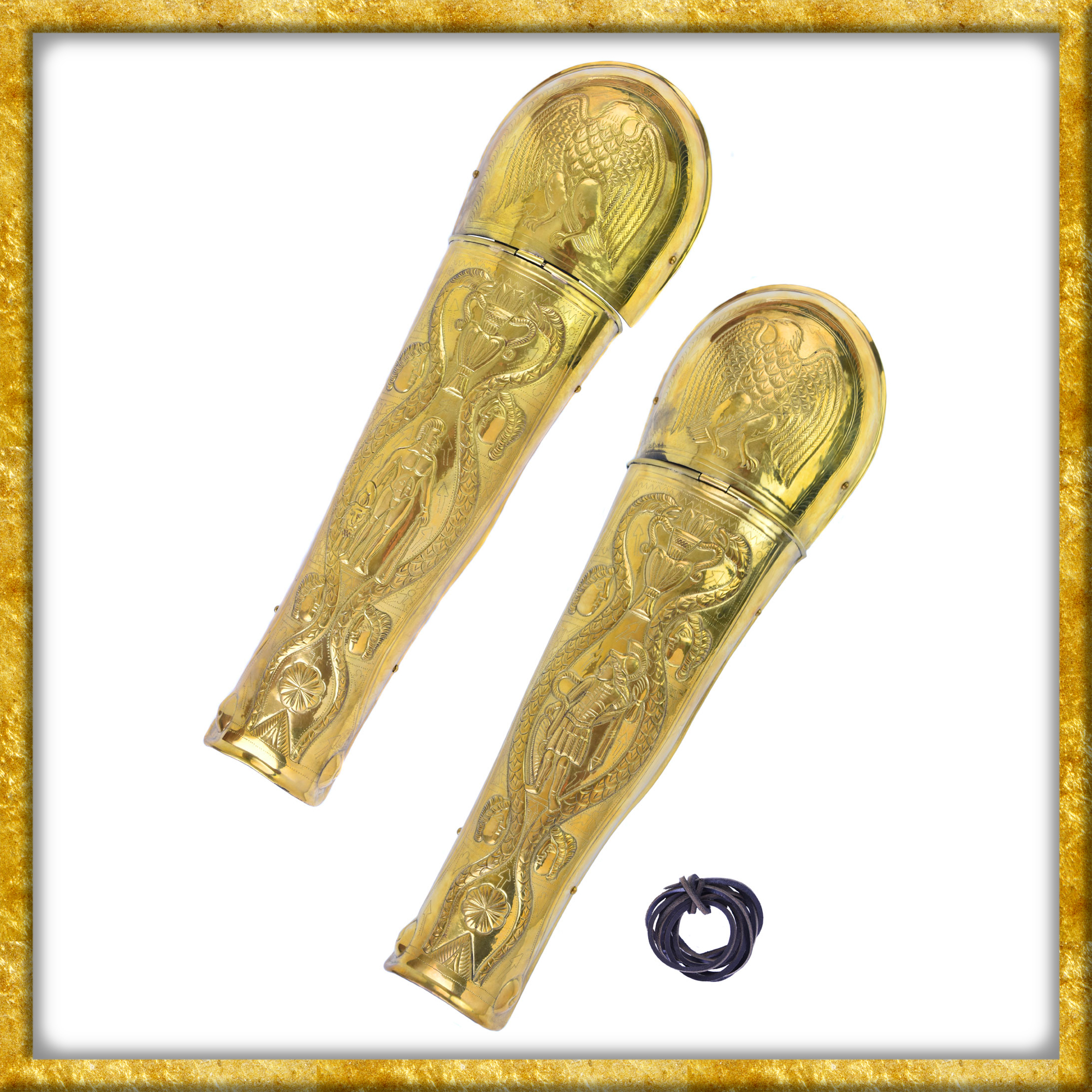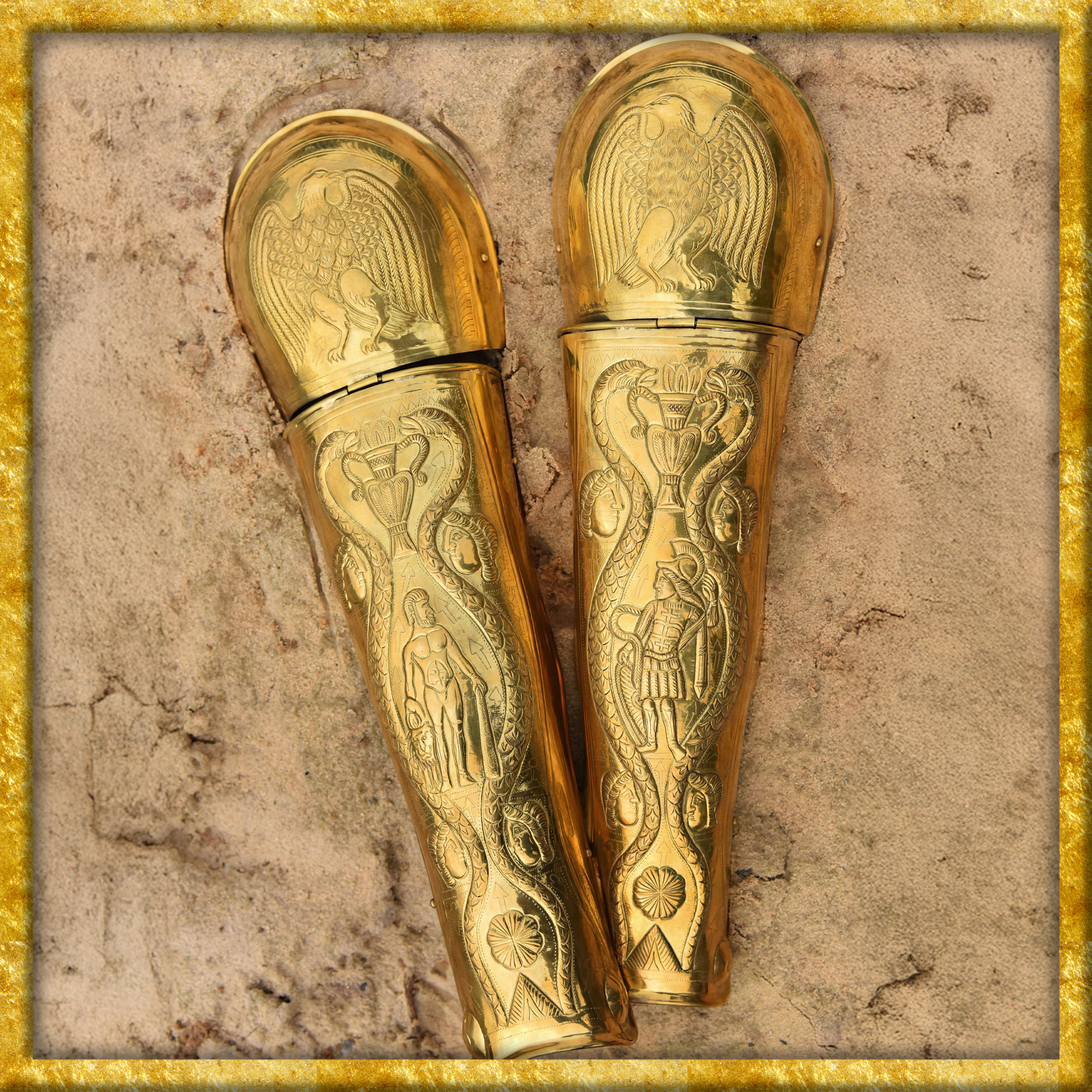 Dieses wunderschöne römische Beinzeug ist mit aufwendigen Prägungen verziert. Während die eine Schiene mit einem Soldaten der Garde und Schlangenwesen geschmückt ist, ist auf der anderen Schiene Herkules - ebenfalls von Schlangen umrahmt - zu sehen. Beide Kniebuckel zeigen den römischen Adler.