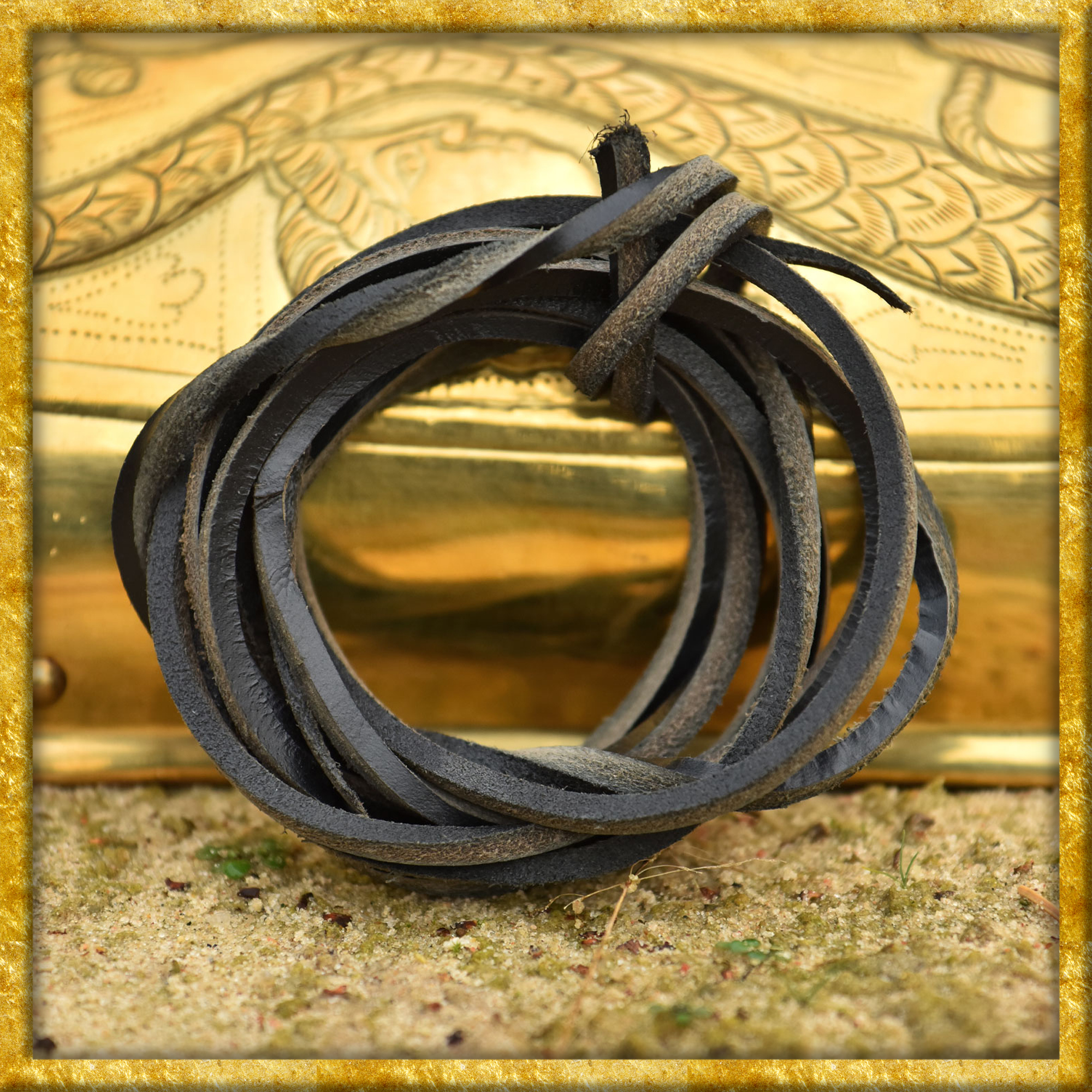 Die Beinschienen sind auf jeder Seite mit drei Ösen aus Messing gesäumt und werden mit viereckigen, 3mm starken Lederbändern verschnürt, mit denen sich die gewünschte Grösse passgenau einstellen lässt. Die Gesamtlänge der Beinschienen beträgt ca. 59cm und 40cm ohne die Kniebuckel. Die Breite der Öffnung an der Wade beträgt ca. 13 cm, die Breite der Öffnung am Knöchel ca. 9 cm. Die Masse der Kniebuckel sind ca. 17 x 16.5 cm. Die Bänder sind im Lieferumfang enthalten.