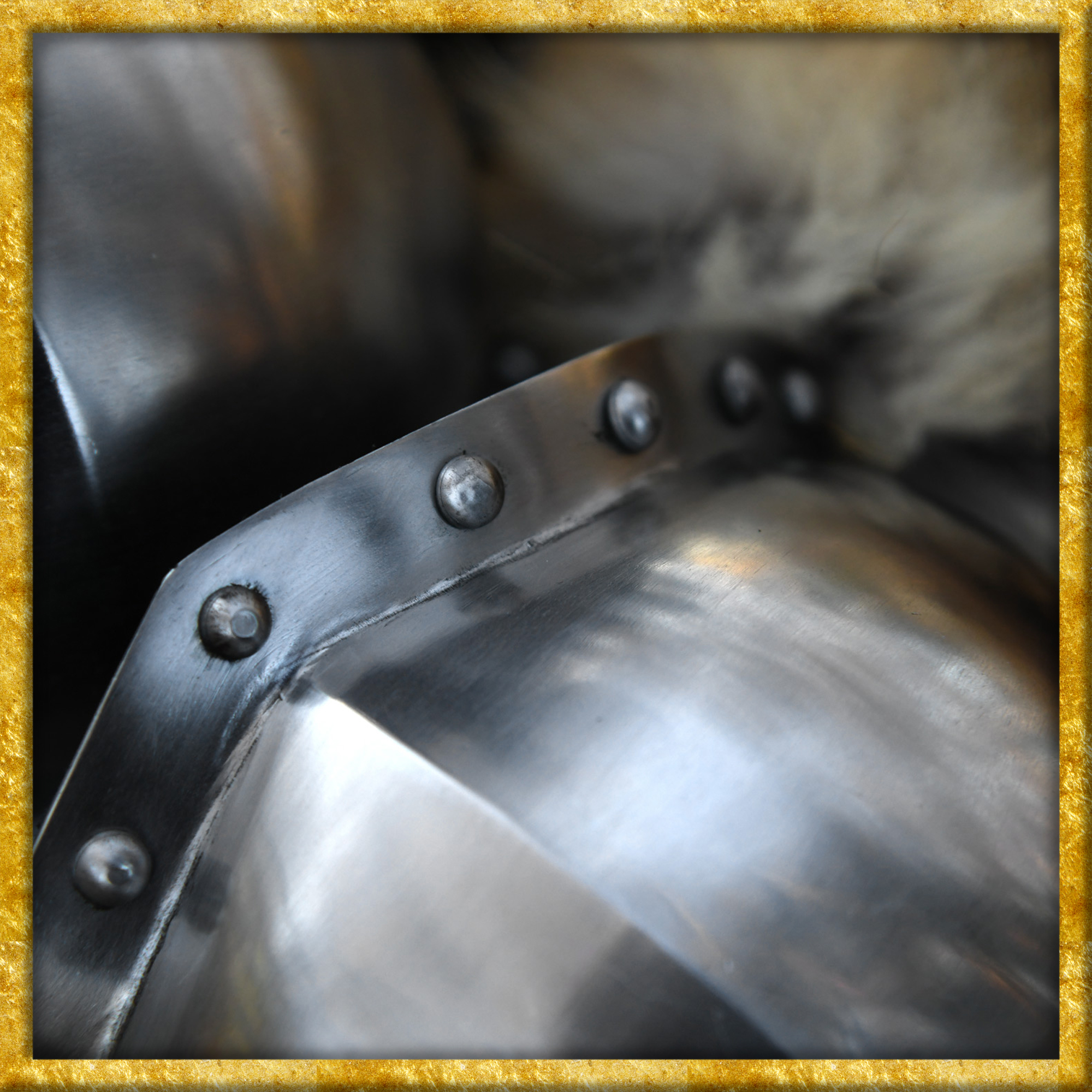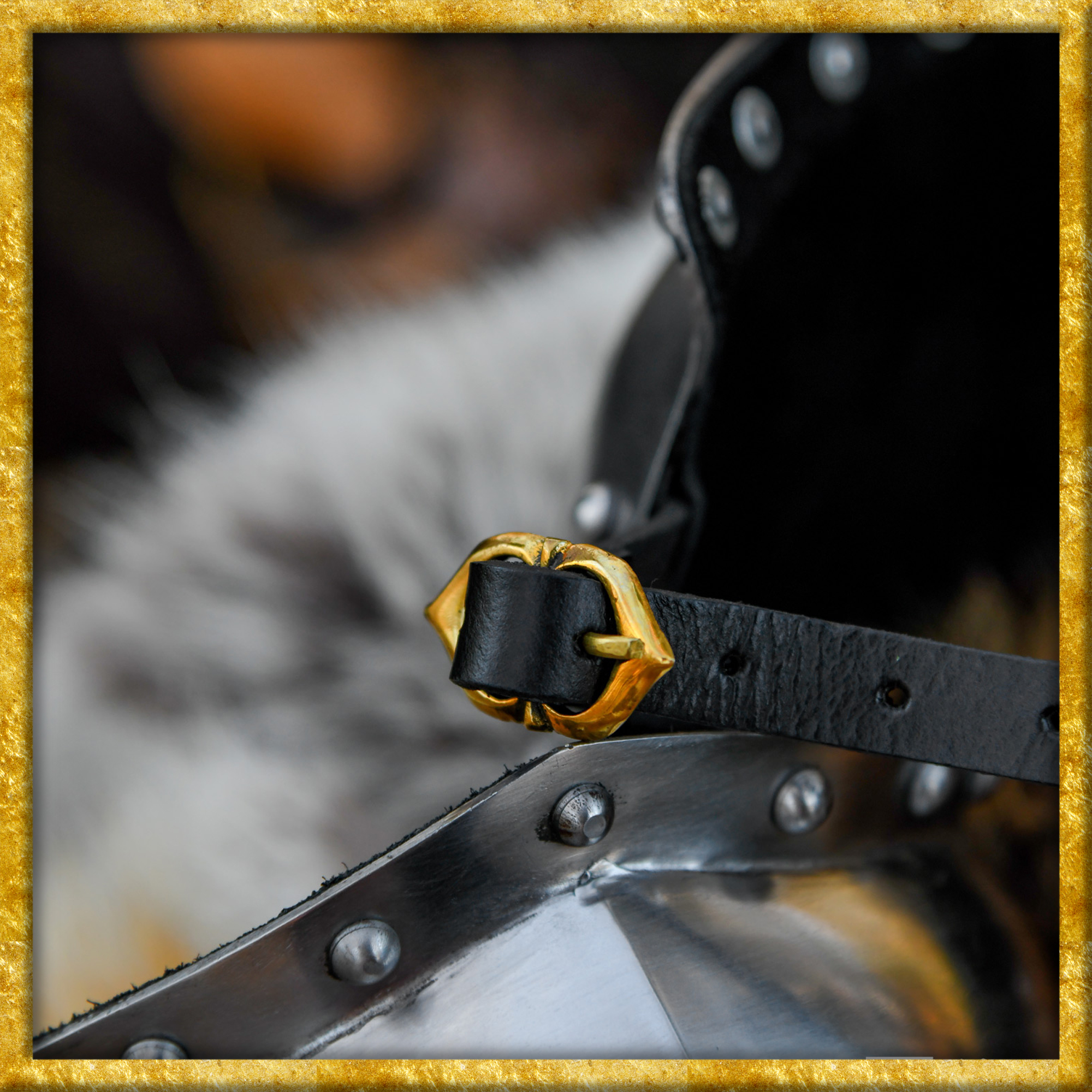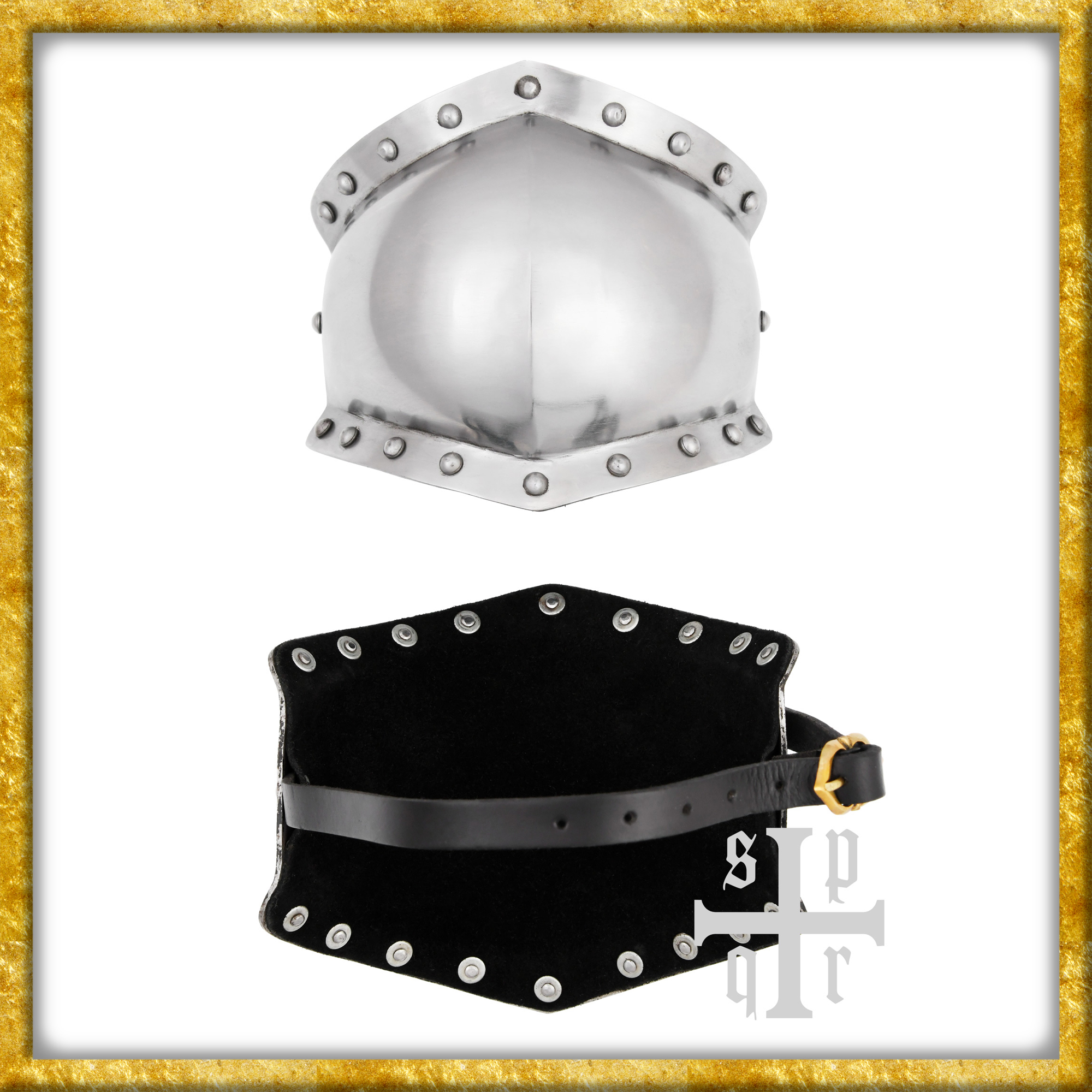 Diese tragbare Rekonstruktion einer Plattenrüstung für die Knie, wie sie im 15. Jahrhundert getragen wurde, ist aus 2mm starkem Stahl geschmiedet. Rückseitig sind die Kniekacheln mit einer angenieteten Lage aus weichem, schwarzem Veloursleder ausgekleidet, und für eine individuelle Gröddenanpassung mit einem verstellbaren Riemen aus Leder mit Messingschnalle ausgestattet. Die Tiefe der Wölbung beträgt 6cm.