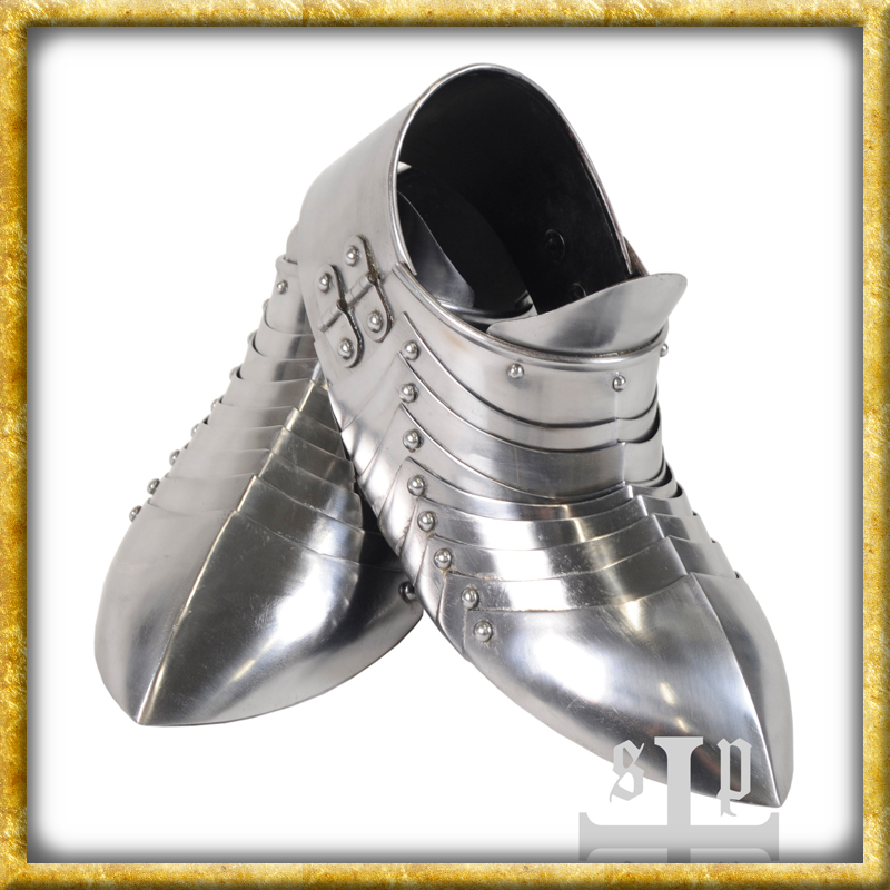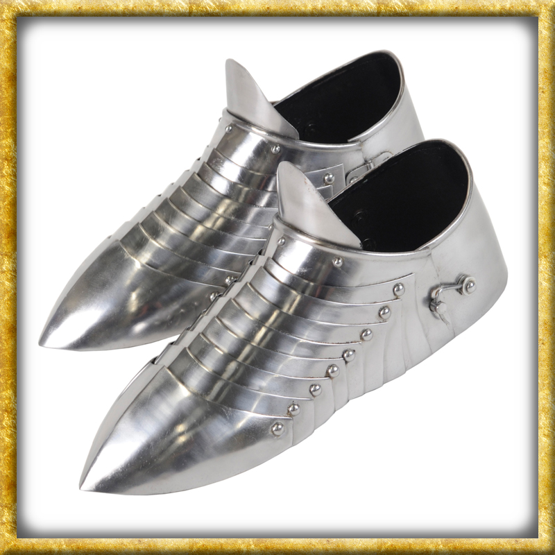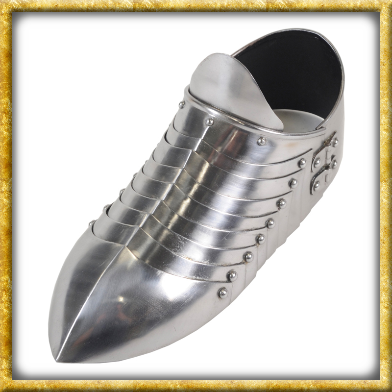 Diese tragbare, bewegliche Plattenrüstung für die Füsse ist Vorbildern aus dem 14. Jahrhundert nachempfunden. Die Eisenschuhe sind aus 1,5mm Stahl handgeschmiedet, zum besseren Schutz vor Korrosion innenseitig geschwärzt und an der Unterseite mit Lederriemen ausgestattet. Sie sind ohne Sohlen und bestehen aus einer spitz zulaufenden, jedoch leicht abgerundeter Zehenkappe, mehreren Schüben vom Ballen bis zum Knöchel, einer Lasche und einer Fersenkappe. Alle Elemente sind mittels stabiler Nieten miteinander verbunden.