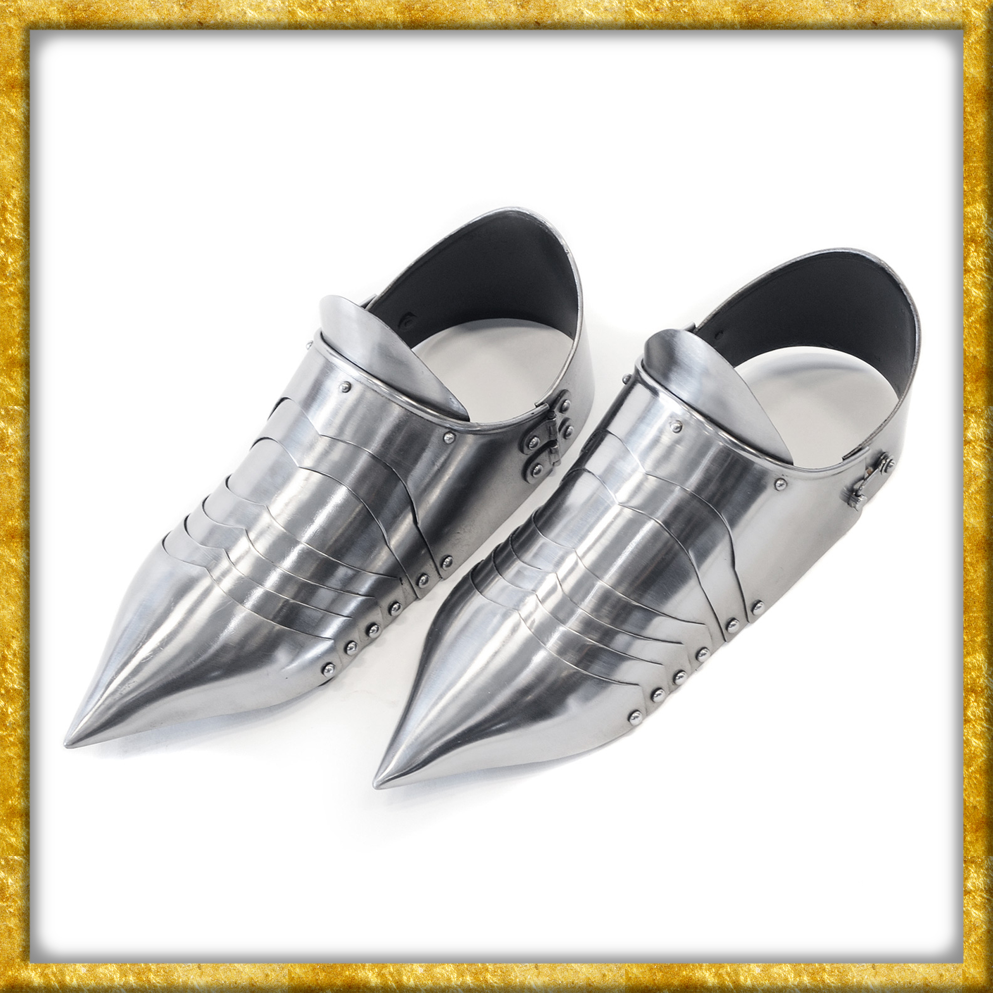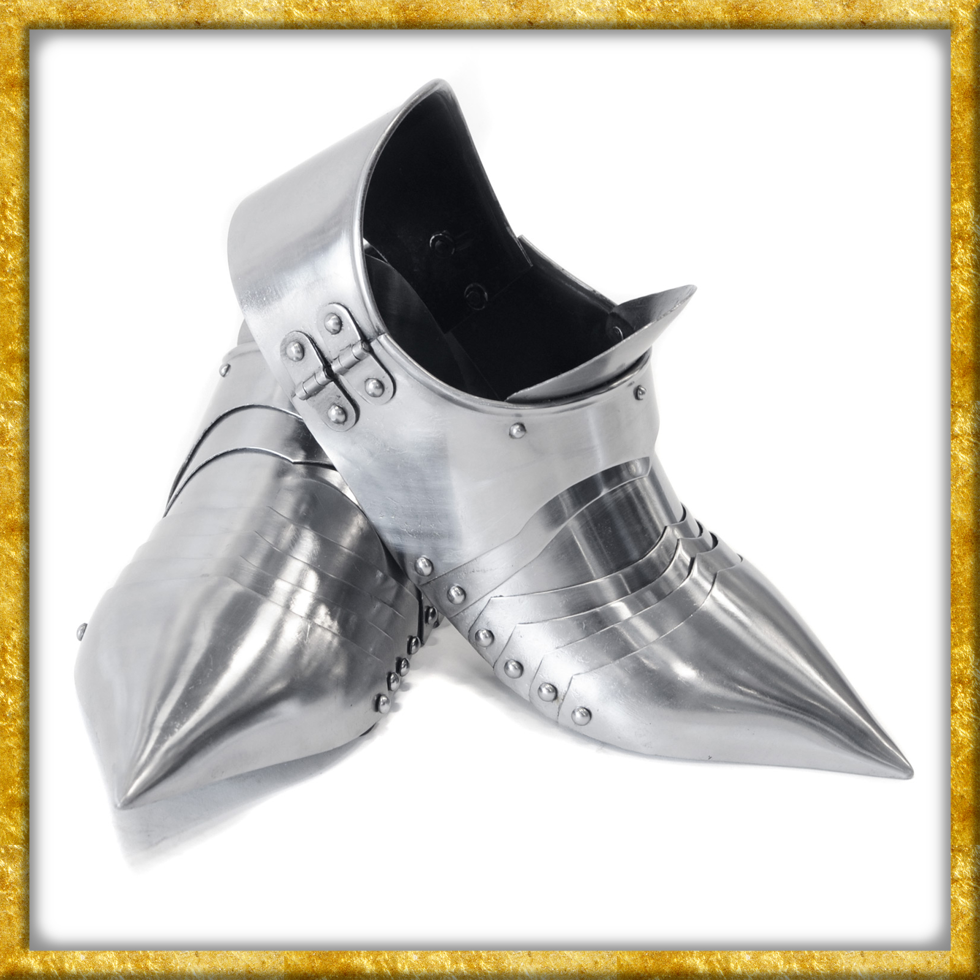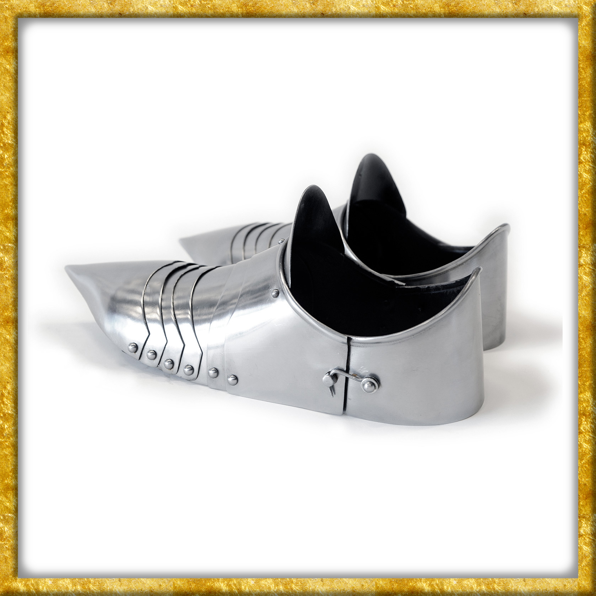 Diese tragbare, bewegliche Plattenrüstung für die Füsse ist Vorbildern aus dem 14. Jahrhundert nachempfunden. Die Eisenschuhe sind aus 1,5 mm Stahl handgeschmiedet, zum besseren Schutz vor Korrosion innenseitig geschwärzt und an der Unterseite mit Lederriemen ausgestattet. Sie sind ohne Sohlen und bestehen aus einer spitzen Zehenkappe, mehreren Schüben vom Ballen bist zum Knöchel, einer Lasche und einer Fersenkappe. Alle Elemente sind mittels stabiler Nieten miteinander verbunden.