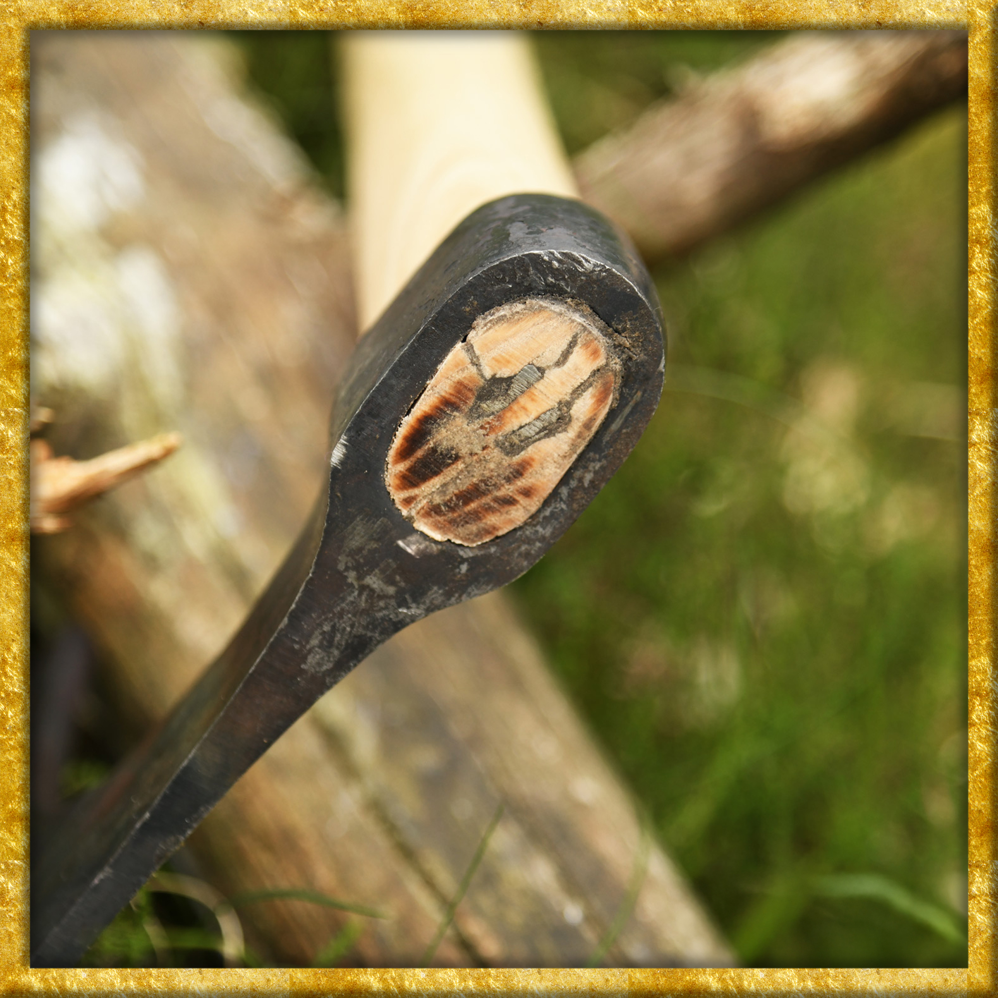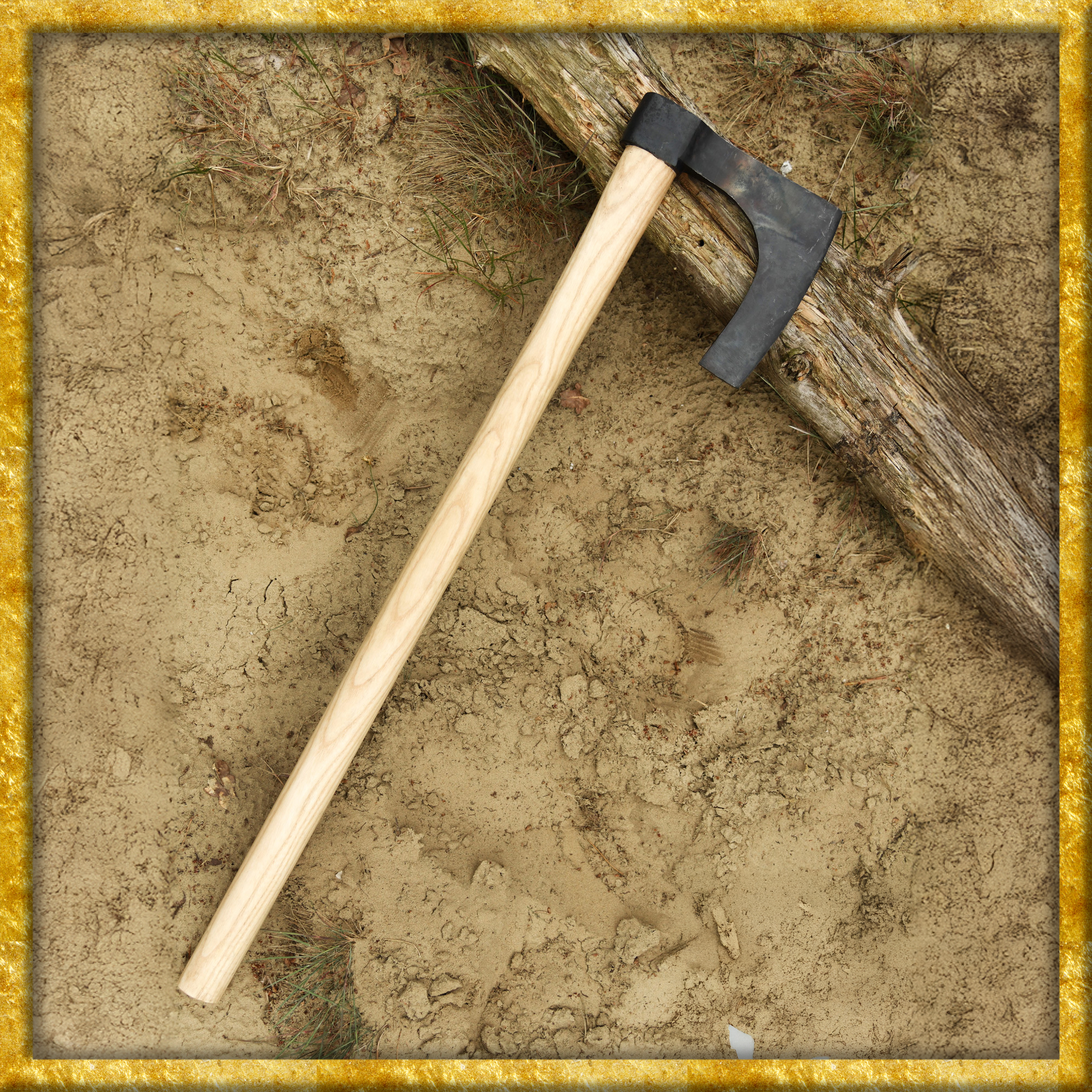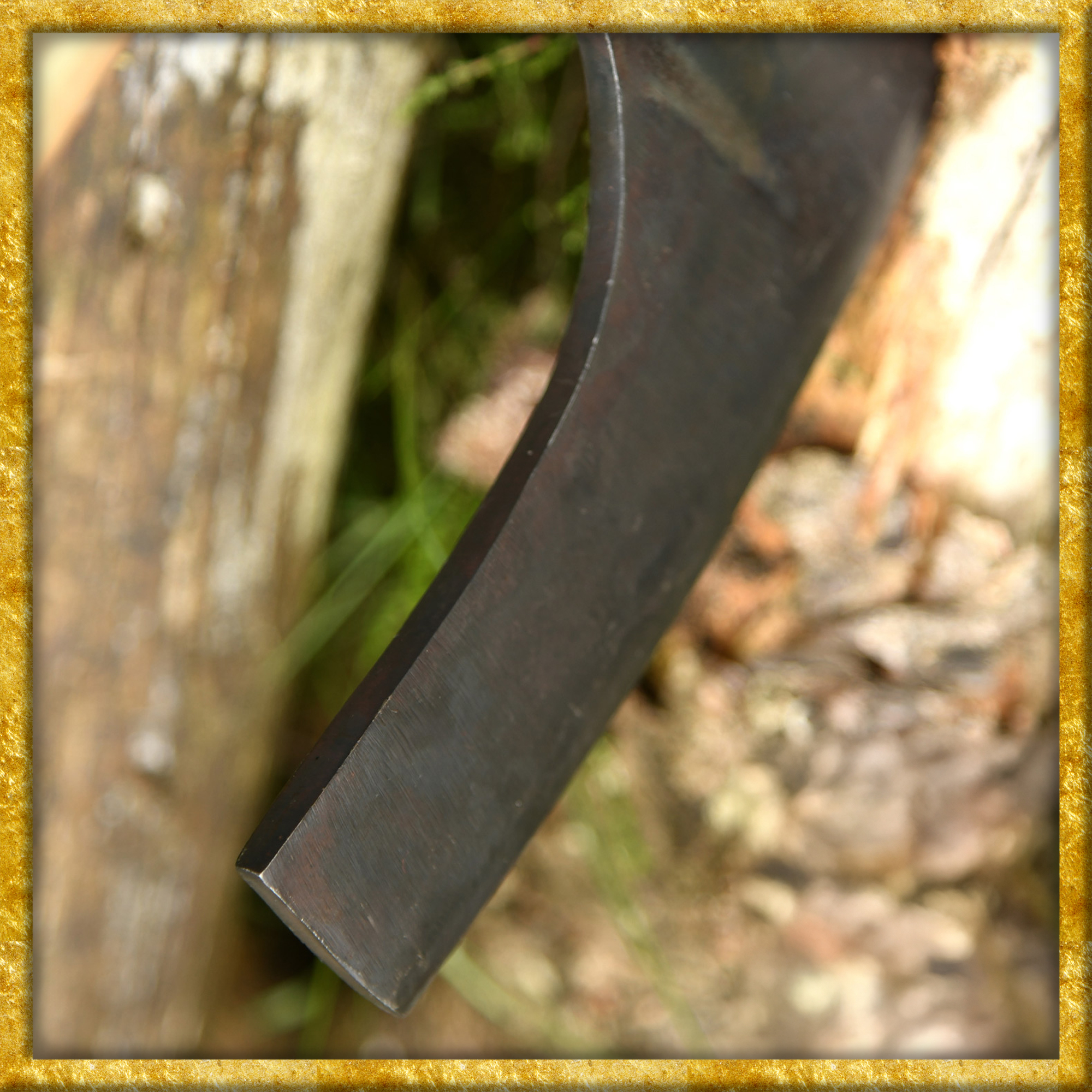 Diese Wikinger Bartaxt verfügt über eine handgeschmiedete, stumpfe Schneide aus Kohlenstoffstahl. Das charakteristische Blatt ist auf einem Schaft aus Eschenholz montiert. Es wurde bewusst unpoliert belassen. So verleiht die schwarze Zunderschicht der Wikingeraxt einen rustikalen, authentischen Charakter.