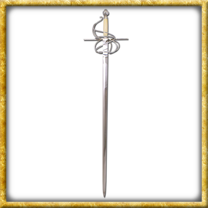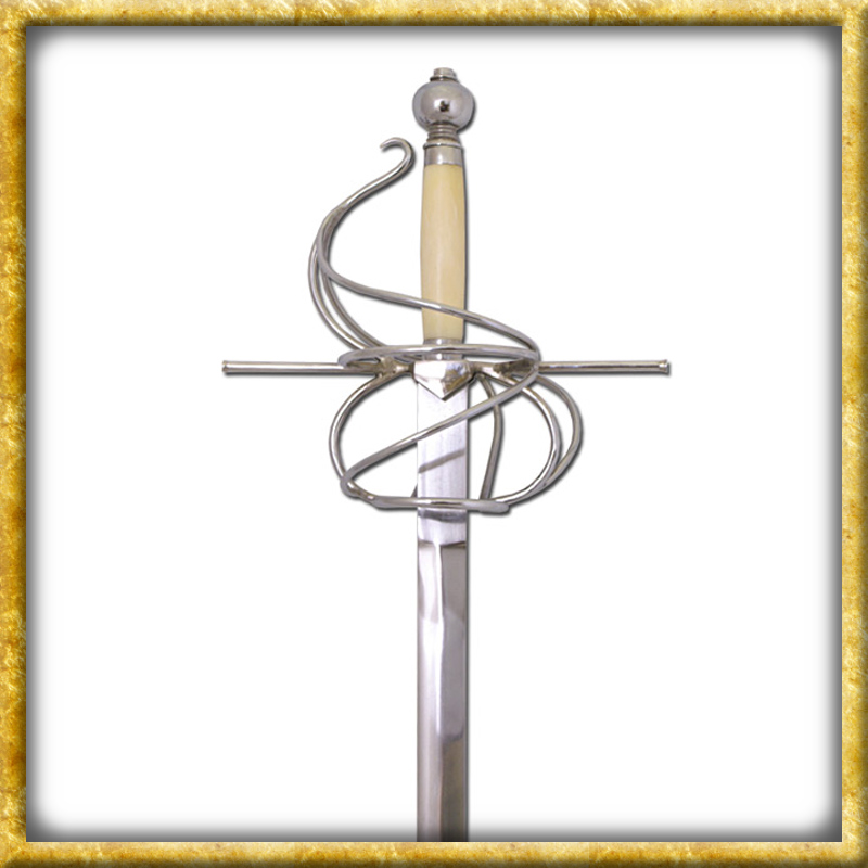 Sehr schöne Replik eines italienischen Rapiers mit geschwungenen Gehilz aus dem 16. Jahrhundert. Durch Änderung der Kampftechnik, wurden mit Ausgang des Mittelaters die Klingen länger und schmaler. So wurde das herkömmliche Schwert durch den eleganteren Rapier ersetzt.