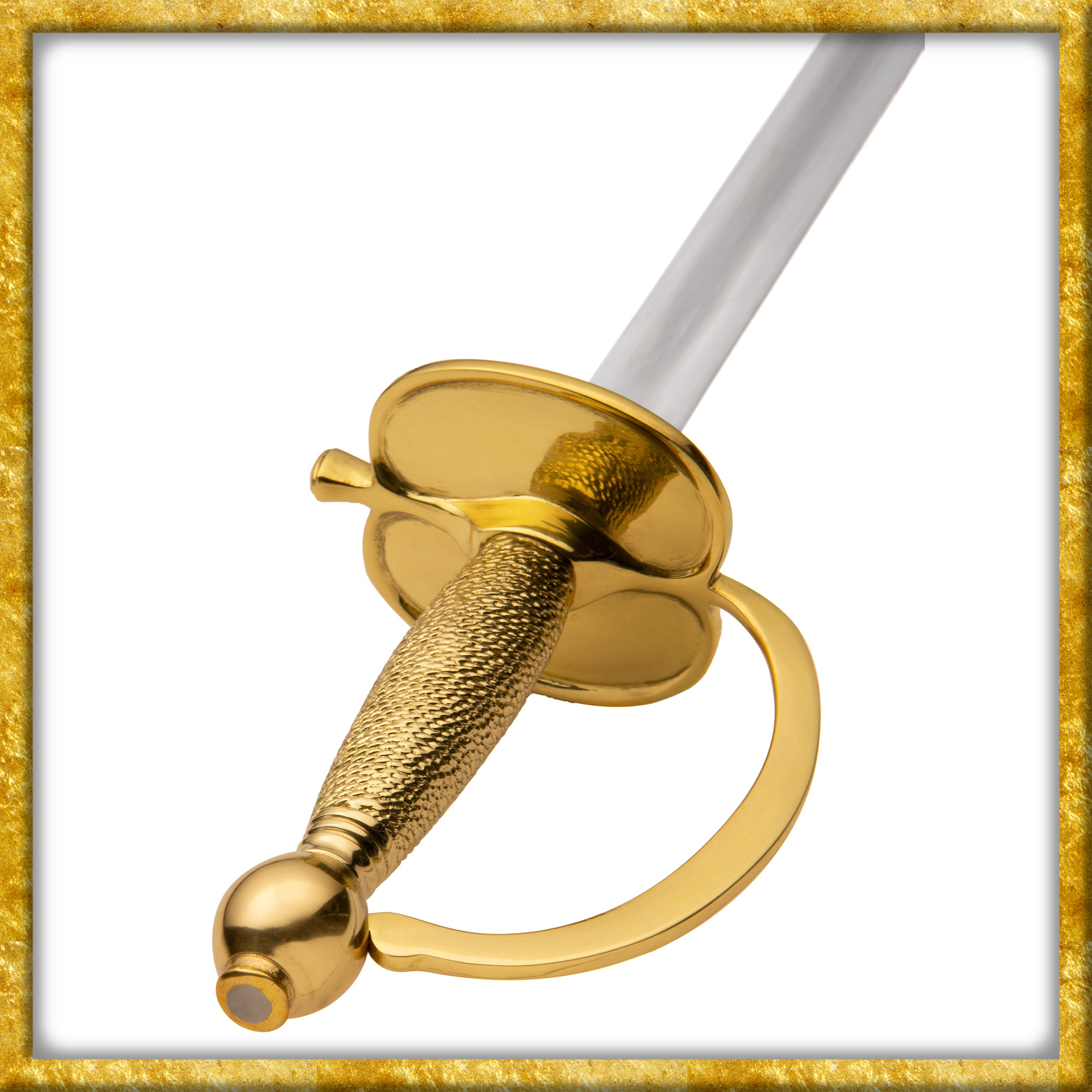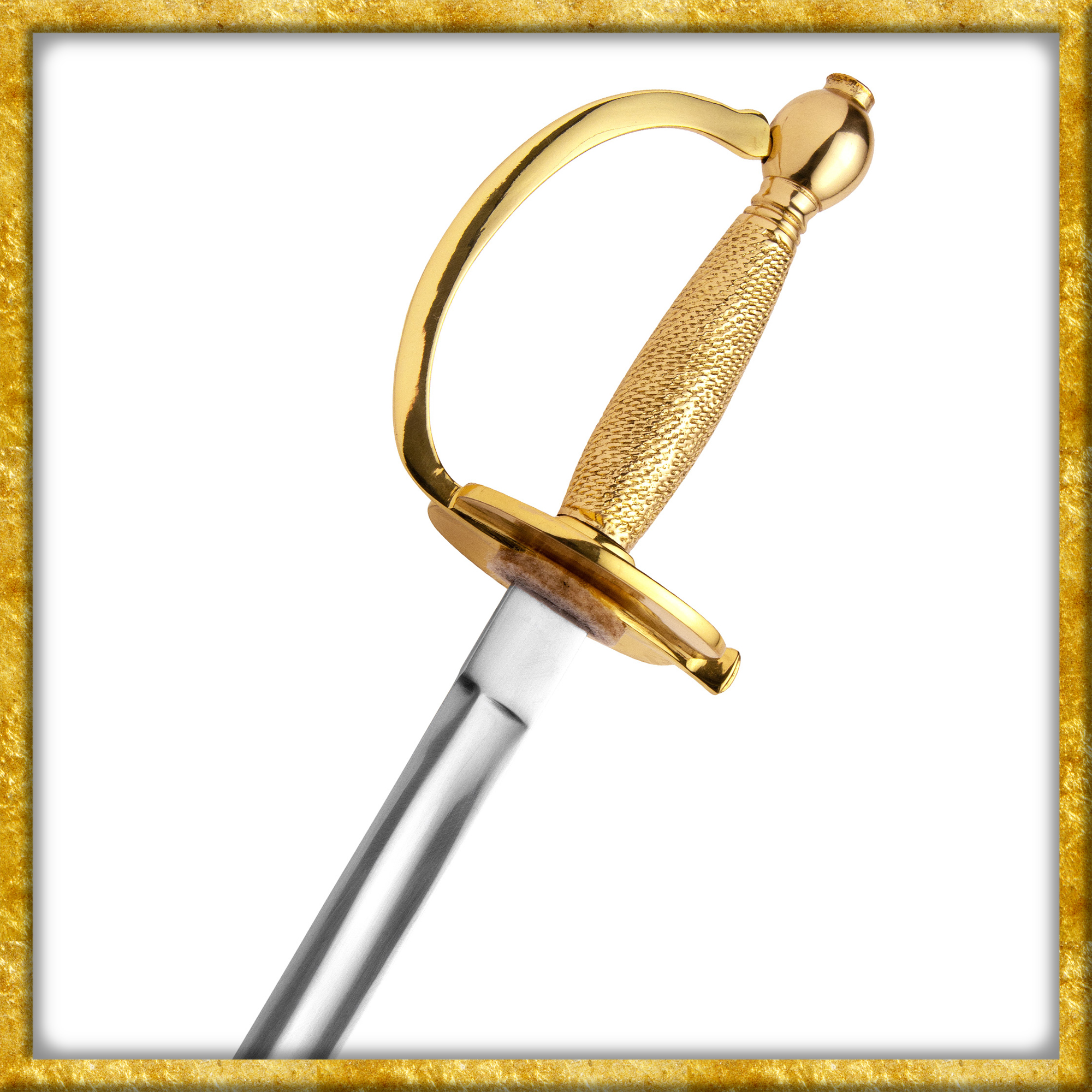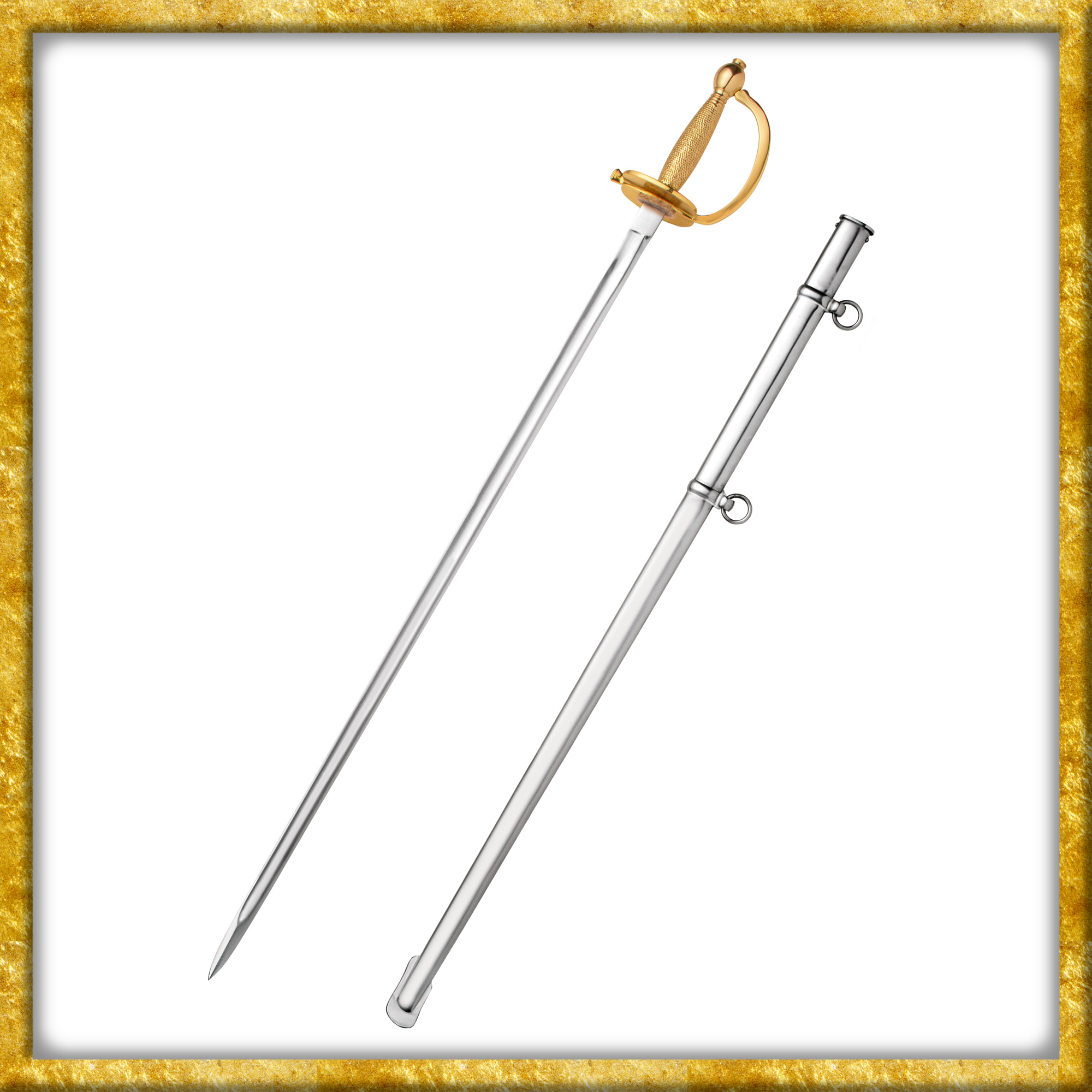 Dies ist eine wundervolle Replik eines US Unteroffiziersdegen Modell 1840. Der grösste Vorteil dieses eleganten Unteroffizierdegens ist das geringe Gewicht, was eine behände Führung der einschneidigen, schlanken Klinge ermöglicht. Diese Leichtigkeit wird von der breiten Hohlkehle begünstigt, die vom Ricasso bis fast zur Spitze verläuft. Der goldene Griff mit dem genieteten Knauf wird durch einen schlichten Bügel und einen nierenförmigen Stichschutz vervollständigt.