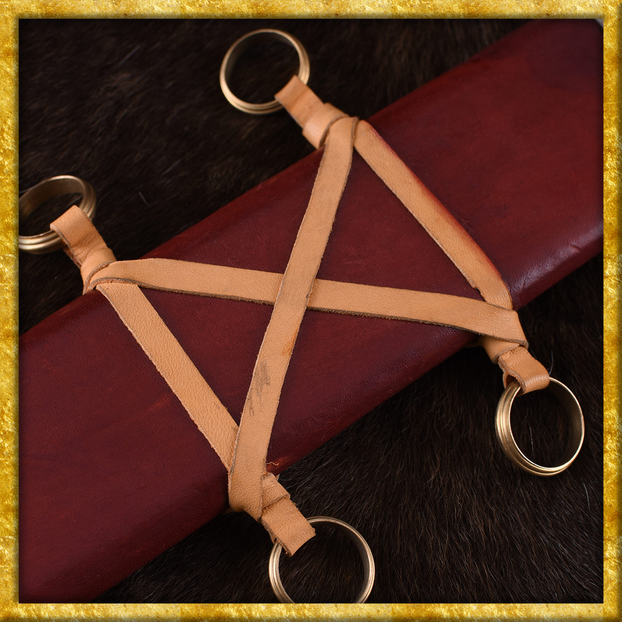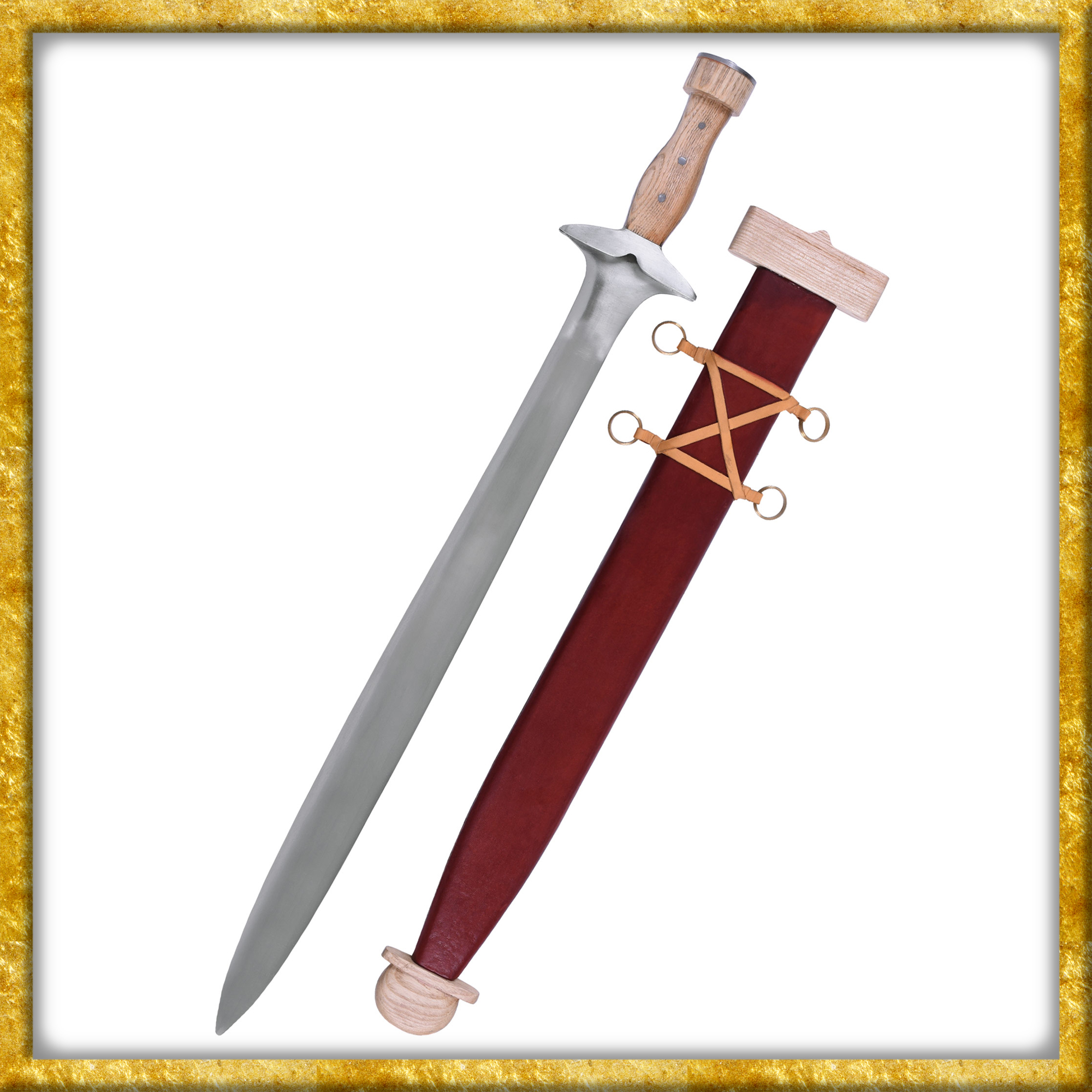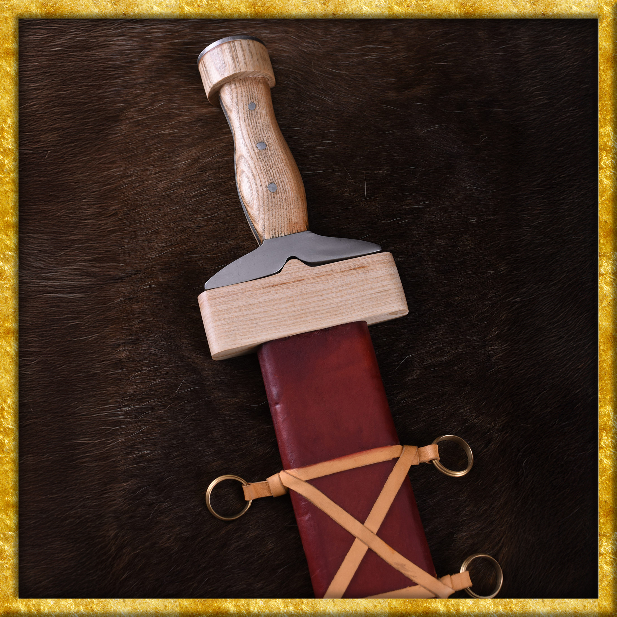 Der hier angebotene griechische Einhänder wird samt Holzscheide mit rotem Lederbezug geliefert. Mund- und Ortband sind in charakteristischer Form gestaltet und ebenfalls aus Holz gefertigt. Um es dem Träger zu ermöglichen, sein Xiphos wie ein echter griechischer Krieger an einem quer über die Schulter laufenden Gurt mitzuführen, sind Messingringe mittels Lederriemen an der Scheide befestigt.