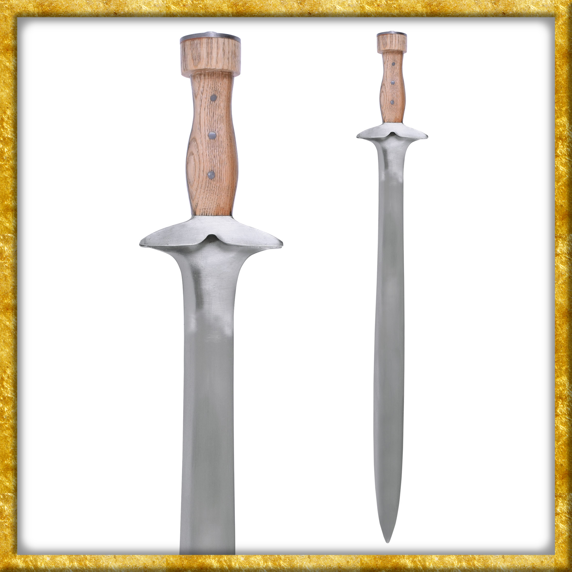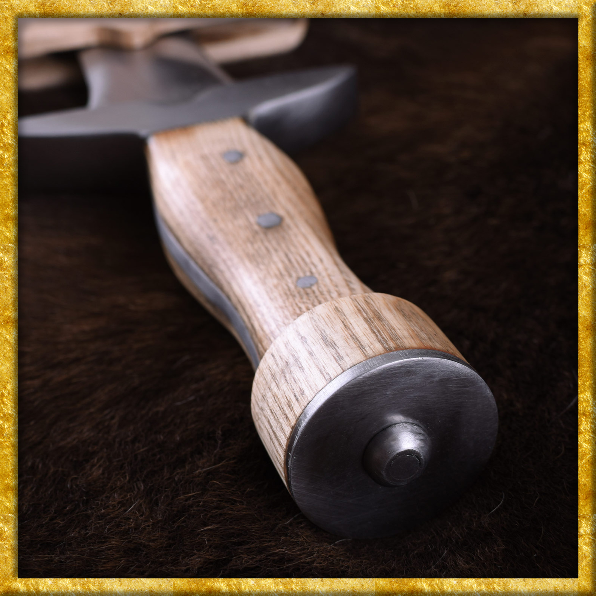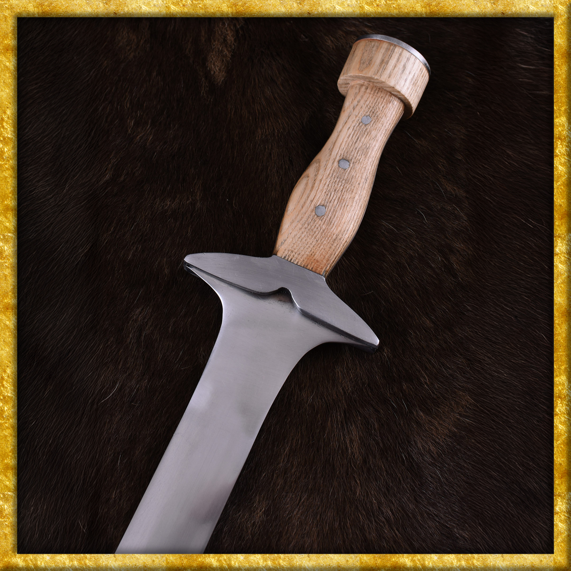 Die Schneiden sind nicht geschärft. Das authentisch geformte Heft besteht aus einem Knauf aus Holz mit Stahlkappe, einem Handschutz aus Stahl und einer Griffpartie mit dickem Stahlerl und vernieteten Holzschalen.