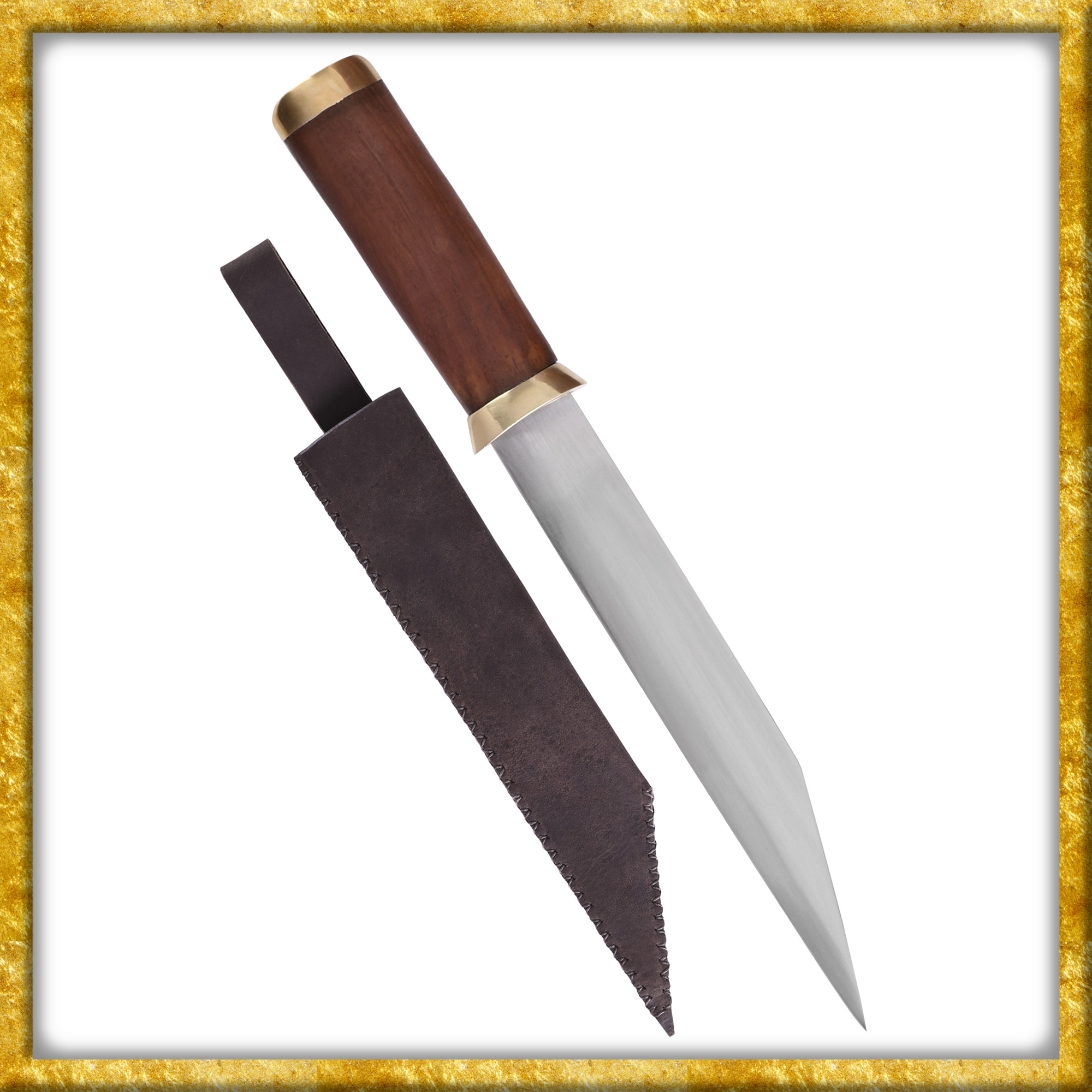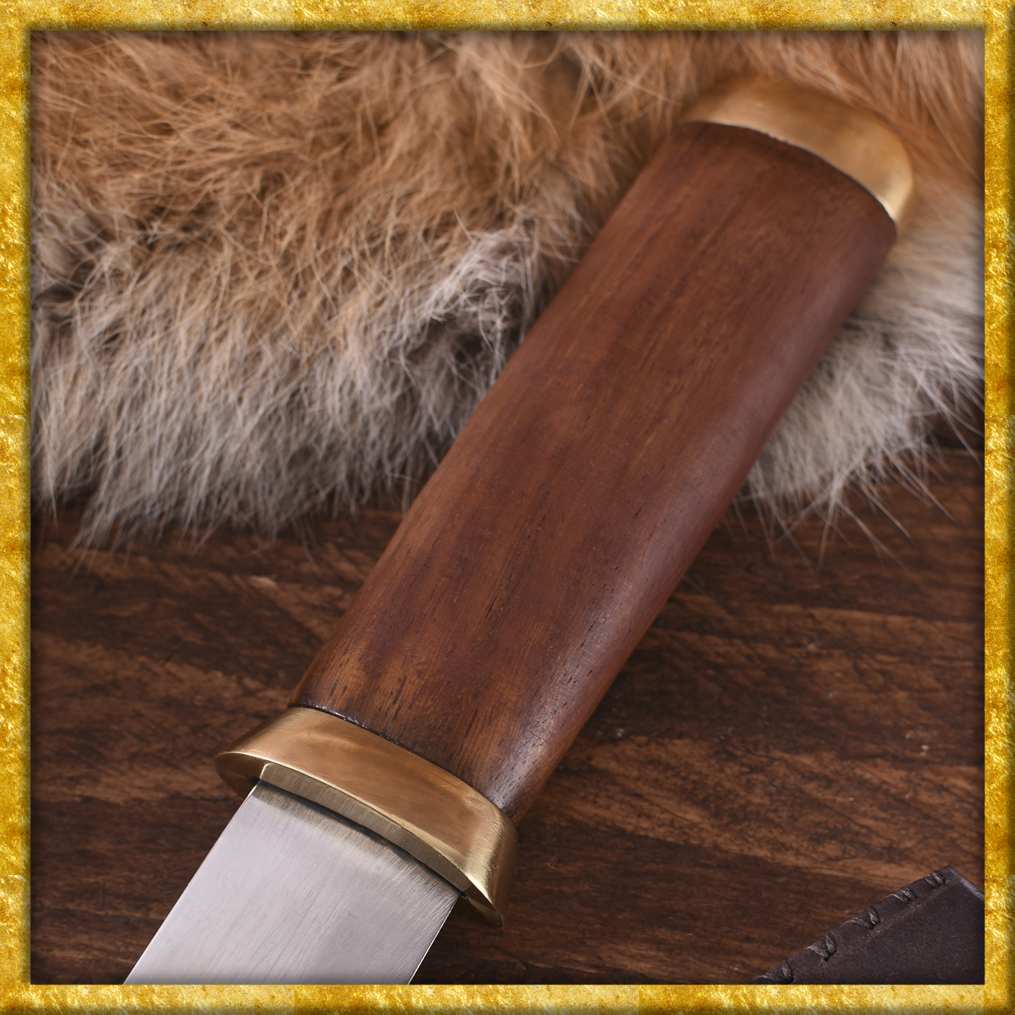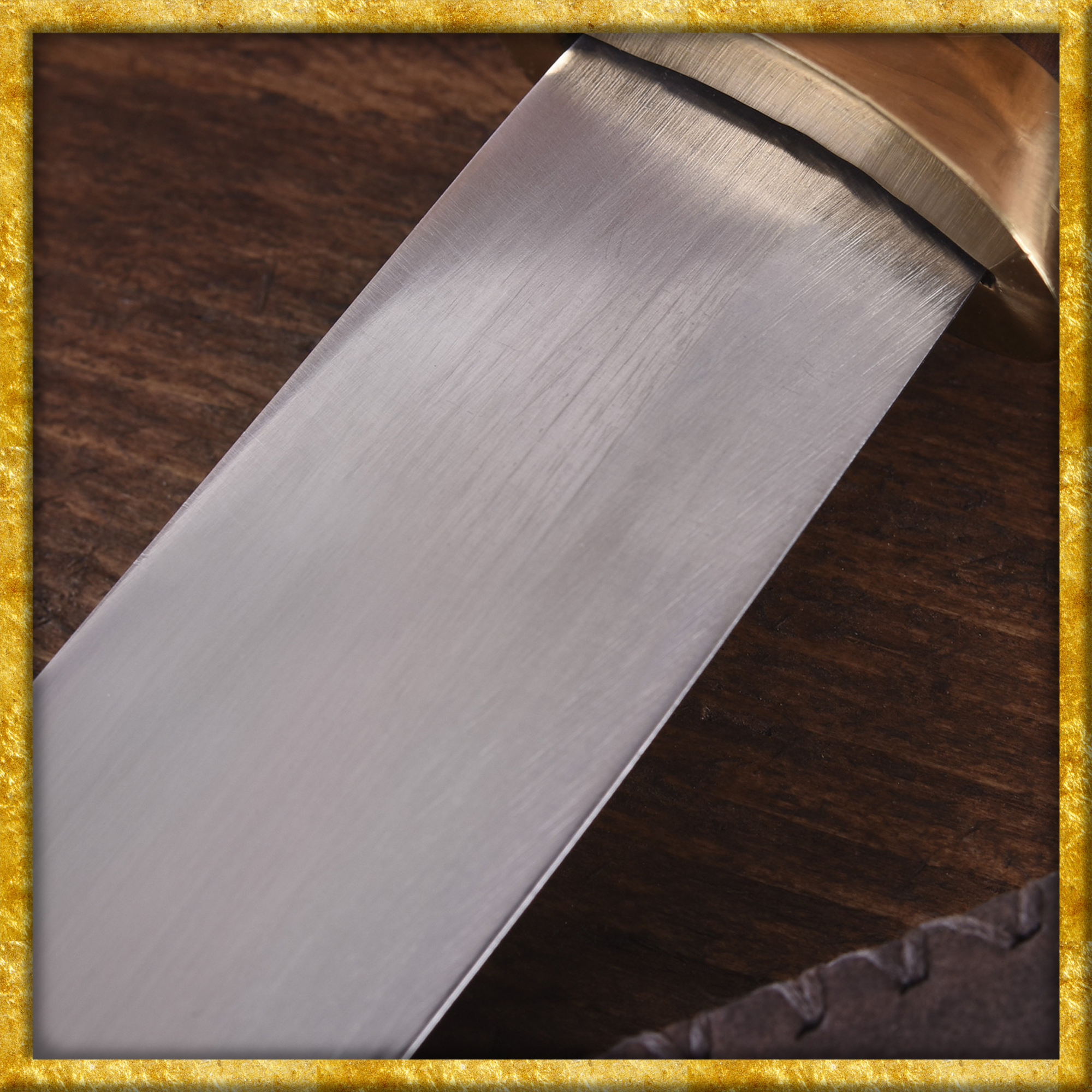 Diese Replik eines frühmittelalterlichen Kurzsaxes, wie es bei germanischen Stämmen beliebt war, verfügt über eine Klinge aus Karbonstahl. Der Sax ist ist handgeschmiedet, Parier und Knauf bestehen aus massivem Messing. Die Angel ist mit dem Knauf vernietet. Der Griff besteht aus Hartholz. Mitgeliefert wird eine passende Scheide mit einer 7cm breiten Schlaufe für die Befestigung an einem Gürtel.