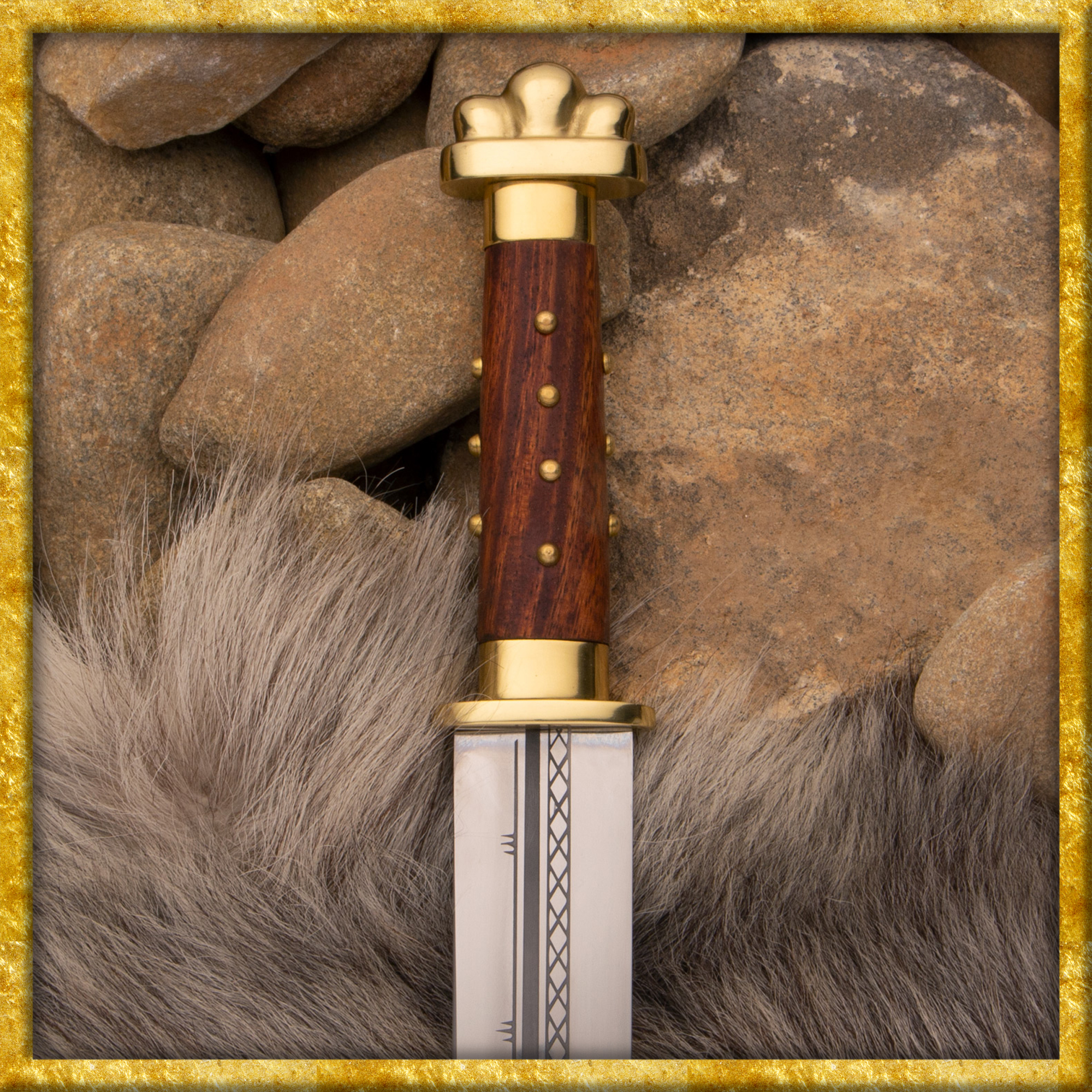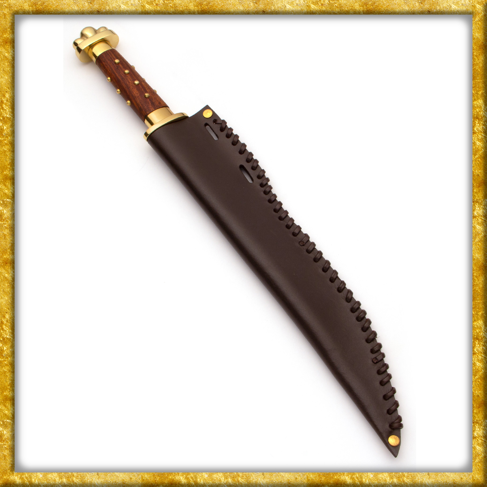 Dieser Kurzsax ist von Windlass Steelcrafts aus 1055 Kohlenstoffstahl geschmiedet. Er verfügt über einen gelappten Knauf und eine Parierstange aus Messing. Der hölzerne Griff ist mit Messingnägeln besetzt, um einen sicheren und komfortablen Halt zu gewährleisten.