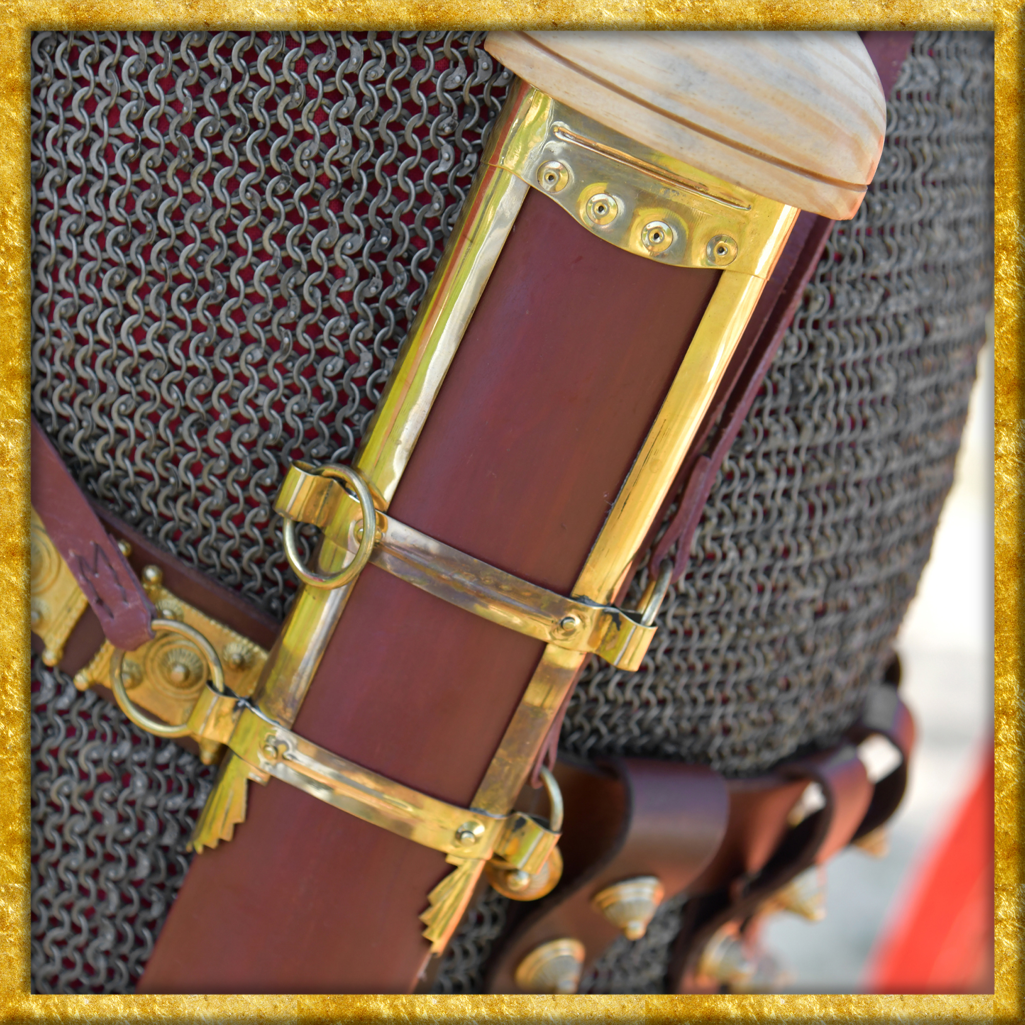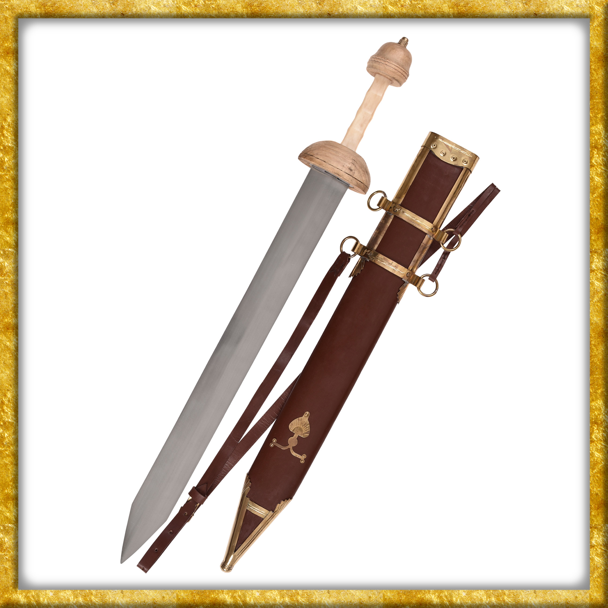 Dieser Gladius besitzt die typische Form eines römischen Gladius des 1. nachchristlichen Jahrhunderts. Die Klinge ist aus Kohlenstoffstahl handgeschmiedet. Knauf und Parier sind aus Holz geschnitzt bzw. gedrechselt. Der Griff ist aus Knochen gefertigt. Die Klinge ist nicht geschärft. Mitgeliefert wird eine schöne, mit rot-braunem Leder bezogene Holzscheide mit Messingapplikationen.